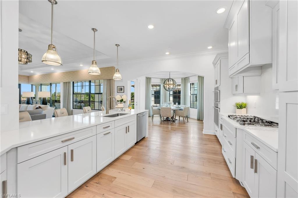Experience elevated living in this beautifully-appointed Viansa penthouse residence in Talis Park. Built in 2021, this 2,950 square foot residence offers 3 bedrooms plus a den/media room, 3 full baths, and one half bath, all accessible through a private elevator entry that opens into an expansive great room with soaring ceilings, generous millwork and incredible views of the lake and golf course. The gourmet kitchen is a centerpiece of the home, featuring Monogram appliances, extended quartz countertops, a custom tile backsplash, and bespoke wood cabinetry with abundant storage. Just off the kitchen, a dedicated bar area with a double wine cooler and matching quartz surfaces provides the perfect setting for entertaining. The dining and living areas flow seamlessly, enhanced by oak wood flooring, a bespoke built-in media storage, and custom wine cabinetry, opening onto an oversized lanai with northern exposure and spectacular views over the golf course. The primary suite offers generous proportions, a large, custom walk-in closet, and a luxurious bathroom with quartz countertop double vanities, a soaking tub, and a huge, walk-in shower. Two spacious guest suites, each with en-suite baths and oak floors, provide so privacy and comfort, that your guests will not want to leave! A separate office/media room opens to a second screened patio. The laundry room combines practicality and style with custom cabinetry, quartz countertops, a large drop-in sink, and under-cabinet lighting, offering abundant workspace and storage for everyday convenience. Additional highlights include custom Lutron automated shades, smart light switches, and two parking spaces with golf cart space and a secure storage room. Residents of Talis Park enjoy an unparalleled lifestyle defined by its award-winning Vyne House clubhouse, featuring multiple dining venues, a Core Fitness Center, and the Esprit Spa. The community also offers five Har-Tru clay tennis courts, four pickleball courts, bocce courts, a lap pool, resort-style pool, dog parks, a tot lot park, walking and biking paths, and a vibrant lifestyle. A variety of social and wellness programs throughout the year create a vibrant, connected atmosphere that complements the tranquility of Viansa’s golf course setting. Welcome home to Talis Park – where your dream lifestyle awaits.