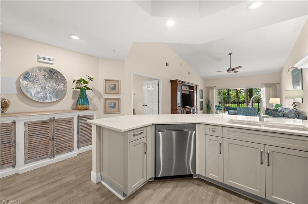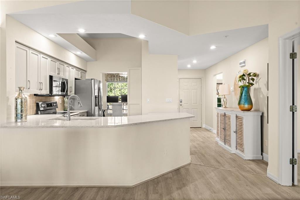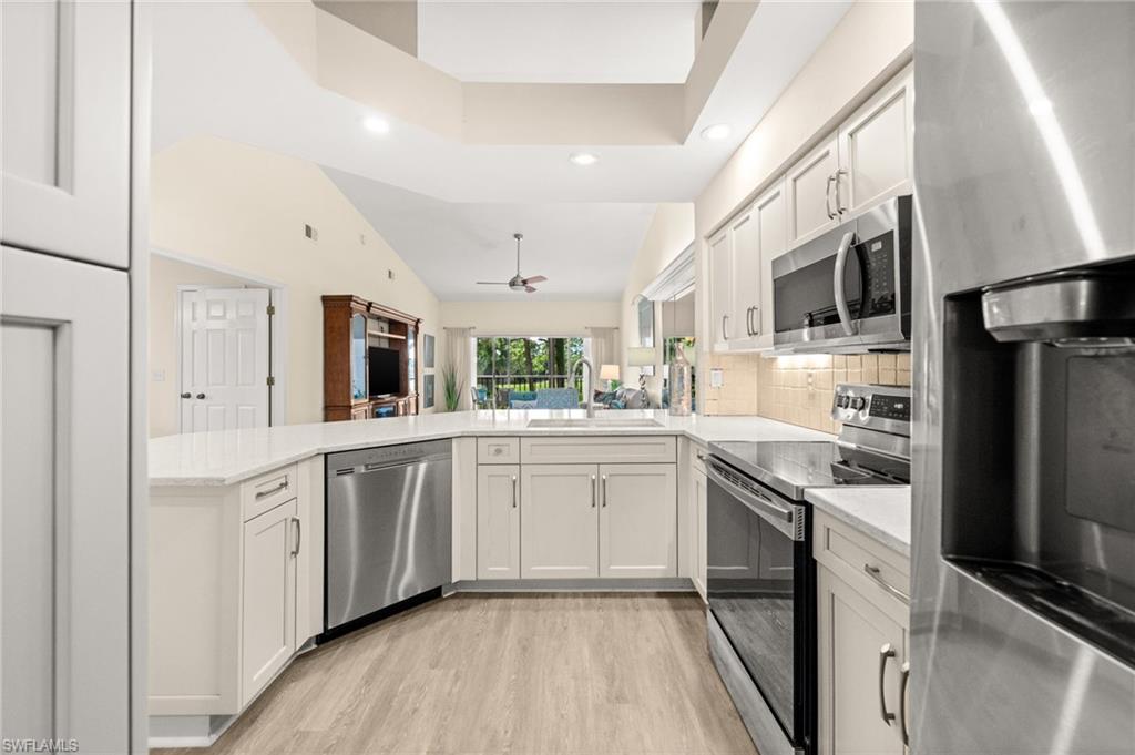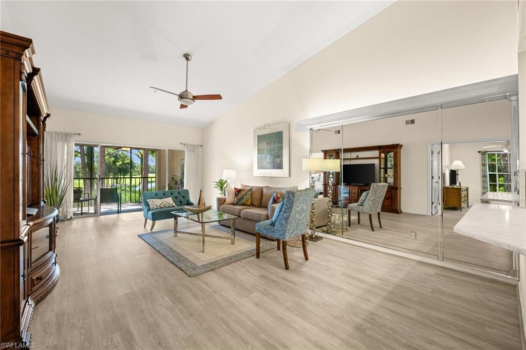 Welcome to 4101 Sawgrass Point Drive #201, a luxuriously renovated end-unit residence with third bedroom plus flexible breakfast room/office, and breathtaking lake and golf views. Passing through the sun-kissed courtyard and parting the front door, one is immediately welcomed by soaring vaulted ceilings and a degree of natural lighting only a second-floor end-unit could provide. The central open kitchen unifies and elevates surrounding living spaces, featuring quartz countertops, crisp shaker cabinetry, and stainless steel appliances. Warm-toned wood-look flooring stretches wall-to-wall, a market favorite, while primary suite showcases freshly updated shower and quartz countertops, and guest suite has a new vanity of its own. This versatile floor plan includes both a flexible breakfast room and separate third bedroom/bonus room that can be reconfigured to suit one’s needs, spaces that we’ve seen used as extra bedrooms, studios, dining rooms, bunk rooms, offices, and home gyms. Perhaps most noteworthy of all is the view: tucked among the treetops, unparallelled panoramic views spanning two signature holes of golf, multiple bodies of water, and a whole host of wildlife and native entertainment. This is one of the single most mesmerizing views of any condo we’ve had the privilege of visiting in Pelican Landing, and the photos do not do it justice—must see in person. No special flood zone; no history of flooding; electric roll-down hurricane protection on lanai for peace of mind. In addition to Sawgrass Point's resort style pool and spa, Pelican Landing residents enjoy world-class amenities, including a 34-acre private island beach club, gulf access sailing, kayaking, and boat ramp, 12 Har-Tru tennis courts, pickleball, bocce, and a fitness center. This home is conveniently located within walking or biking distance to the community center, grocery store, pharmacy, and numerous casual and fine dining options. Additionally, optional memberships are available at The Nest Golf Club, featuring 36 holes of championship golf and a newly renovated clubhouse. Waitlists due to high demand at The Nest may apply. Schedule your private showing today!