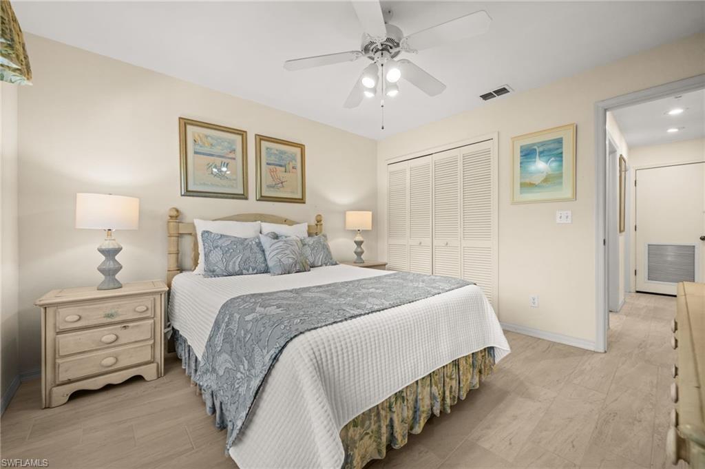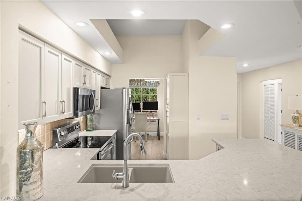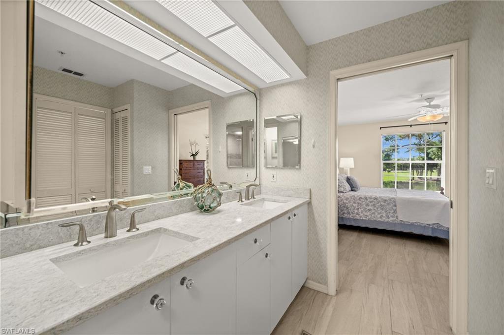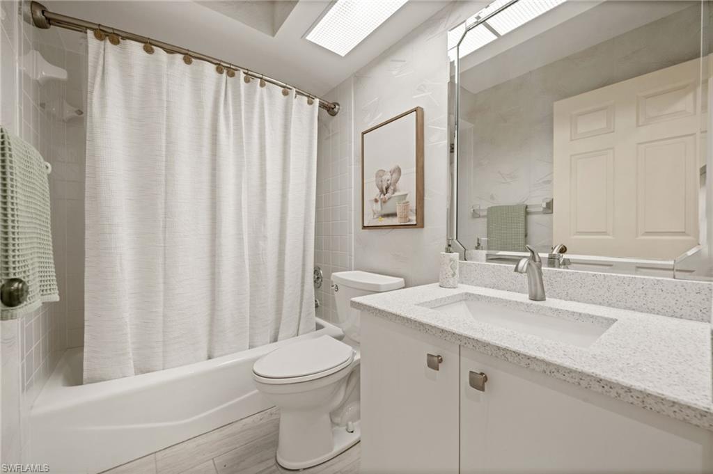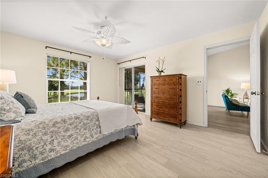 Welcome to 4101 Sawgrass Point Drive #201, a luxuriously renovated end-unit residence with third bedroom plus flexible breakfast room/office, and breathtaking lake and golf views. Passing through the sun-kissed courtyard and parting the front door, one is immediately welcomed by soaring vaulted ceilings and a degree of natural lighting only a second-floor end-unit could provide. The central open kitchen unifies and elevates surrounding living spaces, featuring quartz countertops, crisp shaker cabinetry, and stainless steel appliances. Warm-toned wood-look flooring stretches wall-to-wall, a market favorite, while primary suite showcases freshly updated shower and quartz countertops, and guest suite has a new vanity of its own. This versatile floor plan includes both a flexible breakfast room and separate third bedroom/bonus room that can be reconfigured to suit one’s needs, spaces that we’ve seen used as extra bedrooms, studios, dining rooms, bunk rooms, offices, and home gyms. Perhaps most noteworthy of all is the view: tucked among the treetops, unparallelled panoramic views spanning two signature holes of golf, multiple bodies of water, and a whole host of wildlife and native entertainment. This is one of the single most mesmerizing views of any condo we’ve had the privilege of visiting in Pelican Landing, and the photos do not do it justice—must see in person. No special flood zone; no history of flooding; electric roll-down hurricane protection on lanai for peace of mind. In addition to Sawgrass Point's resort style pool and spa, Pelican Landing residents enjoy world-class amenities, including a 34-acre private island beach club, gulf access sailing, kayaking, and boat ramp, 12 Har-Tru tennis courts, pickleball, bocce, and a fitness center. This home is conveniently located within walking or biking distance to the community center, grocery store, pharmacy, and numerous casual and fine dining options. Additionally, optional memberships are available at The Nest Golf Club, featuring 36 holes of championship golf and a newly renovated clubhouse. Waitlists due to high demand at The Nest may apply. Schedule your private showing today!