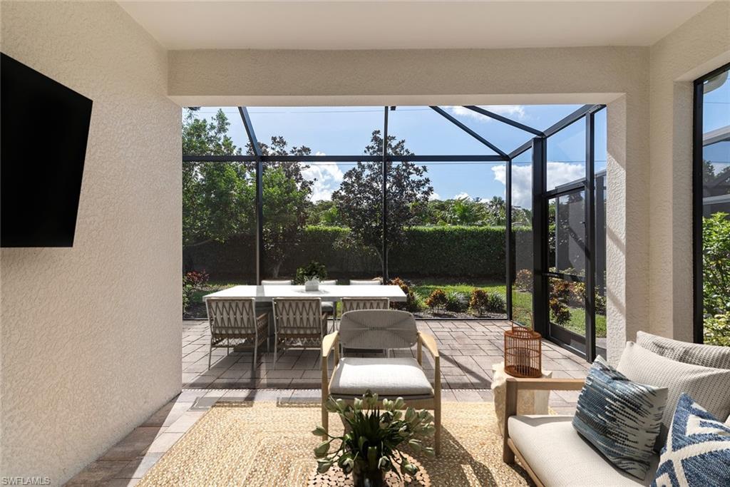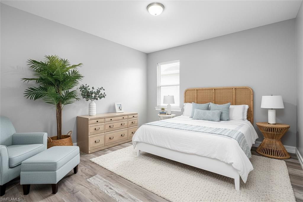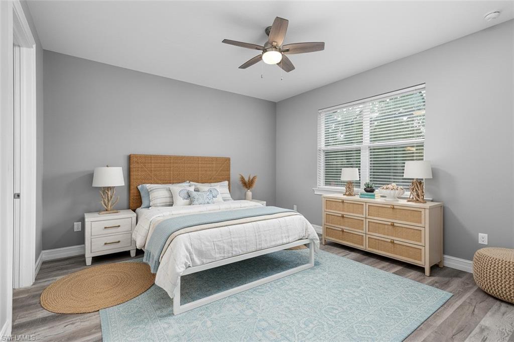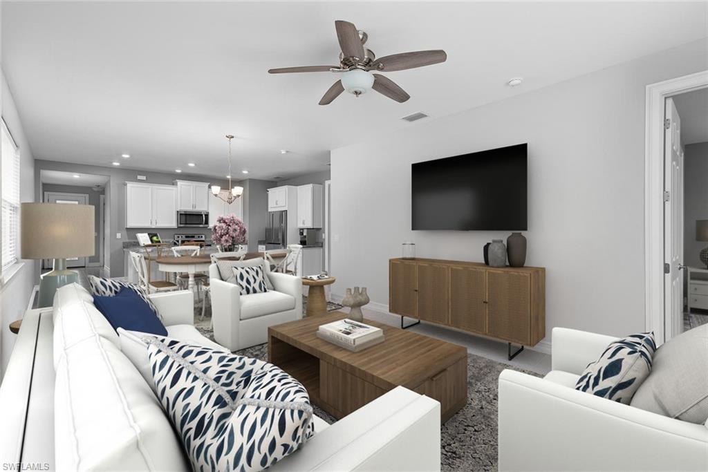 This Jennings floor plan in the heart of Bonita Springs offers wonderful balance of luxury and convenience at an attractive price point. The home greets you with a spacious foyer leading into an open- concept design that connects the gourmet kitchen to the main living spaces, perfect for both entertaining and daily living. Key features of the kitchen include state of the art appliances, a quartz countertop, and a large walk- in pantry. The owners suite serves as a personal retreat, with expansive windows for natural light and an en- suite bathroom with a modern walk in shower. The outdoor space continues the theme of relaxation and private back yard. Throughout the home LVT panel flooring is used with tile in the wet area, and ceiling fans are installed in each room for added comfort. Residents in this gated community enjoy low HOA fees and access to an array of resort-style amenities, including a walk-in pool, spa, clubhouse, and a sandy beach area. Sports facilities include pickleball and tennis courts, with bocce ball courts and bike paths for a more relaxed pace. Its location offers privacy and convenience, with close proximity to shopping, golf courses , I 75 and an International airport, making everyday feel like a vacation. Virtual staging has been used but the furnishings in the home do come with home. This home has been virtually staged. The furniture in the garage can go with the house if wanted.