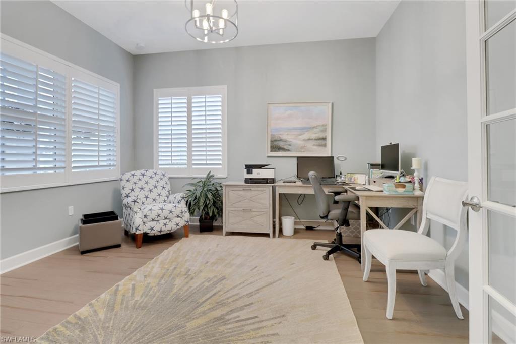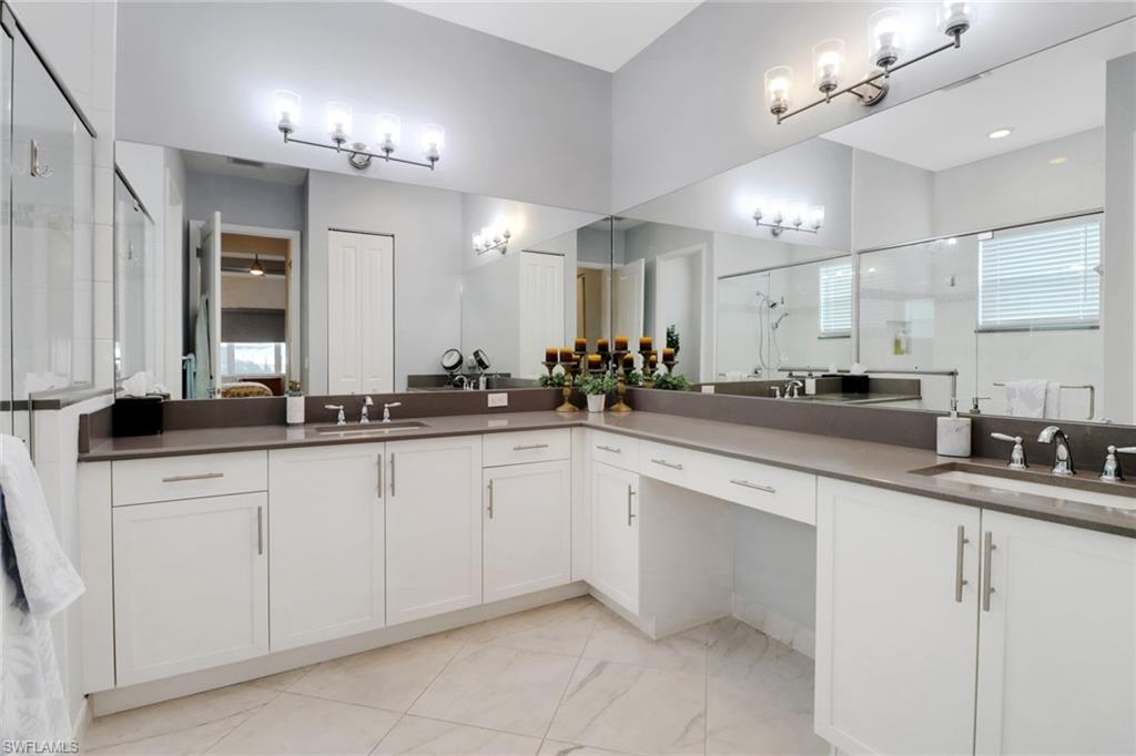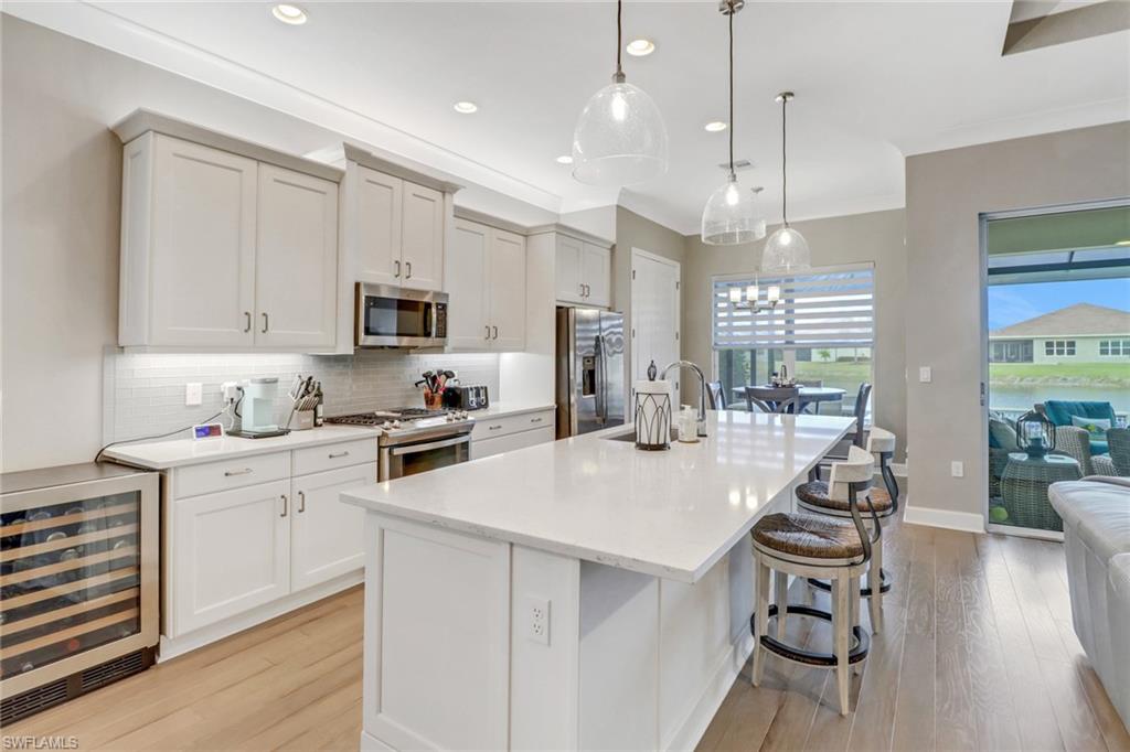 One of the most spectacular long lake views in the active adult community of Valencia Bonita. This home features 3 bedrooms, den and 2 and 1/2 baths. So many upgrades. Crown molding, upgraded painting, dry bar, custom closets in the master bedroom. Upgraded cabinet lighting along with upgraded countertops in the kitchen and baths. In the past 2 years the refrigerator, washer and dryer have been upgraded. New carpet in 2024 in all the bedrooms. The front exterior has a screened in entry area along with professional landscaping and lighting. The heated pool boasts a picture frame screen to enhance your lake view. Electric hurricane shutters allows for lanai furniture to remain outside during a storm, while keeping the rain out. In the garage, there is a water filtration unit and a mini split to keep the garage at a comfortable temperature. A whole house generator offers peace of mind. Valencia Bonita is close to the beaches, grocery stores and other shopping. 25 minute ride to the airport. The community has a life style director for a variety of fun and entertaining events that are held in the 45,000 sq ft clubhouse. This 55+ community has 3 pools, pickleball courts, tennis courts and bocce. A very desirable feature is the on site dining and bar.