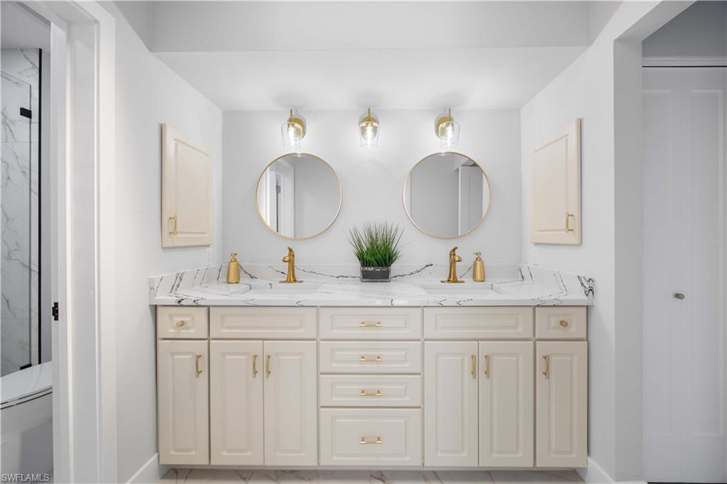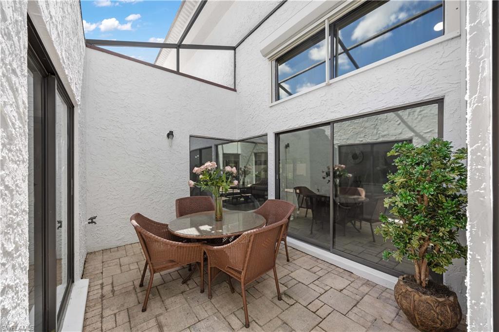 Welcome to Tierra Mar at Pelican Bay, an exclusive enclave of villas surrounded by lush, Mediterranean-inspired landscaping. This beautifully renovated 3 bedroom, 2.5 bath pool home with a 2-car garage offers an upscale, move-in-ready lifestyle with all furniture included. A private gated front and side patio create a welcoming entry. Inside, the home opens to views of the sparkling pool through wall-to-wall sliders in both the dining room and great room. Custom ceiling beams, vaulted ceilings, designer lighting, and porcelain tile flooring throughout create a sophisticated and cohesive look. The spacious kitchen features custom white cabinetry, a large quartz island and breakfast bar, stainless steel appliances, a stylish backsplash, a built-in desk, and a bar area with a wine and beverage refrigerator. The adjoining family room offers a cozy retreat with a fireplace and custom built-ins. The primary bedroom overlooks the pool and includes slider access to the lanai, a generous walk-in closet, and a beautifully updated bathroom with dual sinks, a soaking tub, and a custom-tiled shower with pebble flooring and glass doors. Two guest bedrooms are connected by a Jack and Jill bathroom with dual sinks and a custom-tiled shower. One guest room includes a built-in desk and shelving. A renovated powder room and a separate laundry room with a new utility sink and additional storage complete the interior space. An open atrium off the dining room provides a flexible area perfect for a reading nook, zen garden, or additional seating. Outside, the southern-exposure pool area offers privacy within a screened lanai—one of the few grandfathered screened lanais permitted in Tierra Mar. Ideally located near Artis–Naples, Waterside Shops, and Venetian Village, this home also includes full access to Pelican Bay’s unmatched amenities, including private beachfront restaurants, tram service to the beach with chairs and umbrellas provided, a world-class fitness center, tennis, and miles of walking paths. This beautifully remodeled villa in Tierra Mar offers the perfect combination of luxury, comfort, and convenience—ready for you to move in and enjoy.