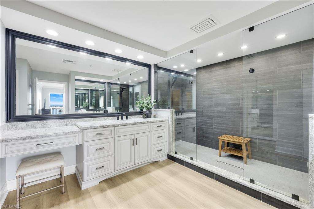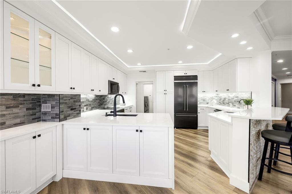 Stunning views and exceptional lifestyle await in Vistas #1103, a beautifully maintained and recently reimagined residence in one of Bonita Bay's signature high rise communities. With over $200,000.00 in upgrades, you will feel like you are living in a resort every day! Upgrades include a newly resigned open-concept kitchen, waterfall quartz countertops, crown molding with accent lighting both on ceiling and undercabinet, reverse osmosis water system, new flooring through entire unit (no carpet), and updated bathrooms. With over 2500 square feet of living space and three bedrooms (one is used as an office), there is plenty of flexible space to make this your own special home. What truly sets this residence apart are the three outdoor lanais (one large screened and two unscreened off the bedrooms) lending themselves to watching beautiful morning sunrises and sunsets. The Vistas offers on-site management, two guest suites, social room, gorgeous pool and spa, fitness center and recently refreshed common areas. Set within the award-winning Bonita Bay, residents enjoy 12+ miles of trails, 3 parks, kayak launch, full-service marina with dry-dock storage and a private two-story Gulf-front beach park with shuttle service. Membership to the award-winning Bonita Bay Club is optional, providing access to five world-class golf courses, tennis, pickleball, croquet, luxury spa and fitness, and multiple dining venues. This is move-in ready luxury with unmatched amenities-this is the Southwest Florida lifestyle at its best.