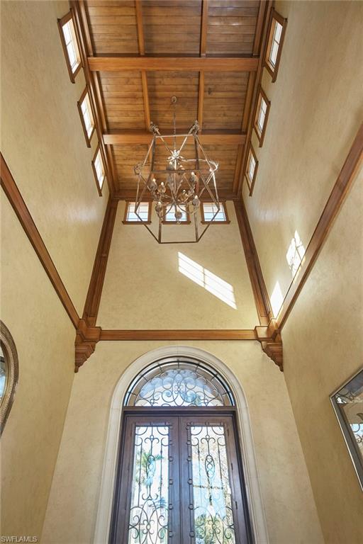 Enter inside this elegant custom estate home in the heart of the prestigious Grey Oaks Country Club, where soaring ceilings, exquisite millwork and designer finishes define every detail. Handcrafted in 2007, this residence offers over 5,000 square feet of elegant living space, including four bedrooms plus a private study and impact-resistant doors and windows. The home’s timeless exterior showcases intricate precast stone detailing, three distinctive cupolas, and a stately metal double-door entry leading into a dramatic two-story foyer with a spectacular wood ceiling. The grand living room impresses with 16-foot ceilings, a natural gas fireplace framed in precast stone, and a stunning wood-inlay ceiling, all highlighted by floor-to-ceiling windows framing views of the tropical outdoor living area and the 13th hole of the acclaimed Pine Course. The chef’s kitchen features a six-burner Dacor gas cooktop, Sub-Zero refrigerator, and an adjacent butler’s pantry complete with an icemaker and wine cooler. Flowing seamlessly into the warm, inviting family room, the space is enhanced by a herringbone-pattern wood ceiling and opens fully through 90-degree pocketing sliders to the covered lanai. Privately tucked away in its wing, the owner’s suite offers a serene retreat with French doors overlooking the pool and lush golf course. The suite is designed around a central foyer with a breakfast bar, surrounded by dual baths and custom closets, a layout reminiscent of a luxury resort suite. Outside, enjoy the breathtaking tropical pool area with stately fountain and raised spa plus an outdoor kitchen with bar and grill, ideal for entertaining family and friends in the mild Naples winter climate. A world of luxury awaits you in award-winning Grey Oaks Country Club offering three distinct championship golf courses, a resort-style pool and bar, over 11,000 square feet of fitness facilities and an active social calendar, all just minutes from fine dining, shopping and beaches of Old Naples.
