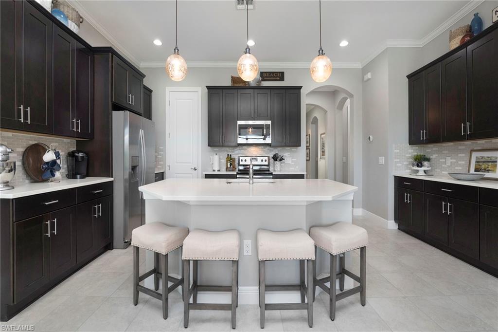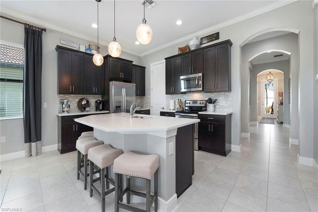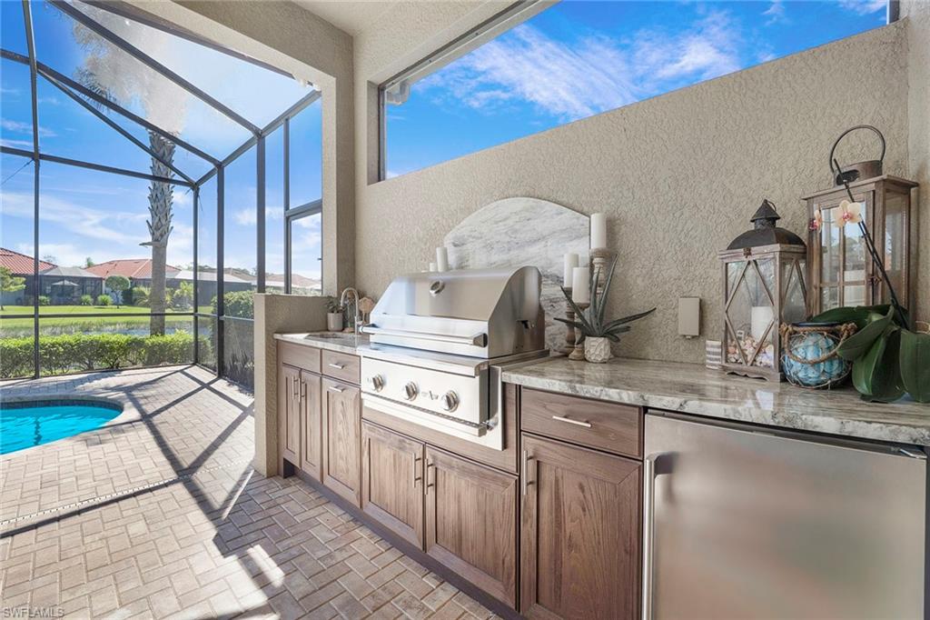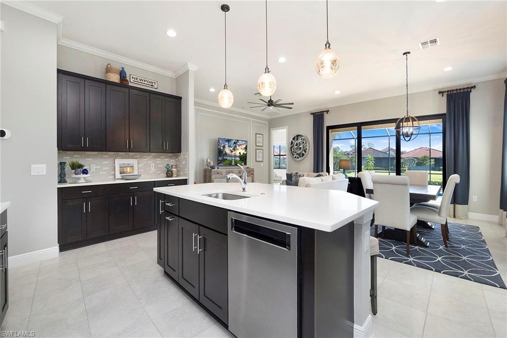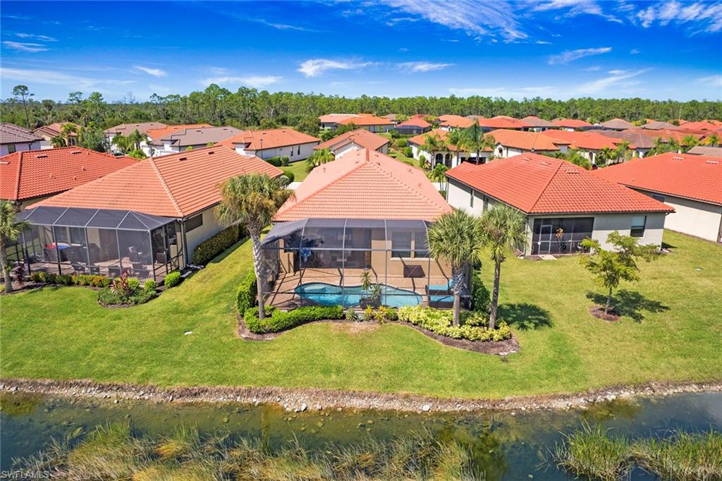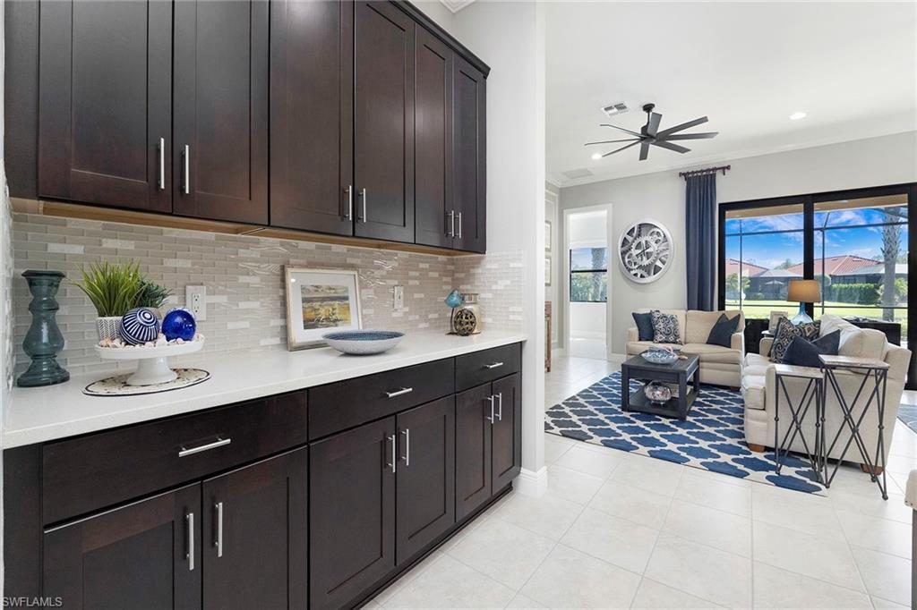 Furnished. Impeccable and highly sought-after yet rarely available Key Largo model by renowned WCI, professionally decorated and offered fully furnished and beautifully appointed. On an oversized pie-shaped lot that offers exceptional privacy and additional lawn space. Stylish upgrades include crown molding, custom decorative trim and accent molding, upgraded baseboard molding, elegant window treatments, and impact-resistant windows. The gorgeous kitchen showcases Merillat maple cabinetry with 42-inch uppers, upgraded soft-close doors and drawers, quartz countertops, an oversized counter-height breakfast island, Pottery Barn pendant lighting, custom glass tile backsplash and large walk-in pantry. Enjoy the outdoor summer kitchen featuring a stainless steel gas grill, refrigerator, sink, granite countertop and backsplash, and storage cabinetry. The expansive and luxurious primary suite offers serene long-lake and preserve views and a spa-inspired main bath with dual-sink quartz vanity, frameless Euro-glass shower, private water closet and spacious walk-in closet. Two generously sized guest suites, each with a private en-suite full bath, ensure comfort and privacy. The stylish great room and dining area overlook the water and preserve, while the mudroom drop zone adds everyday convenience. A large laundry room includes abundant cabinetry and a utility sink. Additional features and upgrades include 8-foot interior doors, 10-foot ceilings, Listello accent tile in all baths, ceiling fans throughout, recessed lighting with Lutron remotes, timers on bath fans, Ring doorbell and floodlights, HVAC UV air purifier and condensate pump, and flat screen TV wall pre-prep in all bedrooms, great room and den. Also, a Taexx in-wall pest control tube system. The pristine garage features a professional epoxy floor, slat wall system, storage cabinets and a large hanging storage shelf. Artesia is one of Naples sought-after upscale gated communities, known for its luxurious amenities and active lifestyle. The definition of peaceful living, Artesia is along the southern and western edges of Rookery Bay, a protected national estuarine reserve, where the community enjoys a rare kind of serenity surrounded by peaceful nature. Just minutes from beaches of Naples and Marco Island, Artesia offers a boutique setting where natural beauty and convenience meet. Residents enjoy access to an impressive array of amenities. The modern clubhouse hosts lively community social events and features a resort-style pool, three pickleball courts, two bocce ball courts, billiards, fully equipped gym and movie theater. Residents also enjoy exercise and craft classes, as well as beautiful lakeside walking path and dog parks. Short drive from downtown Naples and Marco Island, this home offers the best of both worlds like a peaceful, luxurious community and proximity to vibrant local attractions. HOA fee includes cable/internet. No CDD fee. Click link for 3D tour and floor plan.