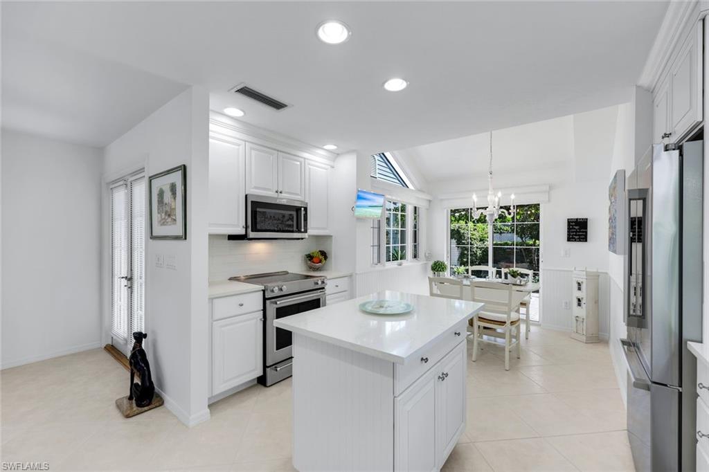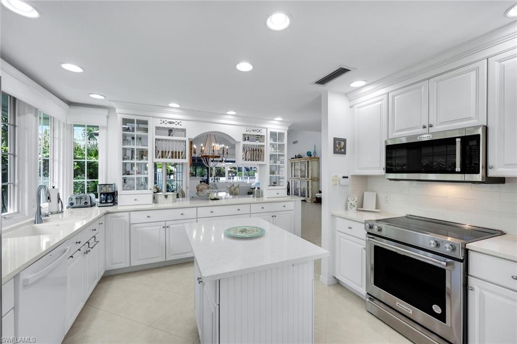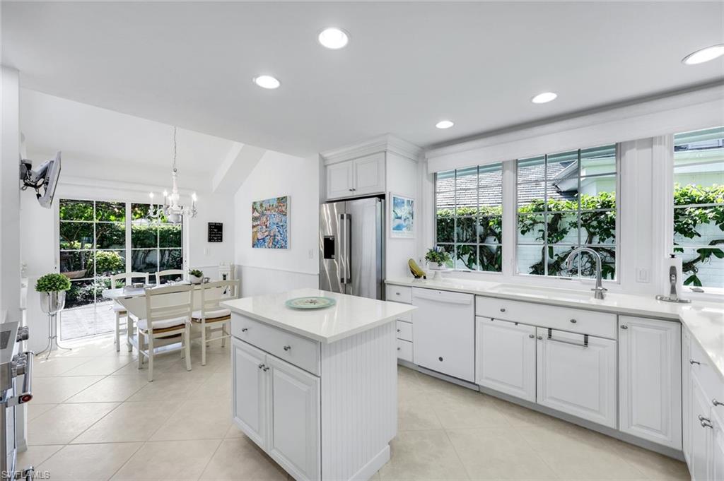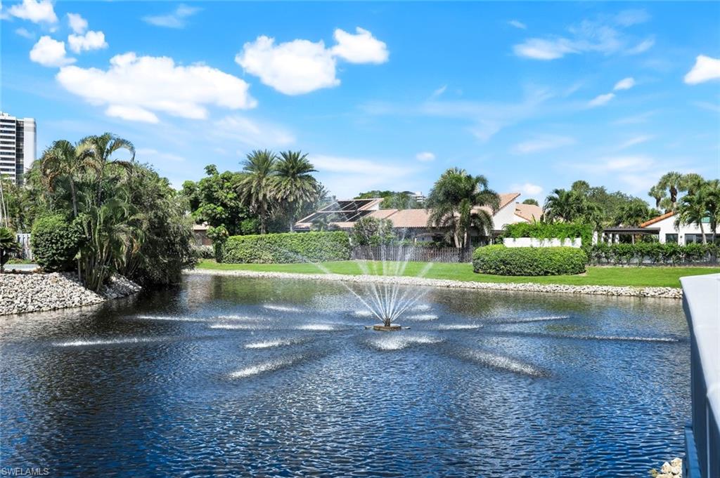 Nestled in the prestigious Bridge Way Villas enclave of Pelican Bay, this exquisite single story lakefront villa is a true haven for those who cherish stunning views and outdoor living. Experience the very best of Naples' upscale coastal lifestyle with a tranquil oasis designed for relaxation and entertaining. The heart of this home is its spectacular outdoor space, where a very spacious covered lanai overlooks a large pool deck and a custom free-form pool with a built-in cascading water fountain. This is a private sanctuary for sun-soaked afternoons and quiet evenings. The coveted western exposure provides this home with gorgeous sunset skies that paint the tranquil lake and fountain view with vibrant color every evening. You will love that these exceptional, breathtaking views are featured from the main living area, spacious living room, and the master bedroom. The interior of this beautifully maintained 3-bedroom, 2.5-bath residence provides 2,100 square feet of extraordinary living space in this single story home with no steps to navigate. The home features an open-concept layout with soaring 20-foot vaulted ceilings, electric fireplace to enjoin the winter months and a magnificent kitchen with stainless steel appliances including a new range and microwave, quartz countertops, and a morning room. Master bath is a relaxing retreat with a walk- in shower, a freestanding soaking tub and walk in closet. Recent updates include a new roof in 2021, new washer and dryer and new air-conditioning to the two-car garage. Living here grants access to all Pelican Bay privileges, including nearly three miles of private white-sand beaches, beachfront dining at two private restaurants, tennis and pickleball courts, a fitness center, walking trails, and kayaking. The villa is located on a quiet cul-de-sac and is a short walk to Waterside Shops and Artis-Naples.