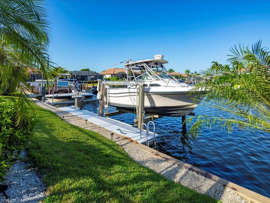 Waterfront opportunity for those who recognize value! West facing 3 bedroom 2 bath home with open water view of intersecting canals. Dock with lift for your boat (the additional floating dock and both boats not included in sale). Newer style (year 2000) house built with high ceilings so you have space and volume inside. Nice street appearance too. Feel the sun’s warmth even in winter on your sun blessed pool and screened lanai. Grill and chill while you relax with family or friends. The basics are excellent! Polish the cosmetics and this wonderful home will shine again! Roof age 25 years makes most hazard insurance and financing difficult so cash offers only please. Owner has a current active flood policy which buyer can assume. CBS construction solid home needs new owner now…..is it you?