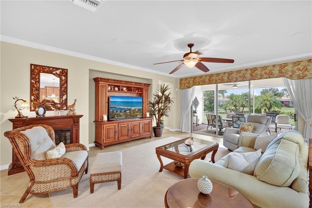 Discover your perfect Florida winter escape or primary residence in this meticulously maintained Dunwoody Trail floor plan with 3 spacious bedrooms, 3 full baths plus an expansive den and a 2 car plus golf cart garage. Home is move-in ready so the moment you move in you can start enjoying all that VillageWalk and SW Florida have to offer. You will love how light and bright this home is with its pleasing neutral color palette and lots of windows and sliding glass doors to let in the natural sunlight. The heart of this great room floor plan is the gourmet kitchen with its enhanced island, the perfect spot for entertaining. Showcasing upgraded wood cabinets w/crown top, under cabinet lighting, stylish tile backsplash, and is equipped with SS appliances. The owner’s suite is generous in size, has an oversized walk-in closet and bath has a convenient walk-in shower with seamless glass doors. Flooring throughout the home consists of durable tile laid on a diagonal and solid surface in the bedrooms—no carpet for easy maintenance. Plantation shutters, 8 ft. doors, Wainscoting, crown molding, stylish light fixtures and ceiling fans throughout the home enhance the aesthetics. Laundry room has ample storage cabinets, counter for folding laundry and handy utility sink. Relax outdoors on the screened lanai or sunbath on the paver patio deck that overlooks the pretty landscaping and sparkling lake, the perfect spots to enjoy our beautiful weather and stunning sunsets. Hurricane protection is easy with accordion and electric shutters on the front entry and lanai, offering peace of mind. Finch Terrace is just a short walk, bike or golf cart ride to the amenity rich town center that offers something for everyone: resort style & lap pools, 24/7 fitness center, lighted Har-Tru tennis courts, pickleball center and bocce all with active leagues. In addition, there is a lighted basketball court, tot lot, full-service restaurant w/indoor and outdoor dining, beauty salon, bagel shop, spa, ice cream shop, and lots of planned activities by the full-time activities director. VillageWalk of Bonita is unique with it’s pretty butterfly gardens, miles of lakes, sidewalks, walkways over connecting bridges and impressive wildlife. Guard gated, golf cart and pet friendly. It’s a great location to our beautiful sandy beaches, SW Florida International Airport, shopping, entertainment destinations and coming soon the highly anticipated Midtown Bonita a new shopping and restaurant experience. Make your showing today as this is Florida Living at its best and the perfect place to call home!