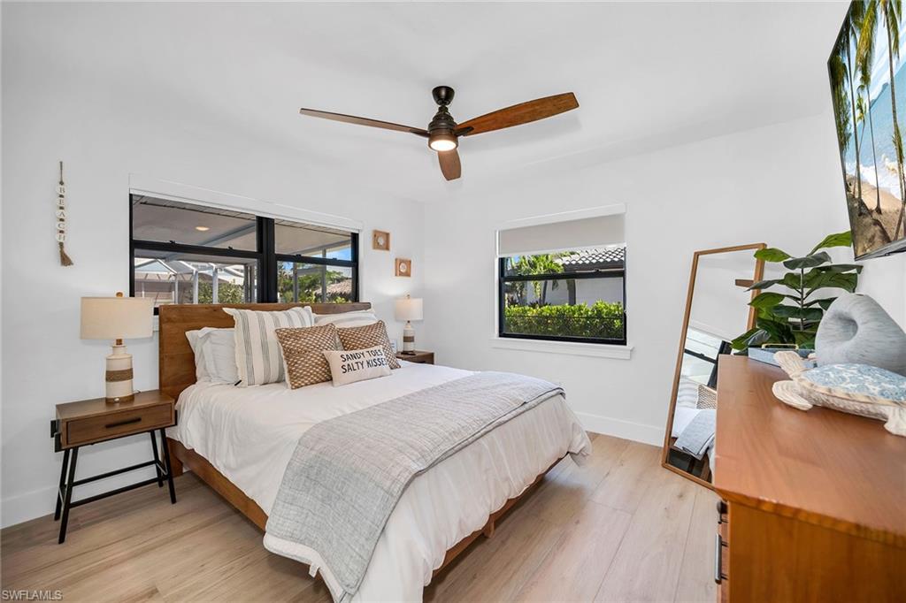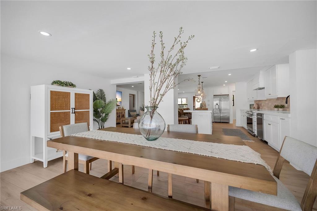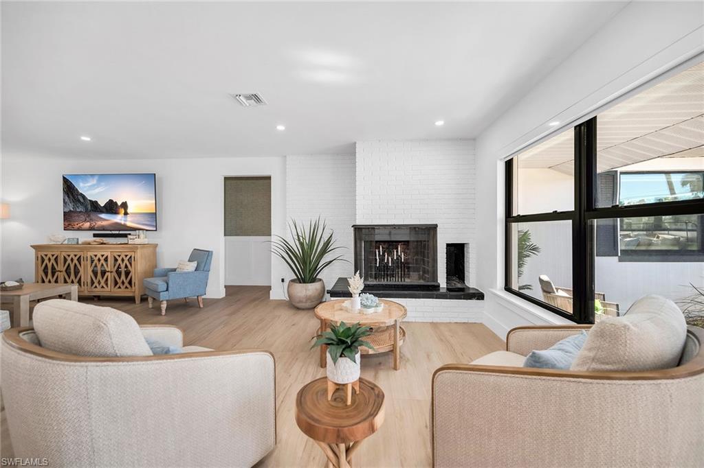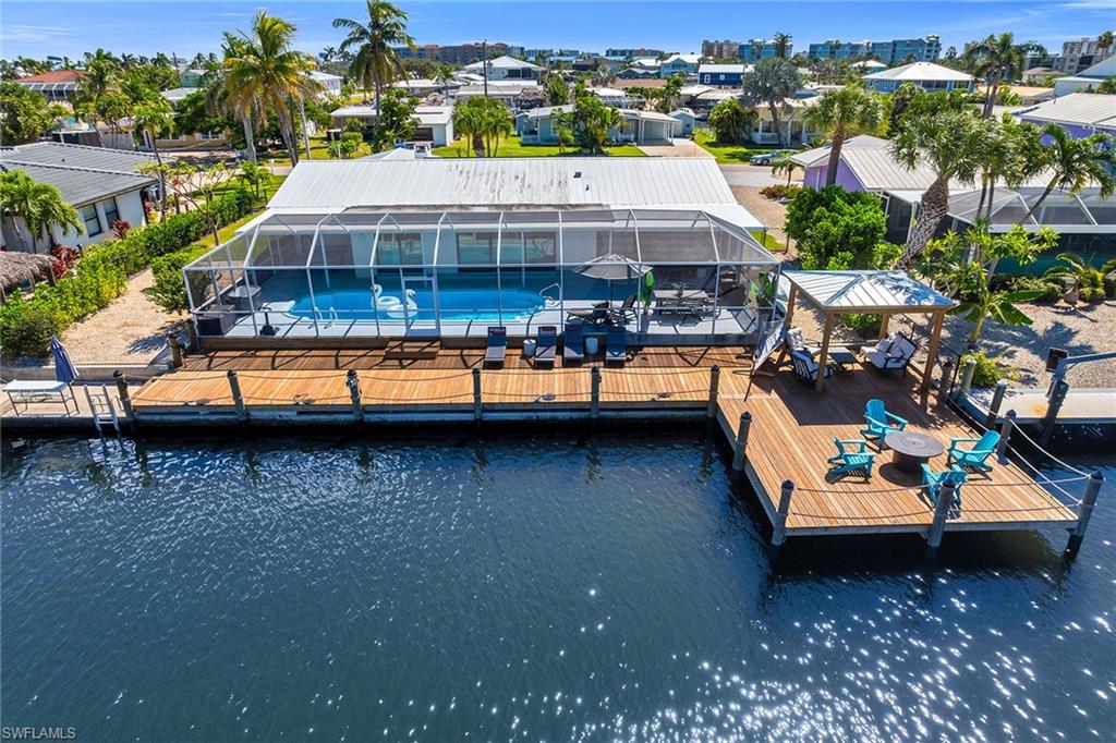 Experience the ultimate coastal lifestyle in this beautifully updated canal-front home in the desirable Sandpiper Village community of Fort Myers Beach. On a rare double lot, this residence offers easy canal access for boating directly to the Gulf along with a deeded walkway to the white sandy beach, providing the best of both worlds for water enthusiasts. Designed for relaxed island living, this move-in-ready retreat has been completely modernized with new stainless steel appliances, impact-rated doors and windows, a metal roof, and stylish interior finishes that complement its open, airy layout. Inside, the home features two bedrooms, two dens, and two baths, offering flexible living spaces ideal for guests or a home office. The open kitchen is a showpiece, boasting modern cabinetry, quartz countertops, a tile backsplash, an island with bar seating, and premium appliances including a paneled range hood, under-counter microwave, dishwasher, refrigerator with icemaker and a wine cooler. The adjacent dining area flows seamlessly to the screened lanai through sliding glass doors, creating effortless indoor-outdoor living. A cozy living room highlighted by a brick feature wall and fireplace adds warmth and character, while wood-look laminate tile flooring, recessed lighting, and custom wall trim elevate the home’s modern coastal charm. Two of the rooms are traditional bedrooms with closets, while the remaining two versatile dens are designed to serve as additional sleeping areas, an office or a media room. One of the larger bedrooms features an adjacent bath with a sleek vanity and a walk-in shower tiled floor-to-ceiling with a glass enclosure. The second bath mirrors the same modern design with a contemporary vanity, LED mirror and walk-in shower. The attached garage is finished with epoxy flooring and air conditioning, designed as a game room or entertainment space with access to the driveway and lanai. Go outside to your private waterfront oasis, complete with a heated saltwater pool, a large covered screened lanai, and a spacious dock with a charming gazebo and ceiling fan, ideal for relaxing, fishing or enjoying evening sunsets. For added peace of mind, the property includes flood barrier protection designed to help prevent rising water intrusion during storms, along with transferable flood insurance. The circular brick paver driveway and lush landscaping enhance curb appeal, while the private boat dock with Gulf access makes this home a boater’s dream. Offering a rare blend of privacy, luxury and convenience with no HOA, this property provides excellent investment potential as a vacation rental or personal coastal retreat.