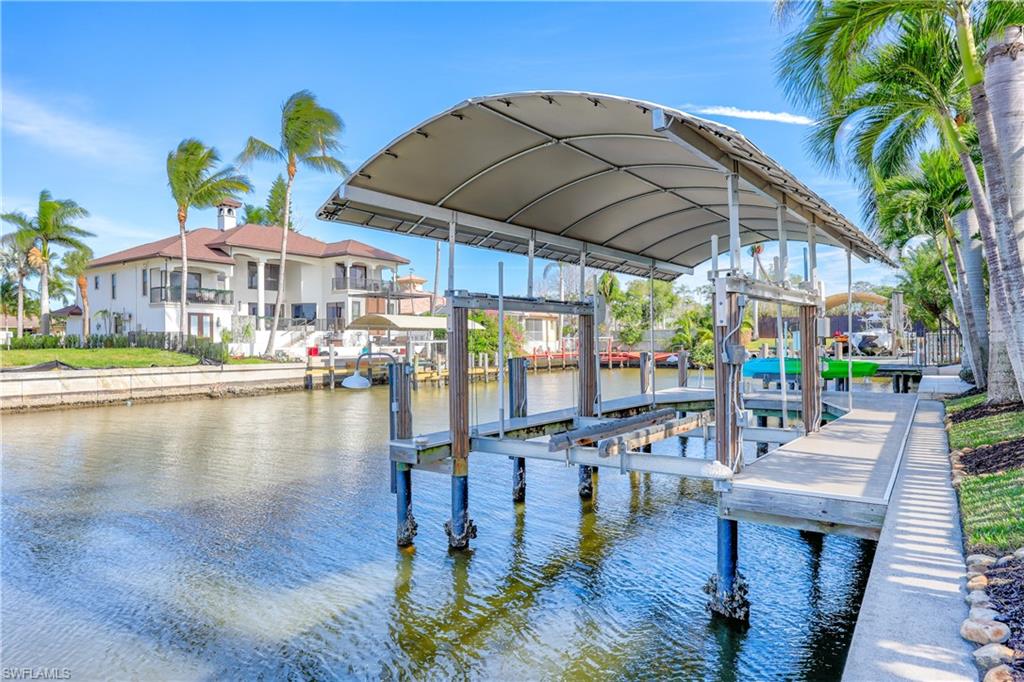 This magnificent Gulf access waterfront home has been renovated and updated to like new status - kitchen, metal roof, bathrooms, flooring, pool and spa resurfacing, paint inside and out, garage doors, landscaping and lighting - all done! Almost 3700 sq. ft. under air, with the owner's suite on the first floor, a bedroom with ensuite bath and balcony on the second level, and two more bedrooms with a balcony on the third level and a breakfast bar, giving everyone their private space. Entering the foyer, you will be impressed by the sense of openness and luxury, the high tray ceilings, and views to the huge lanai, pool, and your dock beyond on the wide canal. Like new chef's kitchen with gas cooktop, custom cabinets, stainless KitchenAid appliances, and beautiful Pompeii Quartz countertops throughout the home. The owners suite, living area, family room and den/office all have water views, and the corner sliders open up for indoor/outdoor living. A 13000 pound lift with a new cover is ready for your boat, and the dock also has a jet ski lift and underwater lighting. Full hurricane protection with impact windows and electric roll down shutters. This home has been lightly used and perfectly maintained by the owner. Minutes to the Mercato and beaches, convenient to downtown Olde Naples. Less than 2 miles by boat to Wiggins Pass and the open ocean. Come see this home and you will fall in love.