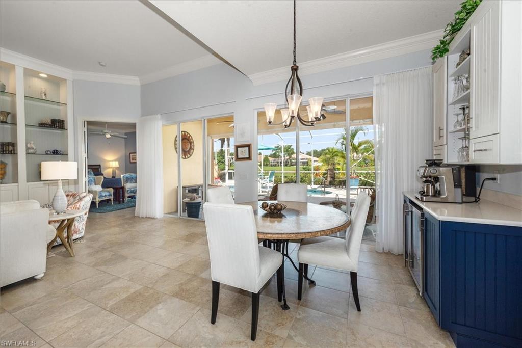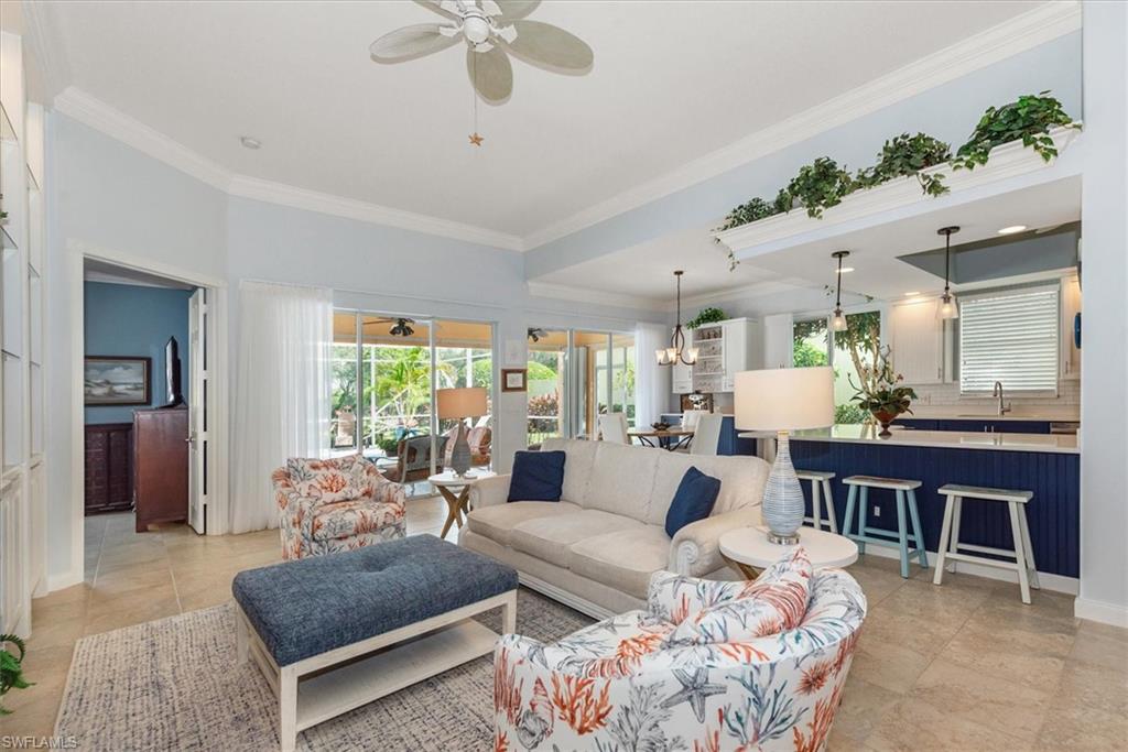 Look no more; just reduced price to $724,900. Best Buy, this is the one you’ve been waiting for to call home. Meticulously maintained, thoughtfully remodeled, and upgrades galore. The moment you walk in, your eyes will be captivated by the picturesque landscape, majestic views of a large screened lanai, and a large pool deck with potted plants overlooking the lake and lush landscaping. This is a popular Oakmont model with 12-foot ceilings and an open, bright, and beautiful floor plan. There are double crown moldings and baseboard trim throughout. The pool deck is freshly painted, and the electric pool heater is brand new. High-end Customer Silhouette sheer drapery throughout. High-end upgrades include: Beadboard wainscoting in the Foyer and Laundry Room; Great Room entertainment center (all original mirrors removed and replaced with beadboard); Kitchen remodeled by Cornerstone in 2021 with new server buffet encasing a 54-bottle wine chiller in the Dining area, refaced wooden cabinets and quartz countertops; Primary Bedroom sliding closet doors replaced with stained wooden louvered doors; Primary Bath remodeled in 2019 with new vanities, toilets, tiled shower and ceiling fan. Washing machine new in 2025 and dryer new in 2024 . Patio furniture, metal-framed floral love seat, single chairs and a chaise , coffee table, 2 chaise lounge chairs with 2glass top side tables. Blue ceramic large plant and 2 additional plants at no cost. Epoxy garage floors 2025 Accordion shutters throughout + pull down front door. VillageWalk of Bonita offers many amenities: Grand clubhouse with gathering room, library and ballrooms; heated resort pool; heated lap pool; outdoor pool food and beverage service; full-service restaurant and sports bar; bagel & sandwich shop; ice cream shop; spa; hair salon; U.S. Post Office; Shell gasoline pumps; touchless car wash; tennis courts; bocce courts; basketball court; child’s playground; fitness center; manicured lawn with gazebo overlooking the lake. There is a full-time Activities Director and a full calendar of club and sponsored activities. HOA fees are low and include fiber-optic high-speed internet and high-definition TV, all amenities, all lawn & landscape maintenance, all irrigation water & equipment, and the 24/7 guarded gatehouse. There are 21 miles of paved walkways. RSW is 25 minutes door-to-door. Bonita Beach is 9 miles (20 minutes) away. VillageWalk is not in a flood zone! This Oakmont is constructed to the current building code with poured concrete walls with rebar reinforcement, roof trusses strapped to the structure, heavy clay tiles, and accordion metal hurricane shutters for all openings. It went through Irma in 2017 and Ian in 2022 without a scratch!