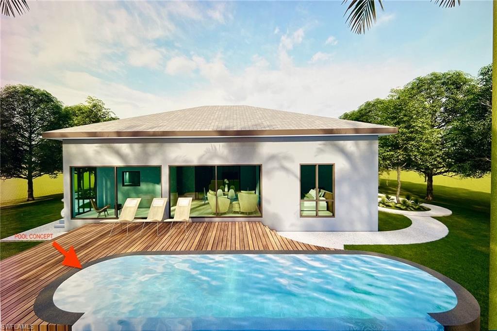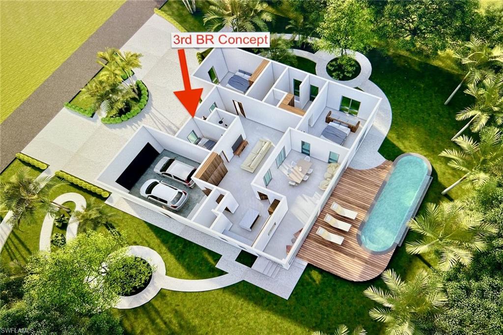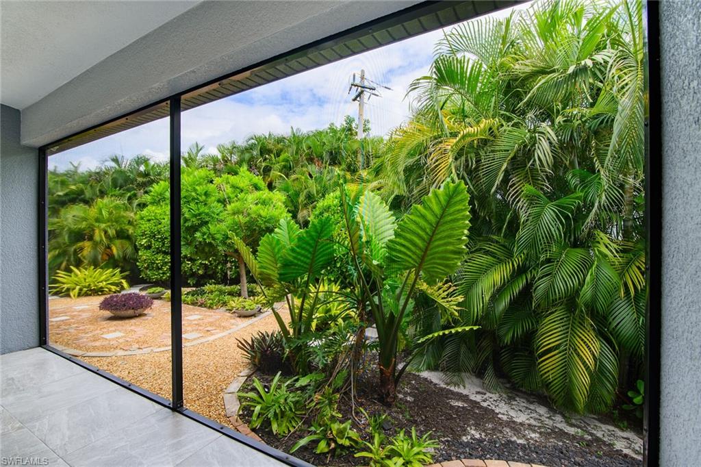 Welcome to this one-of-a kind custom contemporary home, surrounded by a spacious, private, serene tropical landscape. Enter through a screened front porch to an open airy concept with 10 ft ceilings and porcelain tile throughout. The chef friendly kitchen brings the tropical outside in, with custom transom windows. Quartz countertops, all stainless-steel appliances and induction stove. Plenty of closets including 2 pantries, and a hidden walk-through dressing room in the primary.Spacious bedrooms include private ensuite bathrooms with easy to maintain doorless walk-in showers. The spacious floor plan also allows for the addition of a potential third bedroom/flex or office (approximately 11'x 10').Enjoy the party sized covered and screened lanai overlooking a tranquil, Zen-like backyard, with a paved outdoor BBQ area on the side. This is a great opportunity to design and build the pool/spa of your dreams. Large circular drive with plenty of parking for your guests. Great location. Only 3 minutes to many shops / stores, 5-minute drive to resident’s beach. Very close to restaurants, schools and the YMCA.