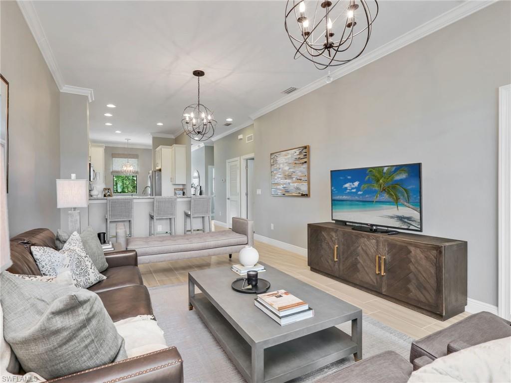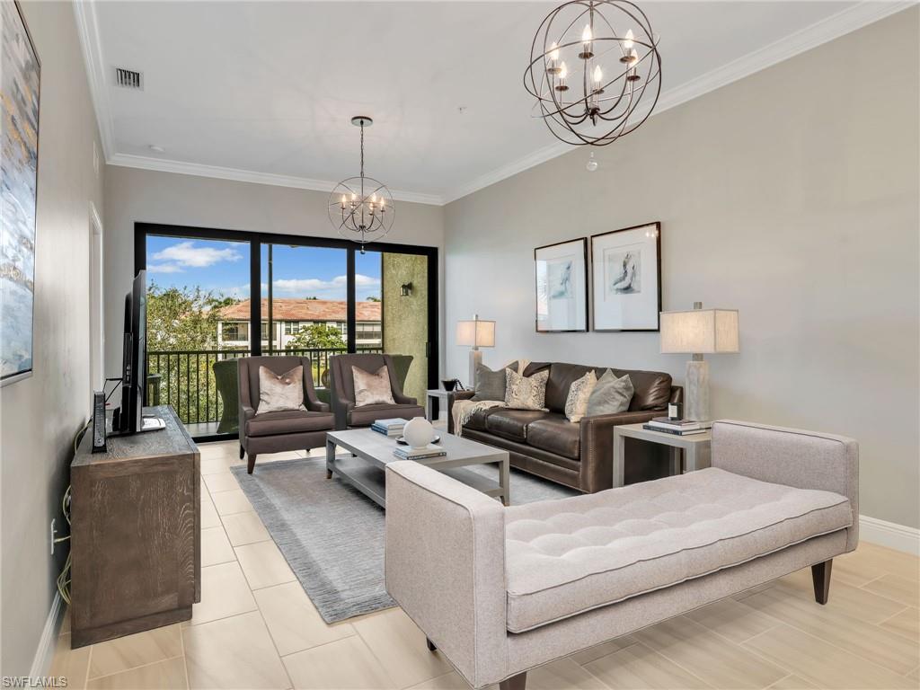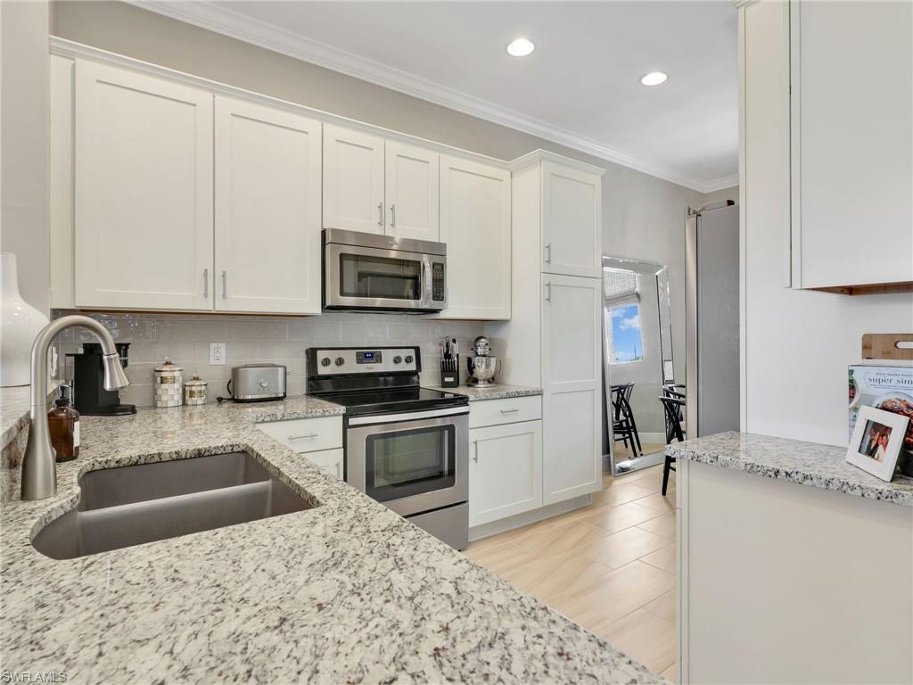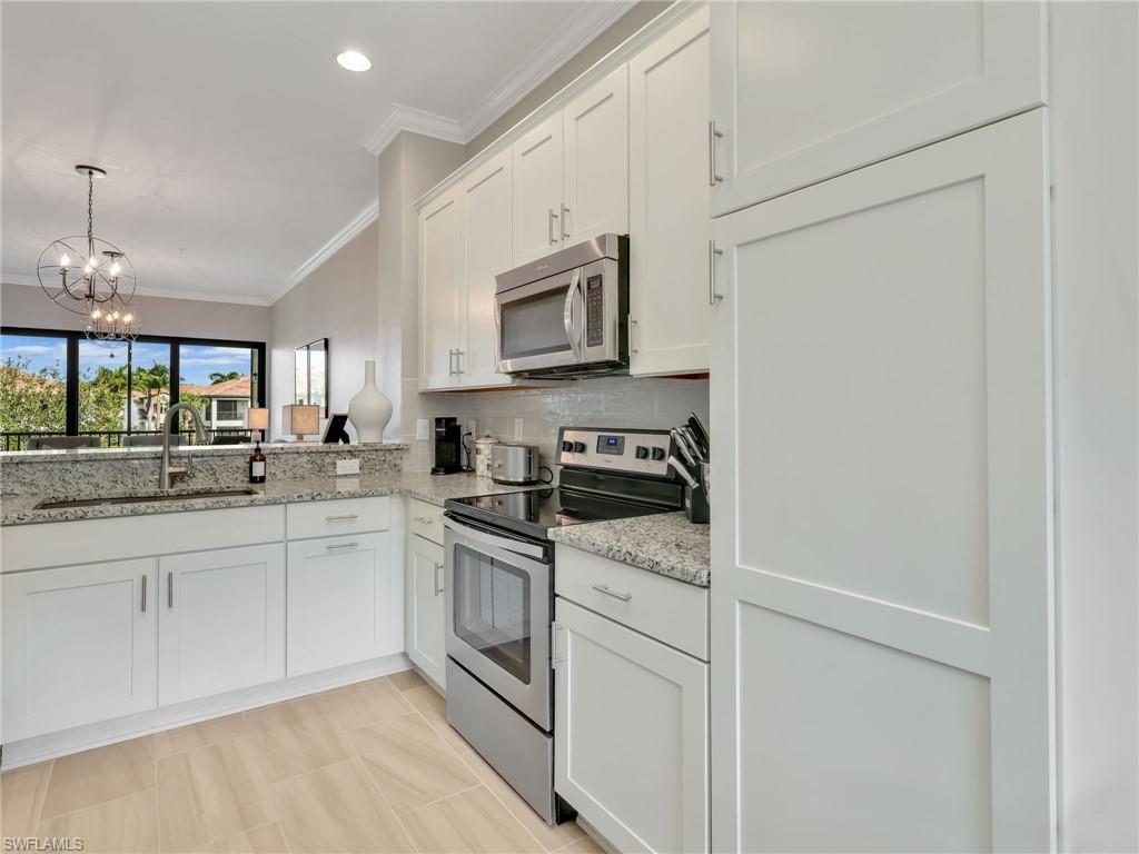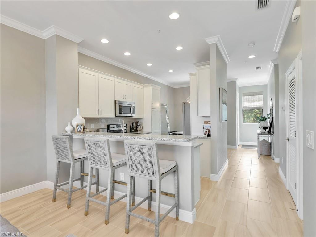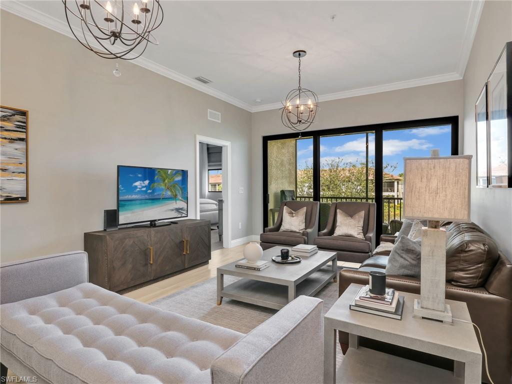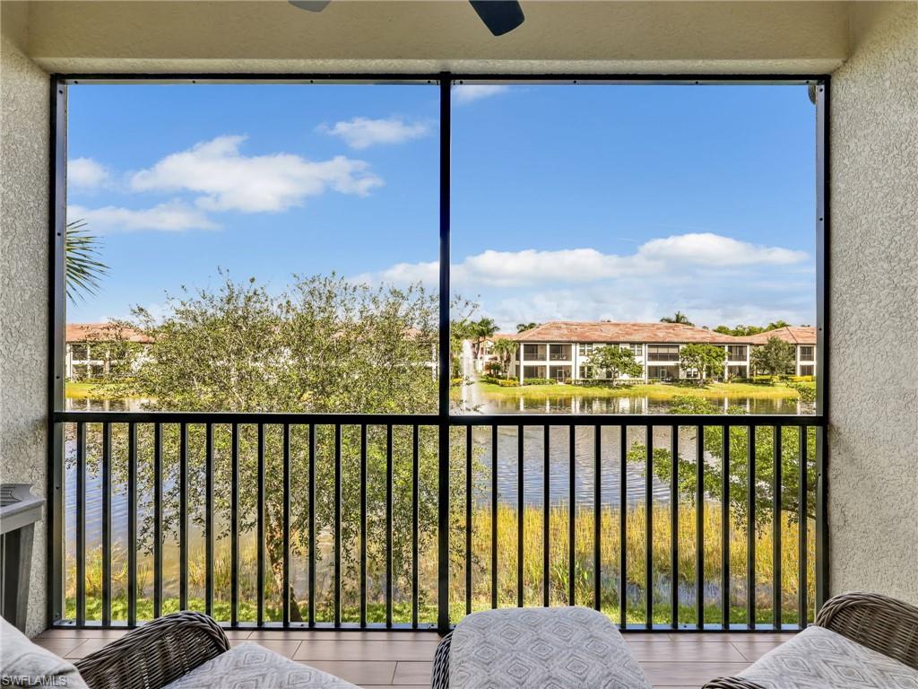 MUST SEE! This meticulous 3 bedroom, 2 bathroom second floor END UNIT condo offers tranquil lake views with a fountain and is ideally situated in the conveniently located gated community of Livingston Lakes in prime North Naples. Boasting 1,258 square feet of thoughtfully designed living space, this property features a split-bedroom floor plan, volume ceilings, and a tiled screened-in lanai that invites you to unwind with a peaceful morning coffee. The kitchen is both stylish and functional, showcasing white shaker cabinetry, granite countertops, a Blanco silgranit sink, stainless steel Whirlpool appliances—including a new refrigerator (2023) & a new dishwasher (2022), subway tile backsplash, soft close drawers, a pantry, breakfast bar, and an inviting eat-in kitchen area with an additional dining/living space for added versatility. The spacious primary suite offers a walk-in closet and an en-suite bathroom with granite countertops, glass shower enclosure, floor to ceiling tiled shower, upgraded mirror and vanity with drawers, while the guest bathroom impresses with quartz counters, upgraded mirror and a floor to ceiling tiled shower/tub combination. 12x24" neutral tile flows through the main living areas & third bedroom (currently set up as an office), crown molding in the eat-in kitchen, kitchen & living area, perfectly paired with upgraded Karastan carpet & carpet pad in two bedrooms (2022), 3 Crystorama designer lighting fixtures in the living area and eat-in kitchen, and Hunter Douglas woven blinds throughout. Additional highlights include IMPACT RESISTANT windows and doors, a stackable washer and dryer, and neutral paint throughout. This condo comes with 1 assigned parking space plus 1 blank space in addition to guest parking. Low HOA fees include exterior insurance, internet, water, landscaping, irrigation and gated entry. Amenities include resort style pool with cabanas, fitness center, fireplace, grills and community room with kitchen. Very active community with food trucks on the 1st Friday of every month in season, dine arounds, holiday parties and many social events. Centrally located within walking distance to North Collier Regional Park and Seed To Table, easy access to I75 & all Immokalee Rd has to offer. Just 6 miles to the beach!