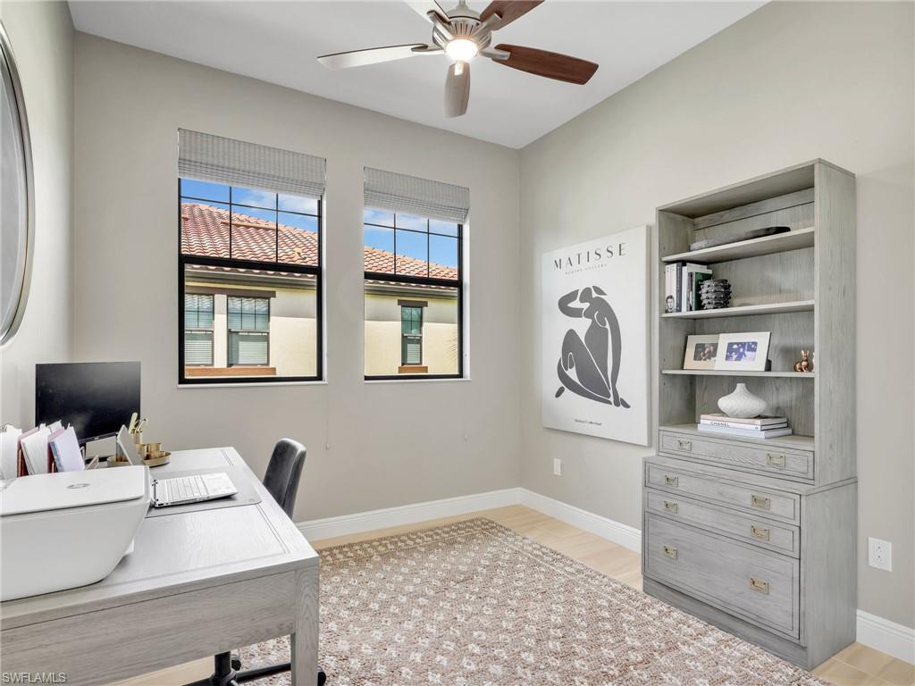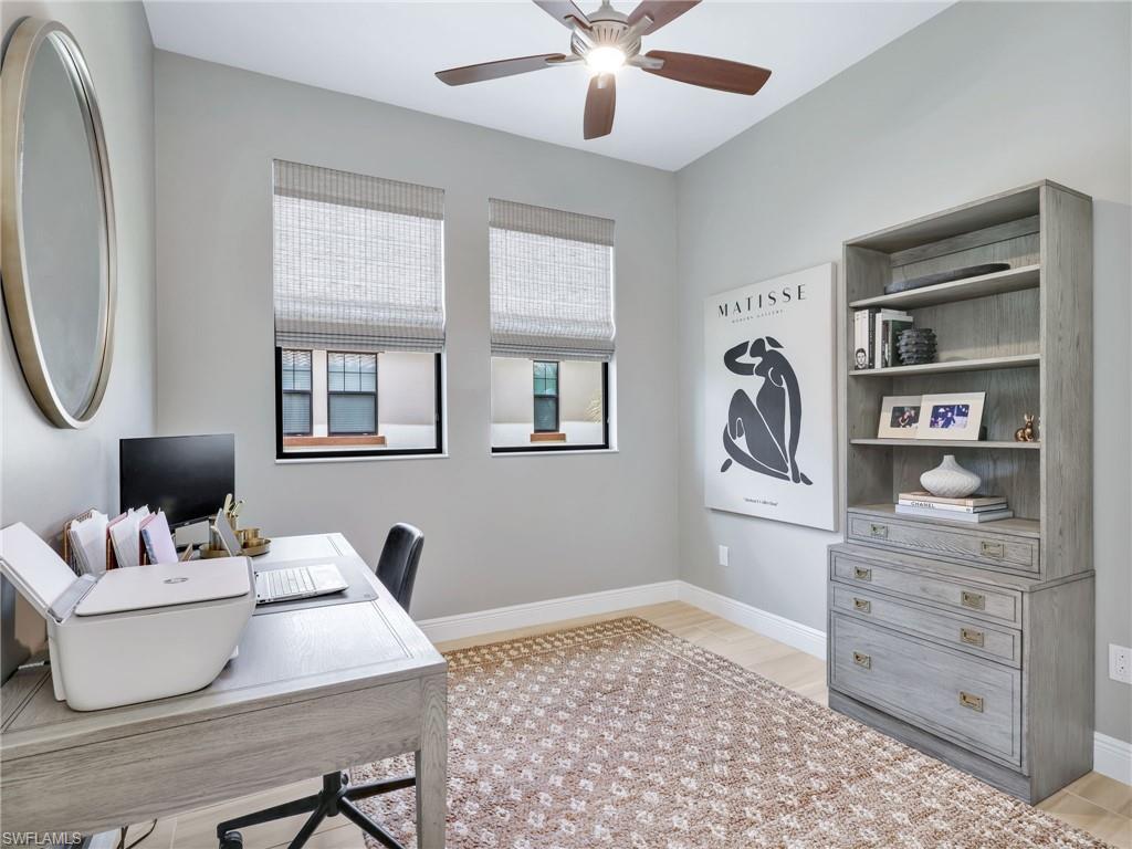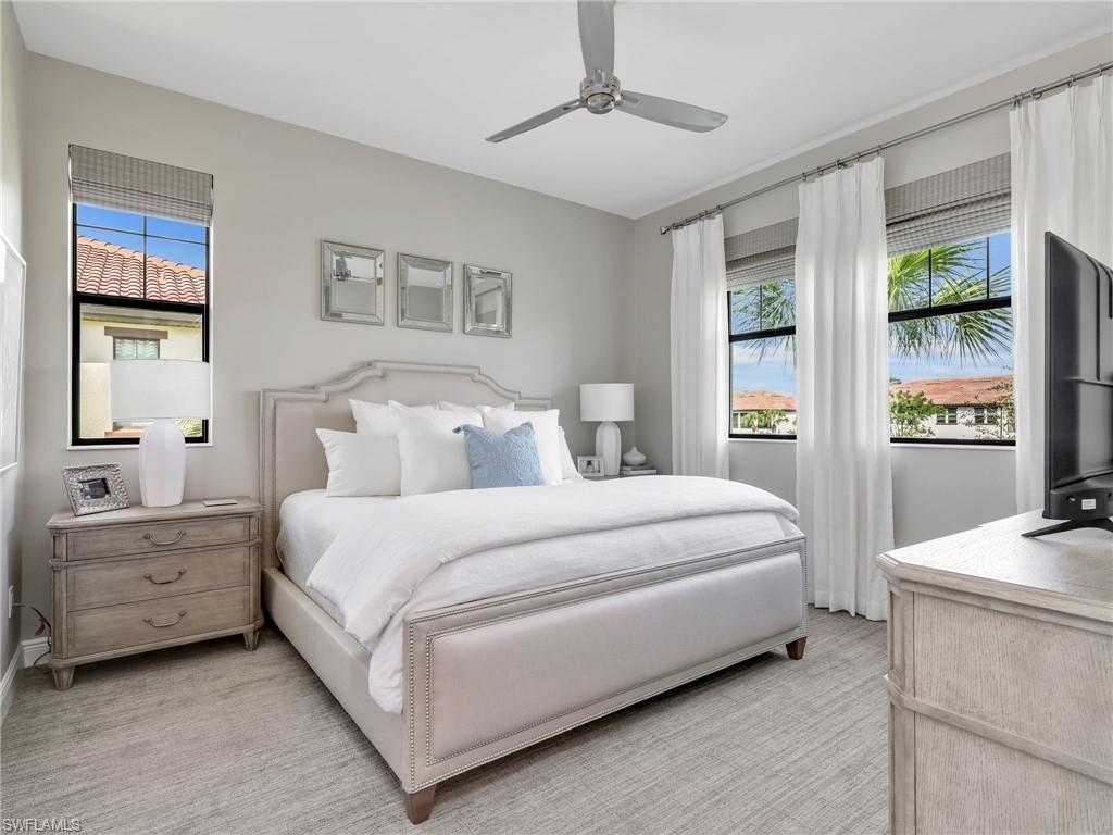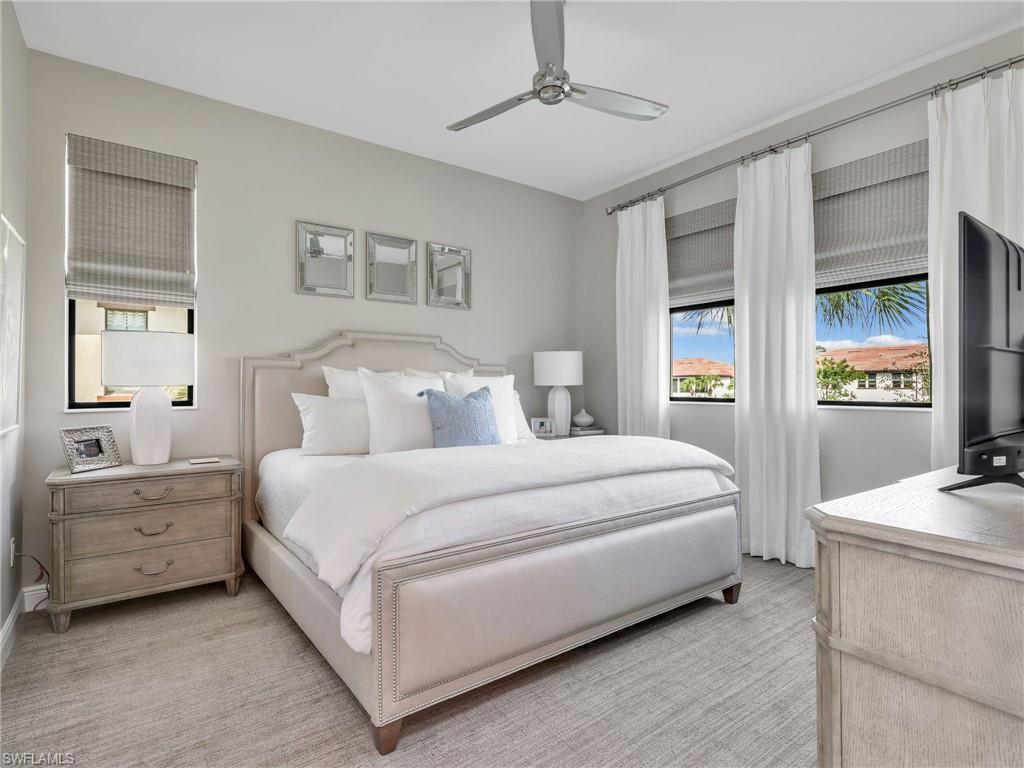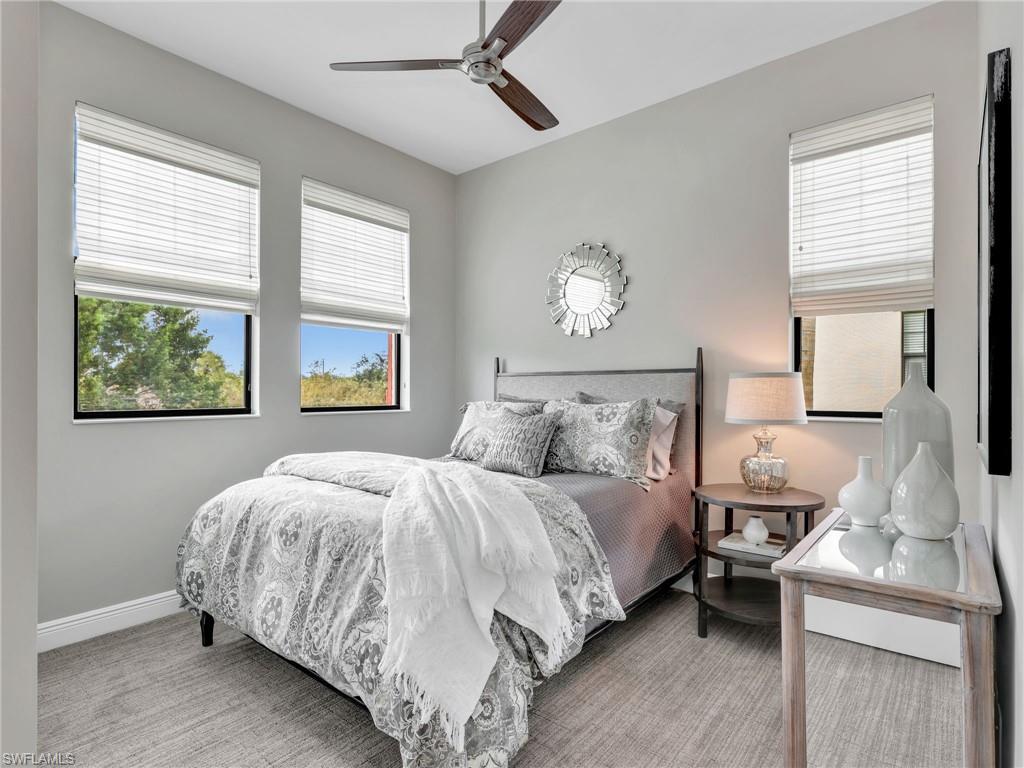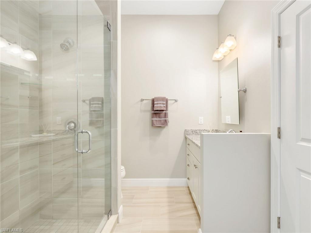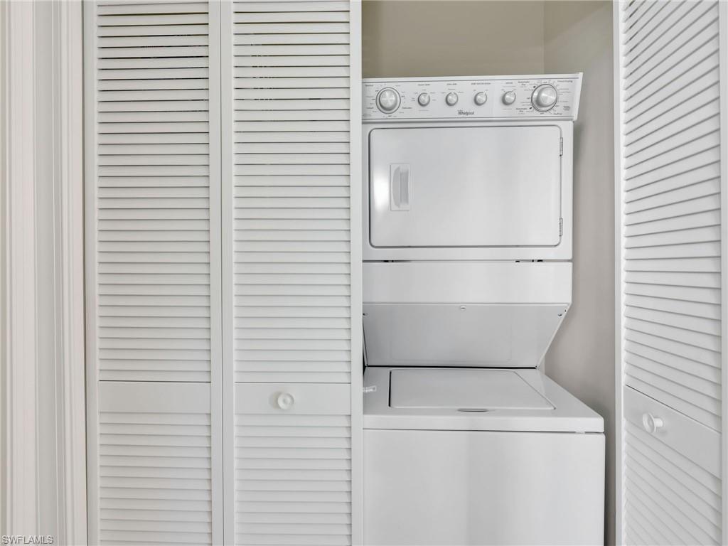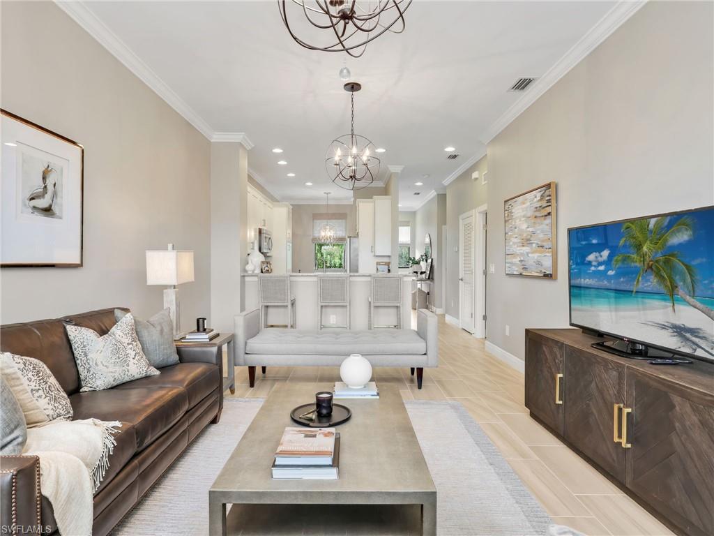 MUST SEE! This meticulous 3 bedroom, 2 bathroom second floor END UNIT condo offers tranquil lake views with a fountain and is ideally situated in the conveniently located gated community of Livingston Lakes in prime North Naples. Boasting 1,258 square feet of thoughtfully designed living space, this property features a split-bedroom floor plan, volume ceilings, and a tiled screened-in lanai that invites you to unwind with a peaceful morning coffee. The kitchen is both stylish and functional, showcasing white shaker cabinetry, granite countertops, a Blanco silgranit sink, stainless steel Whirlpool appliances—including a new refrigerator (2023) & a new dishwasher (2022), subway tile backsplash, soft close drawers, a pantry, breakfast bar, and an inviting eat-in kitchen area with an additional dining/living space for added versatility. The spacious primary suite offers a walk-in closet and an en-suite bathroom with granite countertops, glass shower enclosure, floor to ceiling tiled shower, upgraded mirror and vanity with drawers, while the guest bathroom impresses with quartz counters, upgraded mirror and a floor to ceiling tiled shower/tub combination. 12x24" neutral tile flows through the main living areas & third bedroom (currently set up as an office), crown molding in the eat-in kitchen, kitchen & living area, perfectly paired with upgraded Karastan carpet & carpet pad in two bedrooms (2022), 3 Crystorama designer lighting fixtures in the living area and eat-in kitchen, and Hunter Douglas woven blinds throughout. Additional highlights include IMPACT RESISTANT windows and doors, a stackable washer and dryer, and neutral paint throughout. This condo comes with 1 assigned parking space plus 1 blank space in addition to guest parking. Low HOA fees include exterior insurance, internet, water, landscaping, irrigation and gated entry. Amenities include resort style pool with cabanas, fitness center, fireplace, grills and community room with kitchen. Very active community with food trucks on the 1st Friday of every month in season, dine arounds, holiday parties and many social events. Centrally located within walking distance to North Collier Regional Park and Seed To Table, easy access to I75 & all Immokalee Rd has to offer. Just 6 miles to the beach!