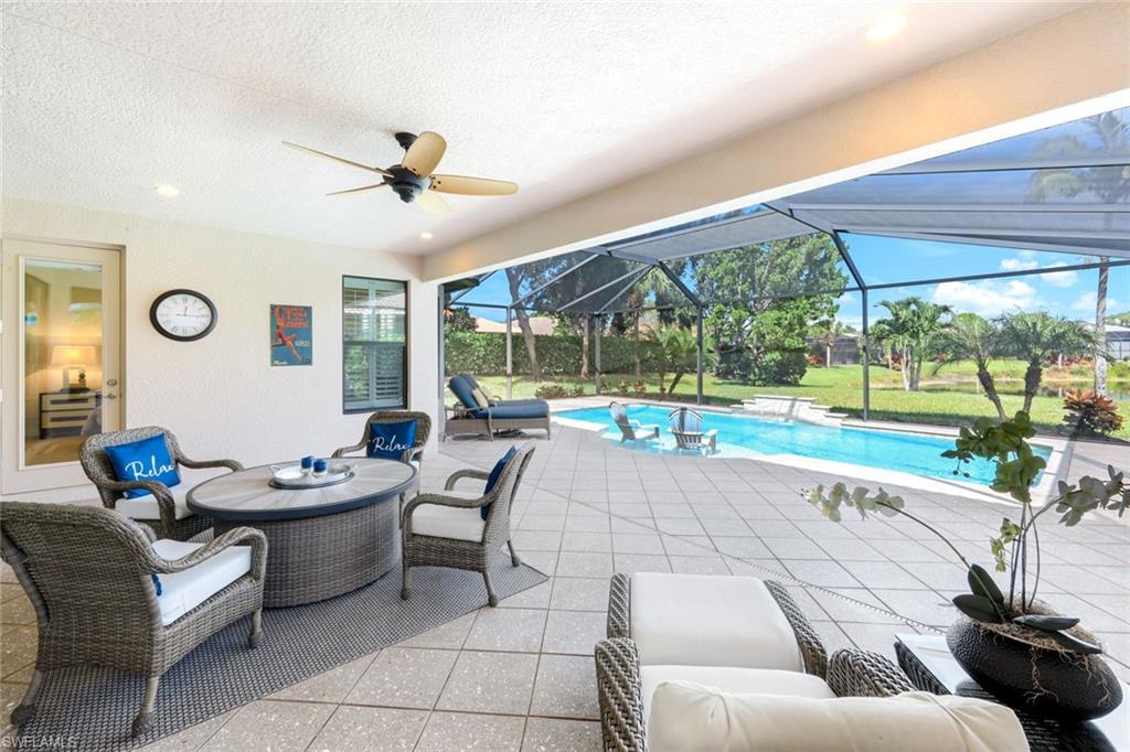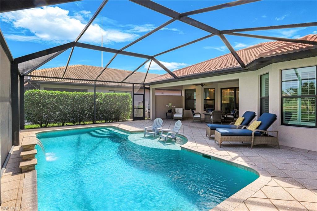 Step into effortless Florida living with this beautifully FURNISHED, TURNKEY and move-in-ready home in the coveted Cordova at Spanish Wells. A covered entry opens to an elegant foyer, revealing expansive views through the great room and out to the extended lanai, showcasing the salt-water pool with a sun pad—complete with upgraded pavers and a newer screened cage built to higher standards than the original. Enjoy serene lake views on one side and lush privacy landscaping on the other. The completely remodeled kitchen (over $40,000 before appliances) is a chef’s delight, featuring white quartz counter tops, extra deep kitchen sink, new custom soft-close cabinetry, extended display cabinets, and a sunlit breakfast nook alongside a convenient breakfast bar. Entertain with ease in the formal dining room and spacious great room, enhanced by diagonally laid tile flooring and a custom wall niche. Plantation shutters add timeless elegance. The primary suite is a private retreat, opening directly to the lanai and showcasing a coffered ceiling, dual closets, and a luxurious bath with beautifully detailed shower tile. Two additional bedrooms and a full bath offer comfort and flexibility for guests or family. Additional highlights include a laundry room with built-in cabinetry, and a freshly painted exterior (2025). Social membership is required—with reduced fees for Cordova residents. This is your chance to live the ultimate Southwest Florida lifestyle—just minutes from beaches, dining, and golf. Welcome home.