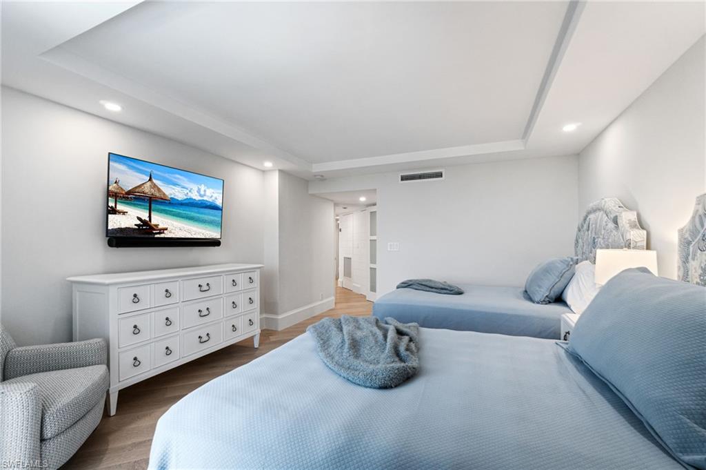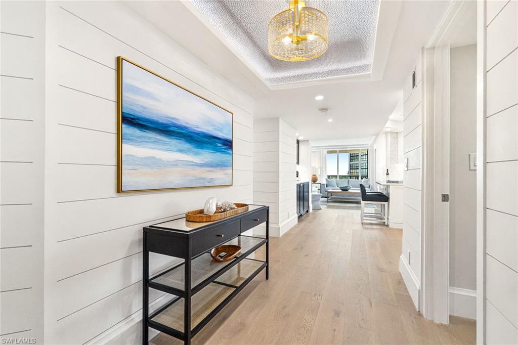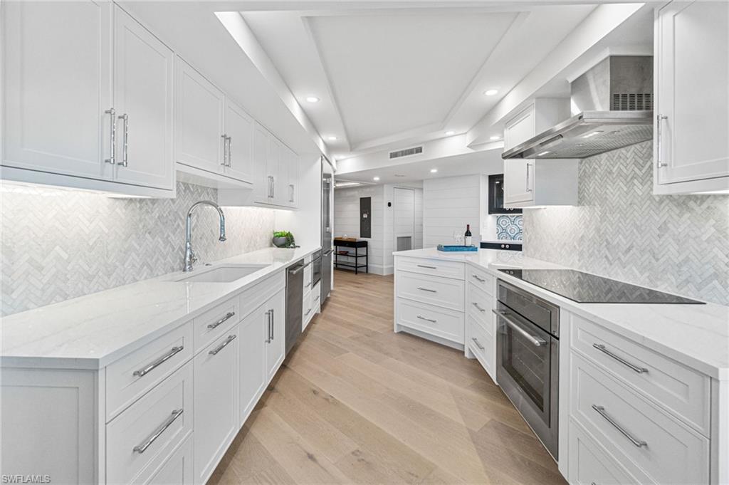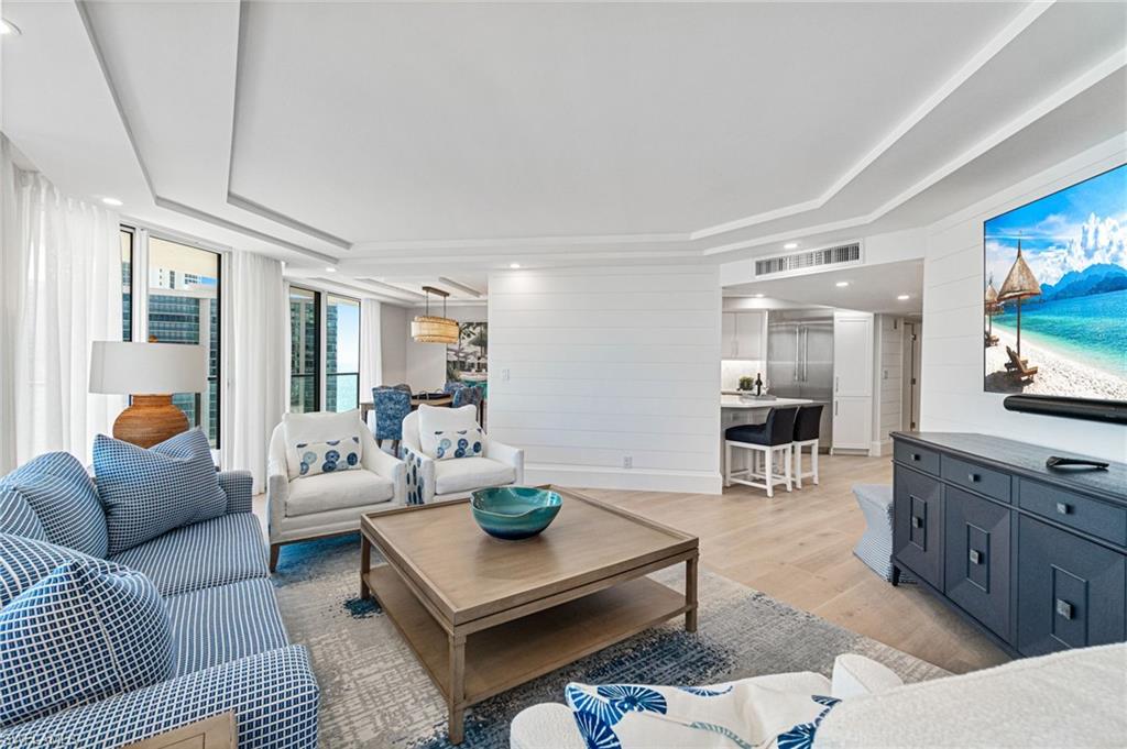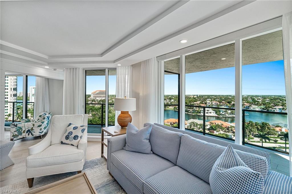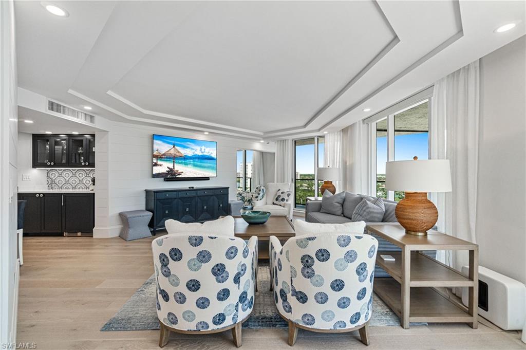 Unbelievable price! Experience the ultimate in modern coastal living in fully redesigned 3 bedroom, 3 full bath residence at The Meridian Club, one of Park Shore’s most prestigious beachfront addresses. Perched on the 15th floor, this turnkey designer condo offers sweeping views of both Venetian Bay and the Gulf of Mexico — a true Naples retreat for discerning buyers relocating from “up North”. The chef-inspired kitchen is a showpiece, featuring a Thermador appliance package with induction cooktop, built-in drawer microwave, and all stainless steel appliances. Elegant white cabinetry, quartz countertops, a white and gray herringbone backsplash, and high-end fixtures create a clean, coastal aesthetic. A breakfast bar for two adds casual dining space, while the complimenting wet bar with navy cabinetry, glass display, and patterned tile backsplash makes entertaining effortless. Designed by Diane Torrisi Designs and Kevin Steffanni Design Group, the home features wide-plank wood flooring, stepped ceilings, frosted glass and solid doors, and an open, light-filled layout leading to an expansive wraparound balcony with updated glass railings and a glass-enclosed seating area perfect for sunset views. The primary suite is a sanctuary with three custom closets, mirrored doors, and a spa-style bath with multiple shower heads. Two en-suite guest bedrooms offer refined comfort and privacy. High end designer furnishings, electric shades, custom draperies, custom closets and mounted TVs complete this elevated retreat. The Meridian Club allows one pet up to 25 pounds and has reasonable condo fees for the area. The building and pool did not get ANY water intrusion from ANY storm/hurricane. It sits on 3.5 acres of beachfront with only four units per floor. Enjoy a 24-hour doorman, resort-style pool and spa overlooking the Gulf, tennis and pickleball, outdoor grill area, and direct access to Naples’ white-sand beach. Located minutes from Venetian Village’s fine dining and boutique shopping, this home embodies effortless beachfront sophistication. Turnkey. Renovated. Ready for your Naples lifestyle.