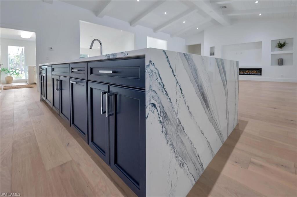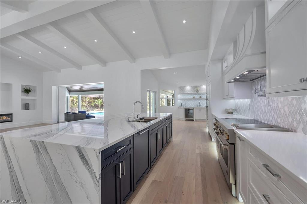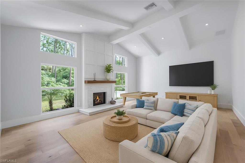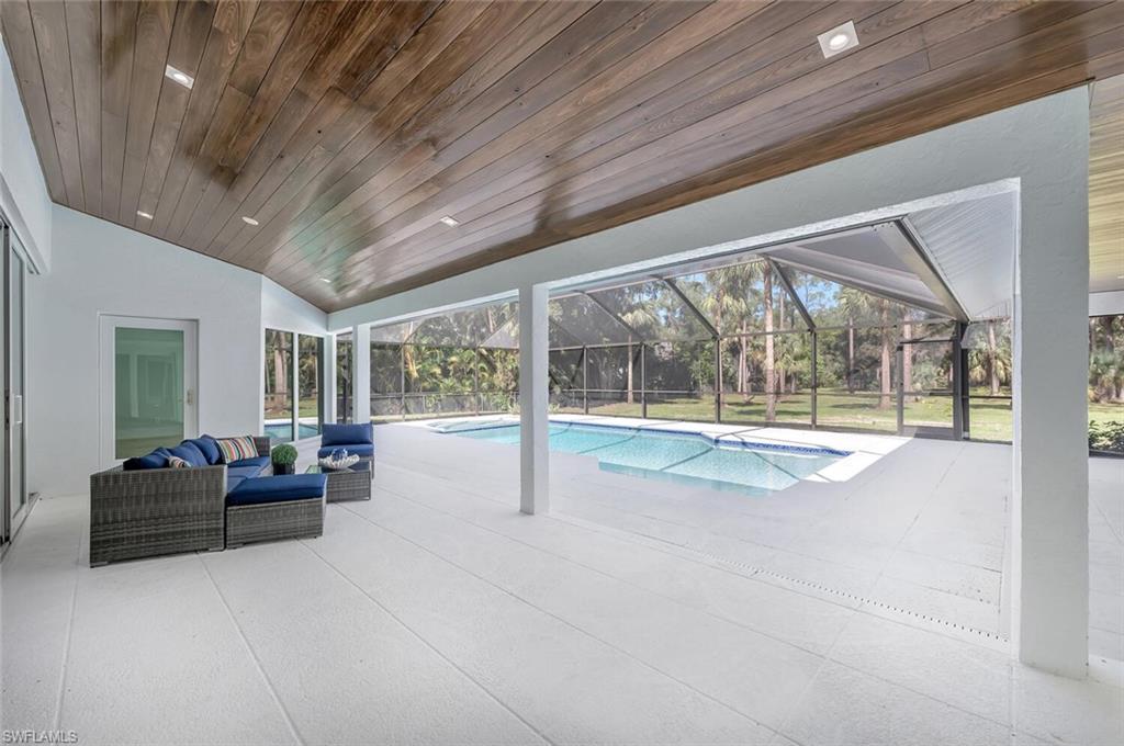A must see Newly renovated from top to bottom, this property lives like a brand-new custom home on a private LOGAN WOODS, 2.27 acre lot in the middle of North Naples. Luxury and lifestyle of space and quiet meet here, while being located in town. Enjoy the open floorplan with over 3600 square feet of entertaining and accommodating space for everyone. With 5 bedrooms and 4 full baths, plus a bonus family room, there is space for everyone. Step outside to an oversized pool and spa with new pebble finish, glass tile, LED color-changing lights and app-based controls anchor the resort-style backyard, complemented by a custom outdoor kitchen, screened cage, premium landscaping, fruit trees and a fully fenced oversized lot with room for an outbuilding or guest house. Inside, premium white oak wood floors run throughout, tying together custom cabinetry, lighted built-ins, designer fixtures and dramatic wood ceiling details. Entertain in the large theater/game/family room, gather around the wood-burning fireplace or enjoy the LED color-changing ventless fireplace at the touch of a remote. The chef’s kitchen features the highest end Jenn-Air professional-style appliances, quartz countertops, hidden pop-up outletson the oversized island, a custom hood and an adjacent wet bar. The primary suite offers large his & hers closets, a morning bar, soaking tub, rain shower and linear drains for a true spa feel. Behind the scenes, no detail was missed: new PEX plumbing, whole-house reverse osmosis, new deep well and sprinkler system, (2) new HVAC systems with updated supplies and returns, upgraded electrical panels, impact windows, sliders and doors, a custom gate system and an oversized epoxy-floor garage with built-in storage. A new shingle roof with re-attached trusses meets 2023 code for outstanding wind-mitigation and insurance benefits. This is a rare opportunity to move into a fully modernized home with every upgrade already done on land with privacy in the popular area of Logan Woods in the heart of Naples.... where you never have HOA fees!