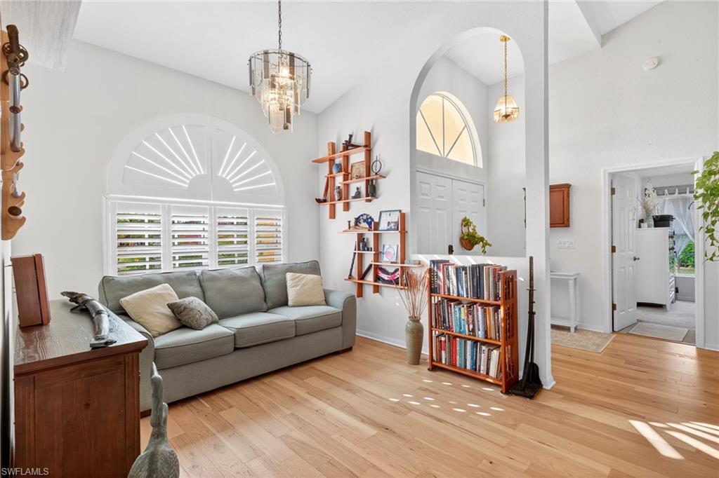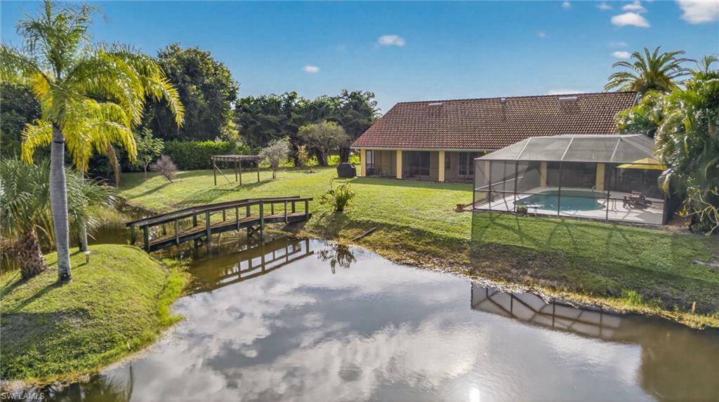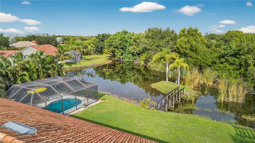 CAPTIVATING CASALS!! With its beautiful interior finishes, inviting private swimming pool, large 1.1 acre property and stunning lake with foot bridge and island, this home is sure to captivate you!!! Features of this beautiful home include soaring tall ceilings, lake views from nearly every room, new engineered wood floors throughout with cozy carpets in the bedrooms, updated grande kitchen with GORGEOUSLY UNIQUE HICKORY WOOD CONTERTOPS, gas range, stainless steel appliances and tiled backsplash; open concept family room with tall ceilings and tons of natural light, separate living room perfect for entertaining, beautiful master bedroom suite with fully remodeled en-suite bathroom featuring dual sink vanity and huge walk-in- shower with frameless glass enclosure, freshly renovated guest bathroom with new vanity and much more!! Additional features include, plantation shutters and/or custom window treatments throughout, upgraded fans and light fixtures, WHOLE HOUSE GENERATOR (2019), NEW AC (2021), NEW ROOF (2017), NEW POOL FINISH (2 to 3 years ago) and more!! Outdoors enjoy a super big circular driveway for plenty of parking, a large covered/trussed lanai for outdoor dining and entertaining, majestic solar and electric heated pool with peaceful views of the lake, fully irrigated lawn sourced from reclaimed water, 1.1 acre lot including a private foot bridge to your own little island, 500 gallon buried propane tank, and so much more!! Home is located in Bell Villa, a wonderful "hidden gem" community of custom homes on large lots that is both gated and guarded. Close proximity to the area's best shopping, dining, entertainment, Downtown Bonita Springs and white sand beaches!! Also, residents enjoy an optional amenity membership at Bonita Terra for only $400 per year which includes, 4 pools including a lap pool, pickleball, planned activities, events, gym, billiards, golf driving range, 10,000 sq. ft clubhouse, shuffleboard and more!! This property is priced to sell and offers a standout value opportunity!! Call for your private showing today!!