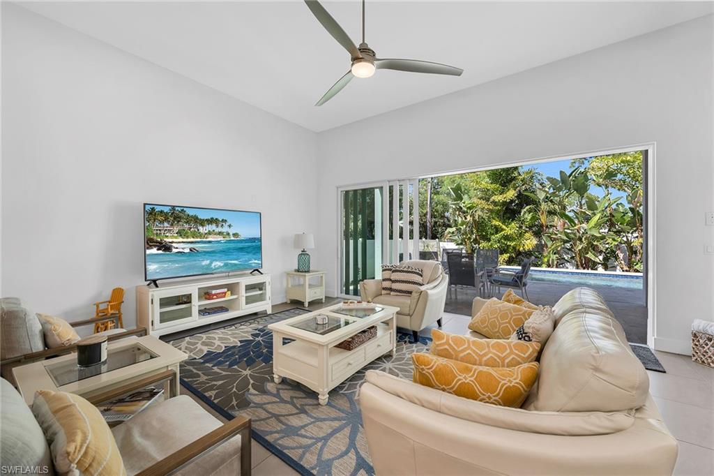 Built in 2019 and offered turnkey furnished, this stunning Naples Park residence combines modern coastal design with exceptional rental income potential. On a quiet cul-de-sac just minutes from Vanderbilt Beach and Delnor-Wiggins Pass, this beautifully maintained home offers an ideal blend of luxury, convenience and comfort. The expansive outdoor area showcases a saltwater heated pool with sundeck and a new 2024 pool pump, travertine deck, outdoor shower, covered living space, and a convenient pool bath with air conditioner, all surrounded by a fully fenced yard and lush green space behind and beside the pool for added privacy. Built by Coconut Bay Construction, this three-bedroom, two-and-a-half-bath home features solid core doors, impact glass windows and doors, volume ceilings, recessed lighting and modern ceiling fans throughout. The open-concept layout highlights the spacious living and dining areas flowing seamlessly to the lanai through sliding glass doors. The gourmet kitchen impresses with quartz countertops, tile backsplash, contemporary cabinetry, pendant lighting and stainless steel appliances including a range, microwave, new dishwasher and French-door refrigerator with icemaker. The serene owner’s suite offers direct lanai access through glass doors, a walk-in closet, and a spa-inspired bath with dual quartz vanities, a soaking tub and a frameless glass walk-in shower. Two additional guest bedrooms, one with a transom window, share a stylish full bath with a frameless shower enclosure. Additional features include a newer washer, security cameras for the front and garage, and a Tecno EV charger. The attached oversized garage accommodates 1.5 cars, offering extra storage space for beach gear or bikes. With no HOA fees and an unbeatable location near Naples best beaches, restaurants and shopping, this turnkey pool home offers an opportunity for luxury living and strong investment potential.
