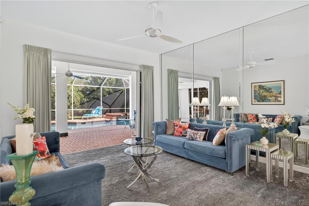 Take a walk on the WILD INDIGO side of a quiet cul-de-sac street located in the distinguished Longlake neighborhood. This custom home was designed by Jan Bates, one of the original builders in Pelican Landing. The private, lush tropical landscape view and substantial yard enhance the livability. This well-maintained home with clean lines and neutral décor is poised for a fresh start, boasting 2554 square feet of living space. Four generous bedrooms with three full bathrooms are ideal for your extended family and guests. The separate Living room and Family room with pocket sliding doors opening to the lanai focus on seamless entertaining. The wonderful outdoor space with well-appointed kitchen, pool and spa are Florida living at its best. Brick paver driveway, walkway and lanai elevate the style. There is plenty to charm seasonal and full time residents seeking a carefree lifestyle in amenity rich Pelican Landing with a pristine 34 acre gulf island beach park accessible by boat, tennis center with 12 lighted courts, bocce, pickle ball, fleet of Sailfish sail boats, Canoe and Kayak Park, boat ramp and fitness center