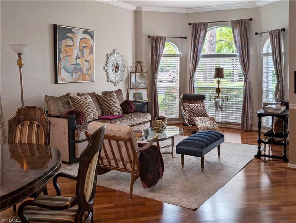 This 4 bedroom, 3 bath meticulously maintained home offers significant updates and expanded features for modern living. The open-concept floor plan features an eat-in kitchen with newer stainless steel appliances. Interior appointments include engineered wood floors, crown molding, and a main floor Master bedroom and bath. The primary suite and family room offer a sitting area and a secluded view of the beautifully landscaped rear yard. The garage has a Gladiator cabinetry system for organizing all of the items needing storage and optimizing the use of that space. Residents enjoy a heated resort-style pool, clubhouse, fitness center, billiards room, library and game room. The Shores is Ideally located near Gulf beaches and upscale shopping accompanied by fine dining on the famous 5th Ave. Home owners also benefit from low association fees. Hot wire communications is through-out The Shores. Additional services are available. Security alarm monitoring requires an extra fee. This home is a MUST SEE to be put on your list. The master bedroom and one guest bedroom are at ground level. The home is positioned on a cul-de-sac street with very little traffic. All windows have been coated with 3M hurricane film, rated for storm wind conditions. You won't want to miss viewing this fabulous single family home featuring a unique easy living floor plan. Chandeliers in family room, master bedroom and kitchen will not convey with the sale and closing of the home.
