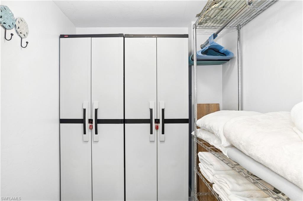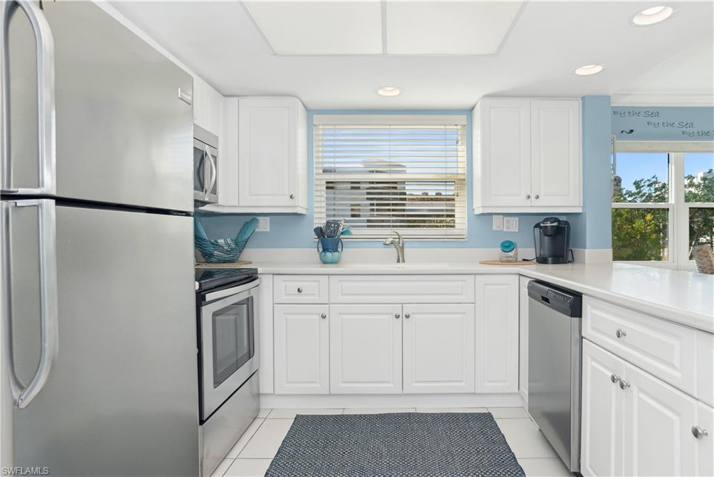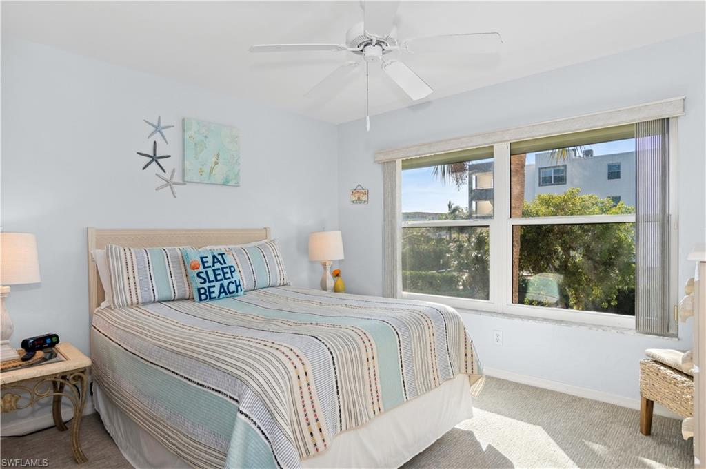 Rarely available and highly desirable three-bedroom West-facing end unit with weekly rental option to supplement your income! This beautiful coastal inspired condo is bright and cheerful with an unbeatable location. Two blocks to Marco Island's South beach entrance and 3 blocks to 9 restaurants, ice cream shop, movie theater, miniature golf, and boutique shops. Turnkey and in pristine condition, you will appreciate the attention to detail. Updated bathrooms, crown molding, newer AC and water heater in 2022, in-unit laundry, Impact glass AND shutters to name a few. This unit has additional south-facing double windows in the dining room and third bedroom along with a rare East facing 15 X 12 front patio and a large West facing screened lanai for sunsets. Covered parking with storage for beach toys! Large, heated pool with all day sun! Tennis courts, pickleball, bike parking and grill area. Elevator for your convenience. HOA fees include cable, internet, water, and sewer and more! This will check all the boxes