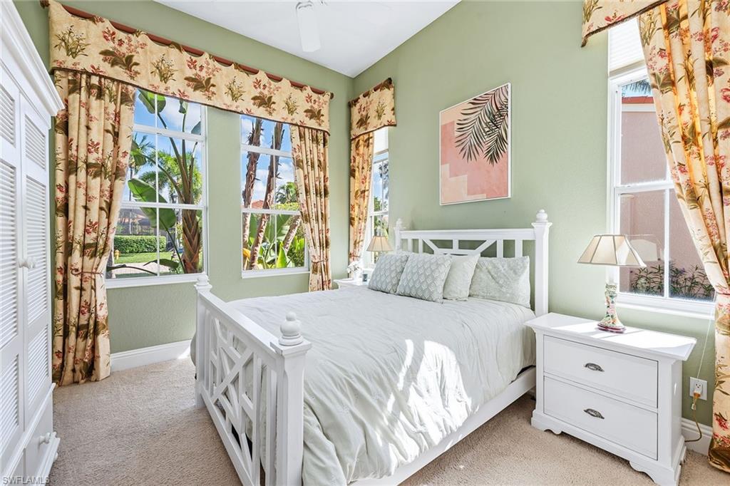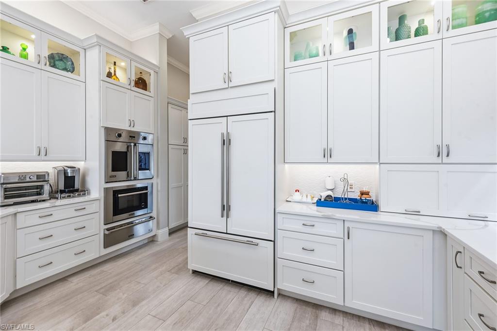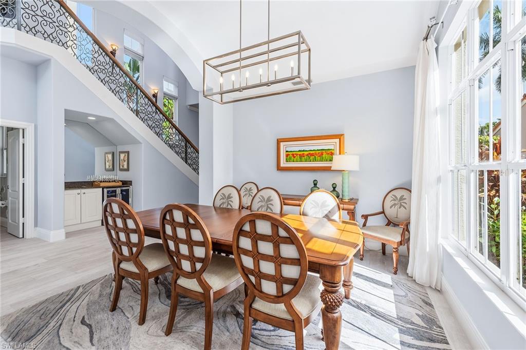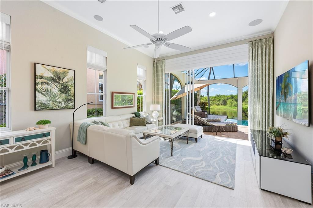 Rarely available, on the creek with private dock! Experience the ultimate in waterfront luxury with this beautifully designed two-story residence in the prestigious Bellagio village of Fiddler’s Creek, ideally at end of a private street with water on two sides, offering exceptional privacy and breathtaking wide-water views. Positioned directly on the Creek with its private dock for an electric boat, this home provides effortless access for sunset cruises, boating and fishing right from your backyard. With desirable southwest exposure, this home enjoys brilliant sunsets and natural light throughout the day. The outdoor area impresses with an expanded infinity-edge pool with a larger footprint than the norm, paved deck, screened enclosure with concrete columns and a covered lanai featuring a granite-topped summer kitchen with Lynx grill, sink and beverage refrigerator, blending relaxed living with the Naples indoor-outdoor lifestyle. Electric storm shutters cover all windows along the back of the home, providing added peace of mind. Inside, refined craftsmanship shines throughout, from the grand mahogany double-door entry to volume ceilings, arched walkways, crown molding, recessed lighting and wood-look porcelain tile floors. The chef’s kitchen impresses with sleek white cabinetry, quartz countertops, glass-front displays and premium Viking stainless steel appliances, including a gas cooktop, convection oven, steamer, warming drawer and paneled refrigerator. Additional features include a KitchenAid trash compactor and an Insinkerator instant hot water system, making this kitchen as functional as it is elegant. A bright breakfast area overlooks the water, while the adjacent family room impresses with built-in speakers, electric blinds and glass sliders opening to the lanai. A formal dining area and an elegant living room, complete with arched transom windows and a wet bar featuring a granite countertop, sink, and TCL beverage refrigerator, create a seamless flow for entertaining. A convenient powder bath off the hallway near the living room adds comfort and functionality for guests. The main level also includes a tranquil owner’s suite with two walk-in closets fitted with wood shelving and a luxurious en-suite bath offering a quartzite vanity with dual sinks, a makeup area, framed mirrors, a soaking tub and a glass-enclosed walk-in shower. A spacious guest bedroom and private den with custom finishes share a stylish Jack and Jill bath with a glass-enclosed shower. Upstairs, an elegant staircase leads to two guest suites, each with an en-suite bath, and a tiled balcony overlooking the pool and tranquil creek. Additional highlights include a Savant home automation/ security system offering 24-hour monitoring and control of lighting, front door and pool temperature, impact glass, tile roof, 2022 water heater, 2021 HVAC and an air-conditioned garage. Enjoy the exceptional amenities of Fiddler’s Creek!