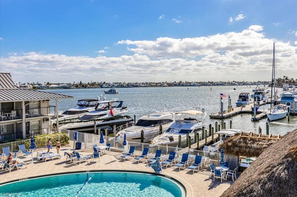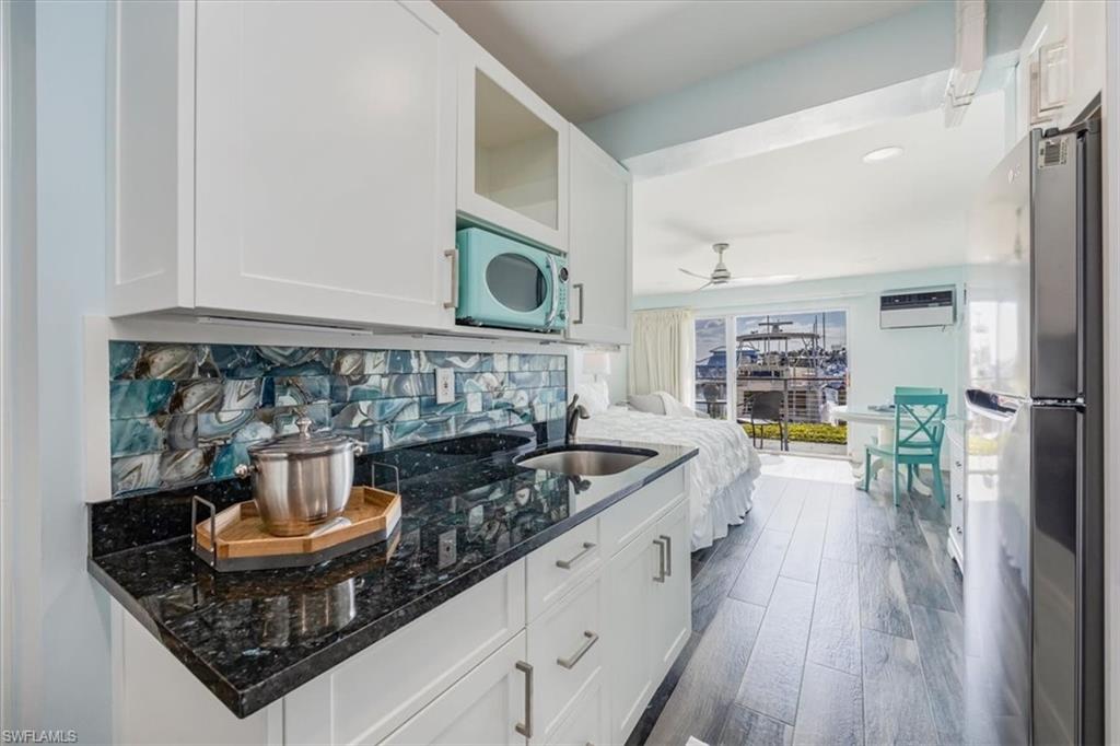 This rarely available, corner, end unit has so much to offer, from being completely renovated to its picturesque views of Naples Bay and the prime location in historic Old Naples. The kitchen combines function and character, with a larger refrigerator, 4-burner stove top, granite counter tops, and fun microwave and backsplash. The bathroom has been updated to include an additional closet, contemporary glass shower doors and tile, and granite vanity top. Other features include a tile floor, attractive furnishings, and sheer and room darkening draperies, storage locker. One of the more special upgrades is the aluminum panel water barrier system by Garrison that is effective and simple to install. For additional sleeping space the chair converts to a single bed and includes the linens. The Cove Inn on Naples Bay is a quintessential get-away home, as well as an opportunity to earn rental income. Owners automatically have membership to the exclusive Cove Yacht Club which provides use of the coveted private Chickee Bar. Amenities also include beach chairs, umbrellas and pool towels available for check-out, on-site laundry facilities, complimentary WiFi, a business center, and for a nominal fee bike rentals and a pass for access to the NCH Briggs Wellness Center. The Cove Inn' s Coffee Shoppe is also well known among locals for its delicious, classic, American breakfast. The ideal location is adjacent to the Boathouse, the Dock and other Crayton Cove restaurants, and less than a mile to downtown Naples’ bustling shops, restaurants and festivities, not to mention its famous Gulf of Mexico beaches.