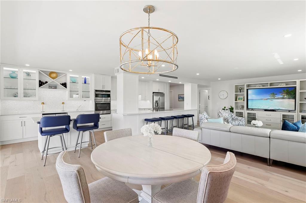 Captivating Gulf views and freshly redesigned interiors showcase a contemporary coastal design with a current open-concept floorplan. Fully renovated in 2022, this beachfront corner unit in Regency Towers is light, bright, and effortlessly inviting. The three-bedroom, three-bath layout and expansive covered screened balcony capture southwest sunlight and spectacular sunset views over the pool and beach. A reimagined kitchen anchors the great room with crisp white cabinetry, quartz countertops, island seating, GE Profile induction cooktop, wall oven, and a custom bar extension with built-in beverage fridge, seamlessly blending functionality with entertaining ease. Additional upgrades include a whole-unit water filtration system, solar-powered lanai shades, custom California Closets, and impact-rated windows and doors. The primary suite offers a serene retreat with a newly designed walk-in closet and beautifully finished bath, complemented by two generous guest rooms, each with access to a full bath. Other highlights include in-residence laundry, one under-building garage space, and private storage space. Offered furnished with few exclusions. Regency Towers is home to only 40 residences across two buildings, offering direct beach access, a newly updated beachside pool and spa, modernized social room, fitness center, grilling area, and on-site management. Ideally located along Gulf Shore Boulevard, moments from Venetian Village and minutes to downtown Naples.