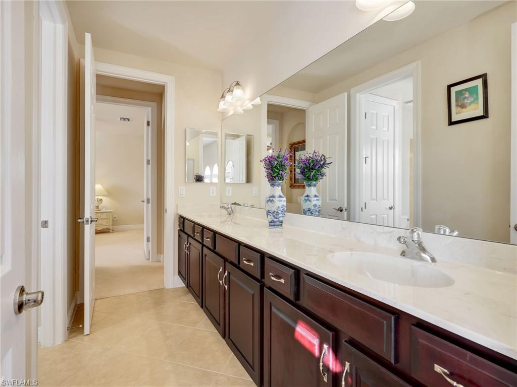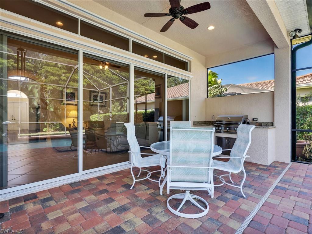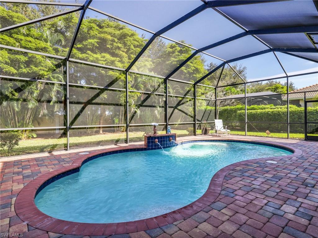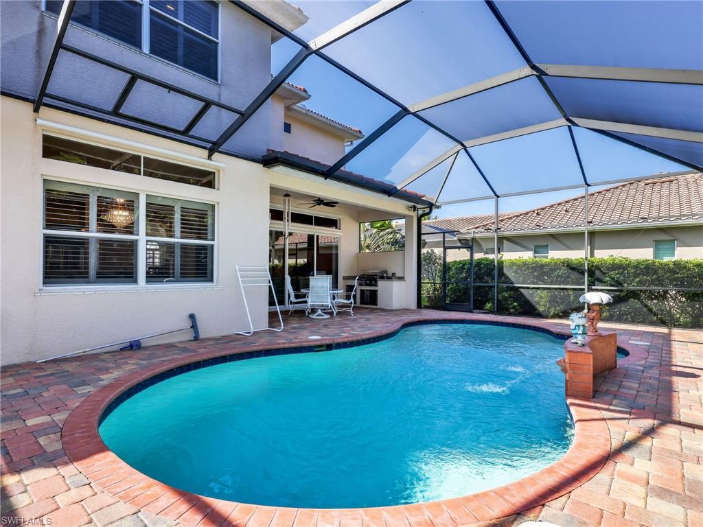This elegant Toll Brothers estate in Belle Lago offers over 4,000 square feet of refined living space designed for comfort, flexibility, and style. With 5 bedrooms, a media room, and 4.5 baths, the layout easily accommodates multi-generational living. A first-floor suite with a private bath provides a comfortable retreat for visiting guests or a private home office—offering privacy and convenience within the main level. Inside, soaring 20+ foot ceilings, abundant natural light, and timeless architectural details create a sense of grandeur and ease. The main living areas include a formal living room, formal dining room, and a spacious family room that flows into an open kitchen with granite countertops, a natural-gas cooktop, and a large breakfast area ideal for casual dining and connection. Each bedroom offers a walk-in closet—an uncommon luxury in Florida homes. With extra insulation, newer A/C units, and a whole-home reverse-osmosis system, this residence balances elegance with efficiency. Outdoor living shines on a private, beautifully landscaped lot featuring a heated pool, dedicated pool bath, outdoor kitchen, and an expansive Super Screen-enclosed lanai offering superior durability and the perfect setting for year-round relaxation or entertaining, complemented by an oversized 3-car garage with extra storage space. Belle Lago is a natural gas community known for its active lifestyle, natural beauty, and prime Estero location west of I-75 in preferred Flood Zone X (no flood insurance required) and no CDD. Residents enjoy pickleball, tennis, bocce, a fitness center, clubhouse, pool, and scenic walking paths surrounding tranquil lakes. A private golf-cart path connects directly to neighboring Estero Country Club, where membership has no waitlist. Meticulously maintained and move-in ready, this estate delivers luxury, value, and lifestyle in one of Estero’s most desirable communities—now offered at the lowest price per square foot in Belle Lago.
