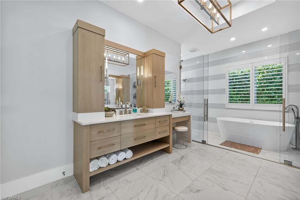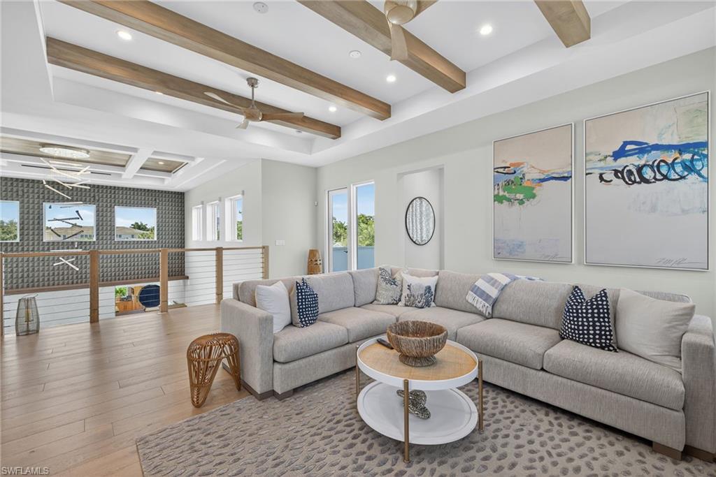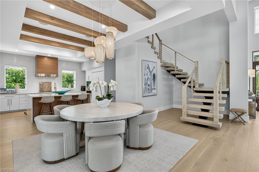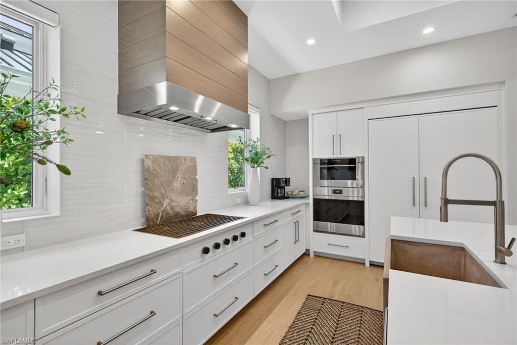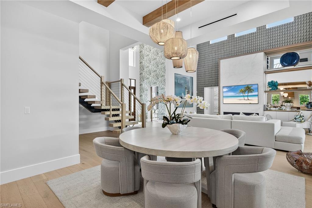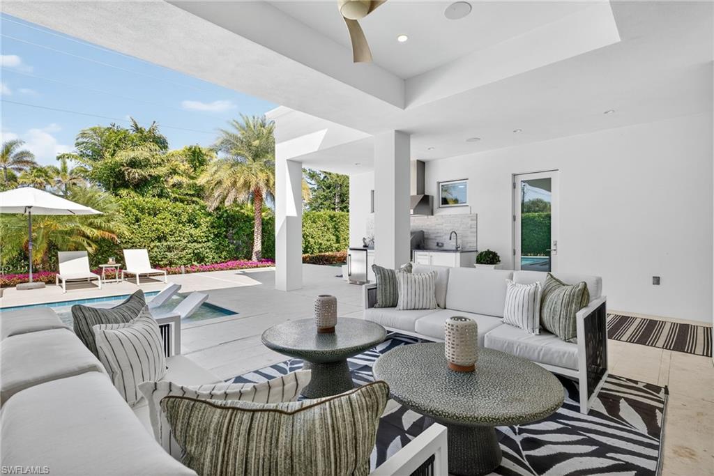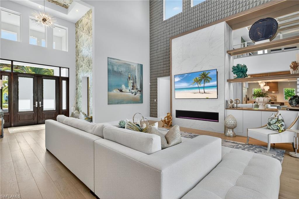 Just steps from the Gulf, this exceptional coastal contemporary residence offers the perfect blend of refined style and relaxed Naples living. Designed through the collaboration of Integral Builders, Lotus Architecture, and L1 Design, this two-story masterpiece spans over 4,100 square feet of sophisticated living space. A grand entry introduces the home’s light-filled interior, where soaring 22-foot ceilings and expansive glass walls create an effortless indoor-outdoor flow. The open-concept design centers around a dramatic great room with a striking feature wall and fireplace, seamlessly connected to a dining area and an elegant chef’s kitchen. Outfitted with Wolf and Sub-Zero appliances, an impressive waterfall-edge island, and a spacious walk-in pantry, the kitchen combines beauty and function in perfect harmony. The first floor features two serene bedroom suites, including a luxurious primary suite with shiplap ceiling detail, a spa-like bath, dual closets, and private access to a sunlit terrace. A dedicated study with sliding barn doors provides an ideal work-from-home retreat. Upstairs, guests are treated to two additional en suite bedrooms, a comfortable loft lounge, and a balcony overlooking the pool. Outdoors, the home’s resort-inspired design continues with a covered lanai, outdoor fireplace, full summer kitchen, and a sparkling pool and spa—an entertainer’s dream. Completing the property is a 4 bay garage, ideal for car enthusiasts or extra storage. Originally crafted as a model residence, this home showcases elevated design elements and thoughtful architectural details throughout—a stunning statement of coastal luxury just two blocks from the beach.