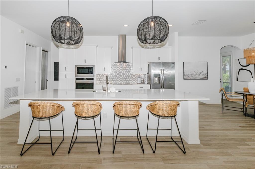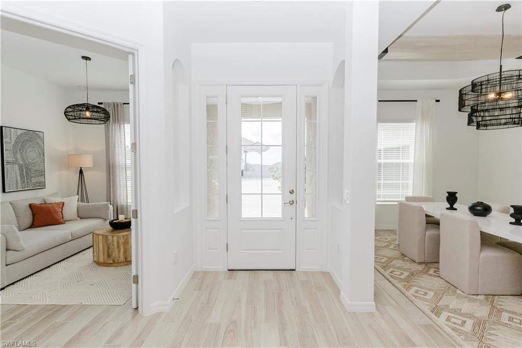 Golf membership included! Welcome to this beautifully appointed Napoli II home located in the prestigious National Golf & Country Club at Ave Maria. This stunning residence combines luxury, comfort, and resort-style living in one of Southwest Florida’s most desirable golf communities. Featuring 3 bedrooms plus den and 2½ bathrooms, this home offers an open-concept layout with elegant finishes throughout. The gourmet kitchen is equipped with quartz countertops, stainless steel appliances, a beautiful backsplash, and a large center island—ideal for entertaining family and friends. The dining room and primary bedroom showcase wood ceiling beams, and upgraded lighting throughout the home adds warmth and sophistication at every turn. Enjoy seamless indoor-outdoor living with a huge screened lanai featuring ample covered outdoor space, a sparkling heated pool, and spa overlooking serene lake and golf course views. The primary suite offers a spa-like bathroom and generous walk-in closet, while the split guest rooms ensure privacy and comfort. Being offered furnished, it's truly move in ready. Residents of The National enjoy a golf cart–friendly community with regular social events and access to an 18-hole championship golf course designed by Gordon Lewis, plus world-class amenities including a resort-style pool, fitness center, tennis and pickleball courts, spa services, dining, and more. Beautifully furnished and ideally located near the Ave Maria Town Center, schools, shopping, and dining, this home offers the ultimate Florida lifestyle — right here at The National Golf & Country Club.