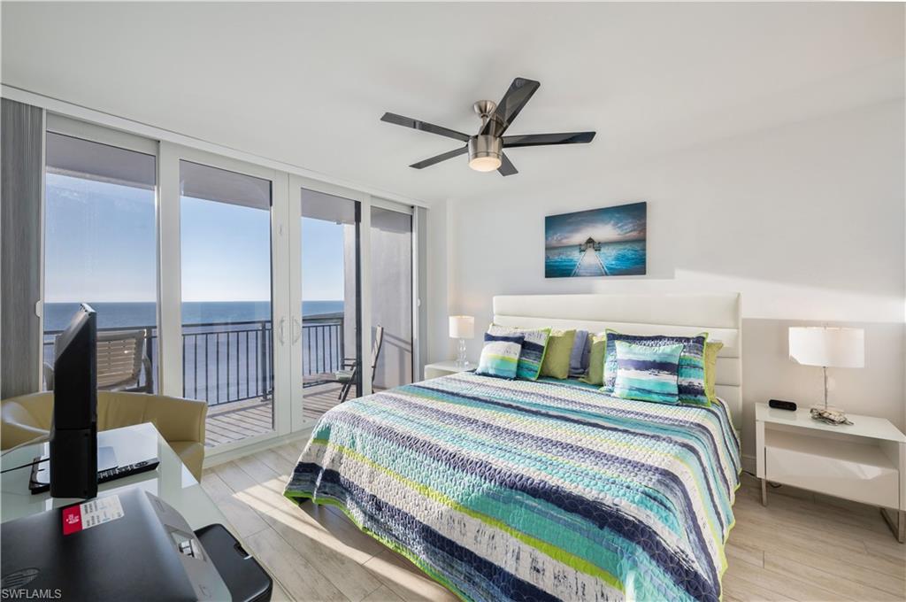 Welcome to this luxurious Tradewinds Penthouse Paradise with 180° views of Marco's fabulous Crescent Beach & Gulf of America. The perfect place to relax, enjoy the warm sand, sunshine, refreshing ocean waters & cooling trade winds. This top-floor Penthouse affords higher ceilings, privacy and tranquility with luxury & style. Turnkey furnished in coastal contemporary decor, a nicely appointed kitchen with Bosch & Samsung stainless steel appliances and a large living & dining room. The bedroom offers a king bed, full en-suite bathroom with a walk-in shower as well as a walk- in closet. (Half bath in the main living area) The spacious, lanai boasts unparalleled views with privacy walls on each side. Updated electric panel & wiring. Tradewinds offers a resort style pool, BBQ area, community beach access, covered parking & extra storage. Seller is a licensed real estate agent.