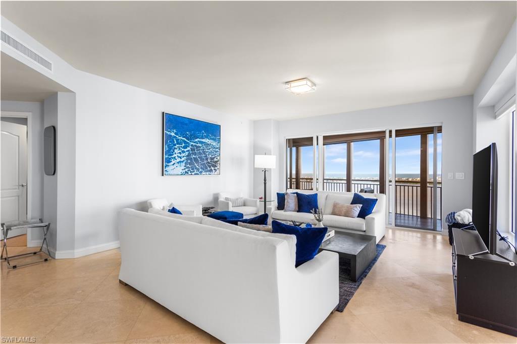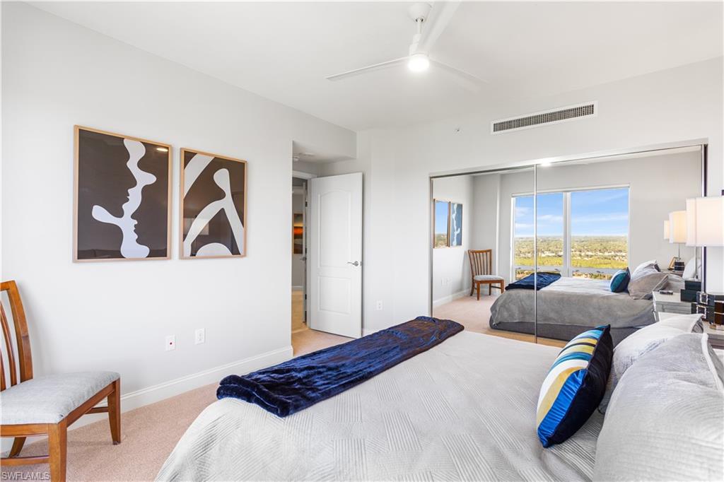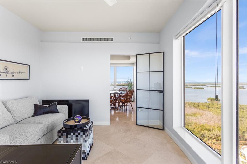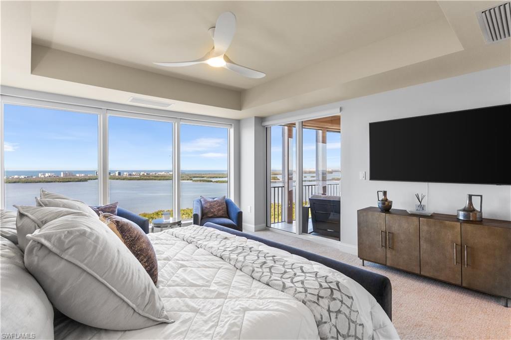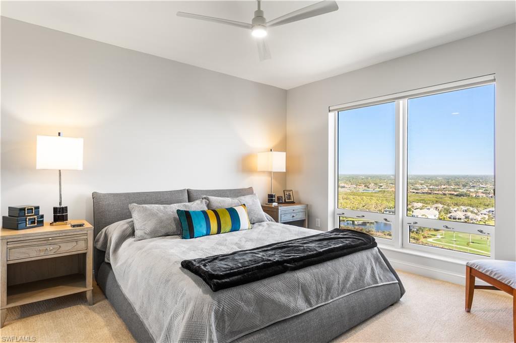 Welcome to this spacious 20th-floor end unit in Estancia at Bonita Bay, with UNPARALLED, breathtaking panoramic views of golf courses (eastern and western views), Estero Bay, and the Gulf of Mexico. Enjoy sunset views night after night - winter never felt so good! With three bedrooms plus a den/office and amazing resort style amenities, this stunning home combines refined elegance with everyday livability in one of Southwest Florida’s most sought-after communities. An abundance of natural light fills the open-concept living spaces, enhanced by floor-to-ceiling windows in every room capturing sweeping vistas from sunrise to sunset. The living area offers effortless flow to the expansive lanai, perfect for entertaining or relaxing while enjoying serene coastal views. The gourmet kitchen showcases Monogram stainless steel appliances, including an induction cooktop, oven, refrigerator, and microwave, complemented by granite countertops designed for both style and function. The primary suite is a private retreat featuring direct lanai access, two spacious walk-in closets, and electric shades. The primary bath includes dual sinks, a large jetted soaking tub, and a walk-in shower. Two guest bedrooms provide exceptional comfort, both with ensuite bathrooms, and plenty of closet space. The den offers a flexible space with astounding views. There are two dining areas - one is more formal and elegantly accented with a custom ceiling detail, while the other is just off the kitchen and perfect for everyday dining. The laundry room includes a utility sink for added convenience. Recent upgrades include new windows in all bedrooms, two AC units (2022), and a new hot water heater (2025), ensuring modern comfort and peace of mind. Residents of Estancia enjoy an amenity-rich lifestyle featuring a resort-style pool and spa, fitness center, guest suites, and club room, along with access to Bonita Bay’s unparalleled offerings—a private beach park, pickleball, tennis, kayaking and canoeing, miles of walking and biking paths, community parks, and a full-service marina and waterfront restaurant. Optional club memberships provide access to five championship golf courses, fine dining venues, and an expansive sports complex. Perfectly located near world-class shopping, dining, and beaches, and just a short drive to RSW International Airport, this exceptional home invites you to experience the very best of Southwest Florida luxury living—ideal as a seasonal retreat or year-round residence.
