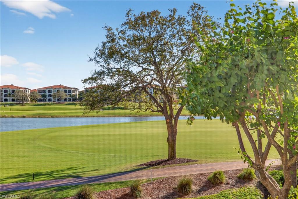 IMMEDIATE GOLF MEMBERSHIP AVAILABLE AT CLOSING! Skip the waitlist and start enjoying the award winning Greg Norman/Pete Dye designed course at TALIS PARK! This captivating TURNKEY condominium features a GOLF COURSE VIEW overlooking holes #4, #3 and #2 and the sparkling lake, a timeless primary suite with hardwood floors in the bedroom and in the custom closet, dual sinks, a bathtub and separate large shower. The captivating great room is impeccably decorated in a neutral decor which blends seamlessly with the soft white cabinetry in the chef inspired kitchen. A natural gas cooktop is a bonus as is the built in bar with both a wine and beverage refrigerator. Two ensuite guest rooms, a den/office with warm hardwood floors/private screened balcony and a lovely powder room combine for a condominium that lives like a true home with 2950 SF of air conditioned living space! The 700 SF wraparound screened loggia can be accessed from the corner sliding doors in the great room, the kitchen or the primary bedroom creating a perfect place to bring the outdoors inside while entertaining a group, dining al fresco or enjoying your morning coffee! An additional storage room in the garage is fitted with a dehumidifier. Two deeded garage parking places are also included in this graceful "lock and leave" residence. Carrara residents and their guests have the use of the private pool on the street and the grill area. In addition to the spectacular golf course, Talis Park residents enjoy the award winning clubhouse (formal and informal dining), Fiona's casual dining with a pizza oven, the Casa Cortese at the practice range with an outdoor bar and indoor golf simulator, fitness center, spa, bocce, pickleball, tennis, two dog parks, a large community pool, playground and peaceful walking/running paths. The expansive social calendar is sure to impress with something for everyone. Located between Olde Naples and RSW Airport, it's a premier locale. Shopping, dining and beaches are also in close proximity.
