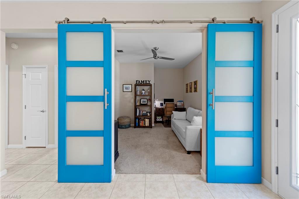 Welcome to Tidewater, where this attached villa by Pulte, is located in an active Del Webb 55+ community, in the heart of Estero. This home has been meticulously cared for, and offers 2 Bedrooms + Den w/custom Barn Doors, 2 Baths, and a 2-car attached garage with Epoxy flooring. Updates since sellers purchased property in 2021: A/C replaced 2023, a 18 kw Generator installed 2023, Accordion Shutters that cover all windows and the sliding door to lanai, the front door is a beautiful Custom Designed Impact Resistant door with a Modern Designed Glass insert, Plantation Shutters throughout home, an Electric Roll Down shade for sliders to lanai, and more! This spacious, light and bright interior offers, a kitchen w/granite countertops, tile backsplash, stainless appliances, a pantry and natural gas for cooking. The split bedroom floor plan provides ideal privacy between the guest room and your spacious master suite. The master en-suite has an oversized walk-in shower w/seamless glass enclosure, dual sinks, linen closet and large walk-in closet. Outside, the screened lanai, offers a covered area to relax or entertain in the shade. Tidewater by Del Webb, is in Estero's premier 55+ community! The award-winning amenity center, offers bocce, Pickleball, tennis, a resort-style pool, a full-time social director and more! This active community offers the perfect location in Estero. Close to RSW Airport, Miromar Outlets, Hertz Arena, I-75... and more. Welcome home!