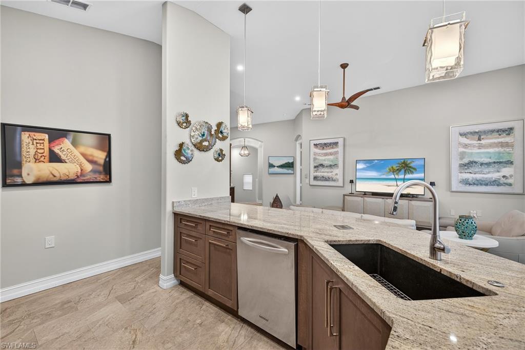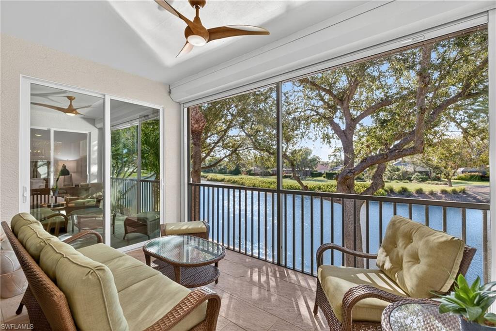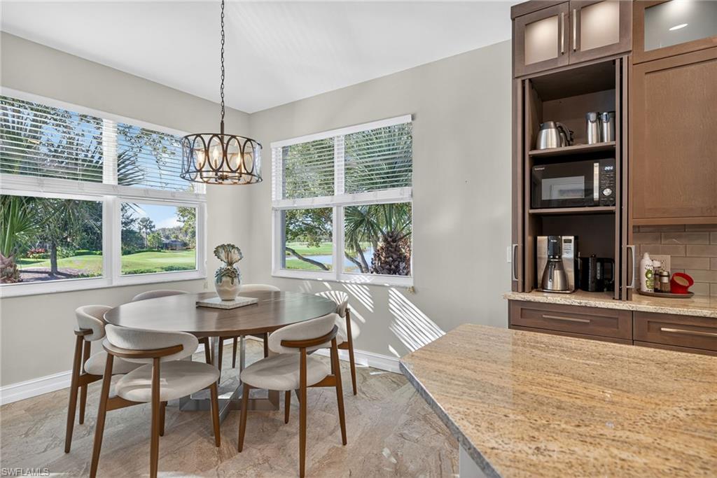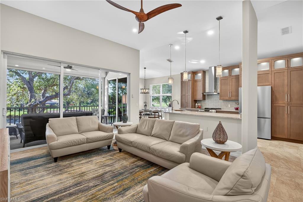 Step into this meticulously updated end unit coach home in Pelican Sound, Southwest Florida's premier bundled golf community. Beautifully updated and tastefully decorated, featuring ceramic tile in the living areas and stairs, and luxury vinyl flooring in both the primary and guest bedroom. The spacious living room boasts a built-in bar with wine cooler, recessed lighting, and elegant pocket doors—perfect for entertaining. The updated kitchen shines with brand new LG stainless steel appliances, granite countertops, gorgeous rich gray cabinetry, a pantry with pull-out shelves, designer lighting, and is completely open to the living area. The primary suite offers a tray ceiling, lanai access, and a luxurious bath with a seamless glass shower door, dual sinks with pull-out shelves below, and touch-light mirrors. The guest bedroom is adjacent to the guest bath, and offers privacy for visiting family and friends. The den/flex room offers a pull out couch for extra sleeping space when needed. The tiled lanai is a relaxing retreat, with wonderful lake and golf course views through the new "noseeum" screens. Additional upgrades include electric hurricane shutters on the lanai, new impact windows and sliders, a 2022 LG washer and dryer, a 2024 tankless water heater, a 2022 A/C system, and a 2023 roof. This home combines style, comfort, and peace of mind— plus an attached one car garage, perfect for your golf cart! If you are looking for an active lifestyle look no further: 27 holes of Championship golf, 14 pickleball, 8 tennis and 6 bocce courts. State of the art fitness center that is professionally staffed. Pelican Sound is nestled up to the Estero River with access to the Gulf. The community offers dry boat storage, kayaks, canoes and paddle boarding, along with a shuttle boat to Lovers Key State Beach Park. Minutes from RSW International airport and surrounded by fabulous shopping and restaurants. Start Living The Dream!