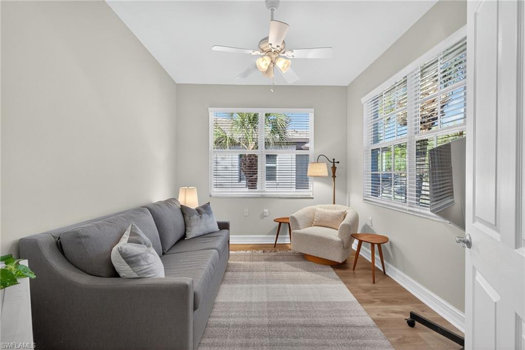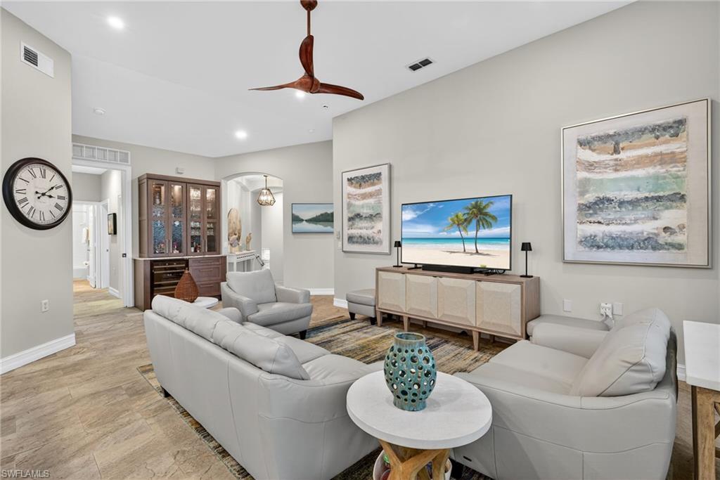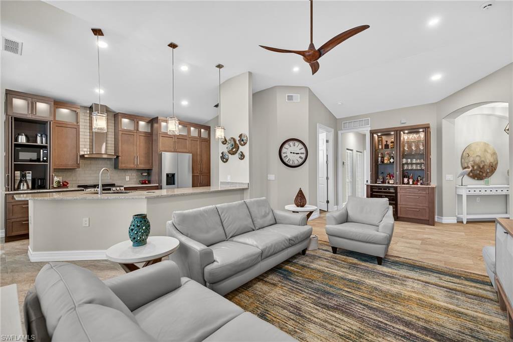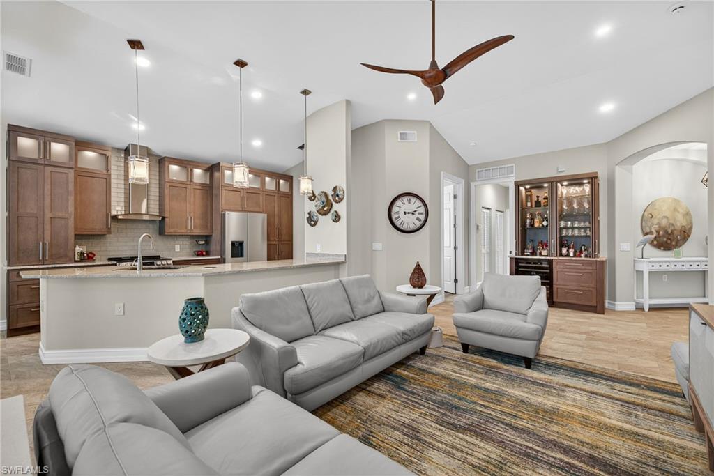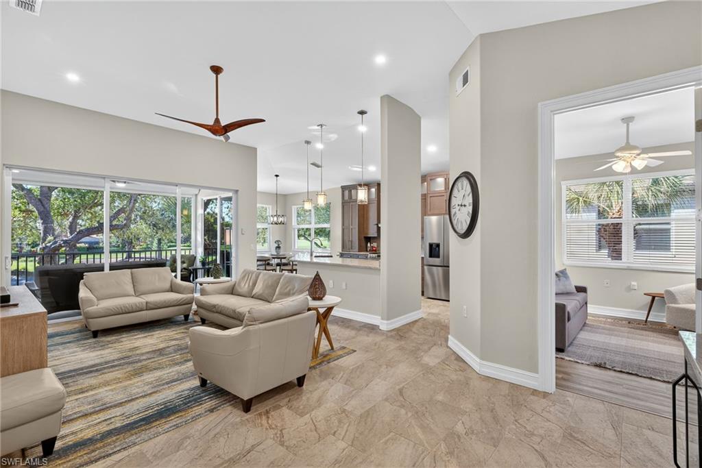 Step into this meticulously updated end unit coach home in Pelican Sound, Southwest Florida's premier bundled golf community. Beautifully updated and tastefully decorated, featuring ceramic tile in the living areas and stairs, and luxury vinyl flooring in both the primary and guest bedroom. The spacious living room boasts a built-in bar with wine cooler, recessed lighting, and elegant pocket doors—perfect for entertaining. The updated kitchen shines with brand new LG stainless steel appliances, granite countertops, gorgeous rich gray cabinetry, a pantry with pull-out shelves, designer lighting, and is completely open to the living area. The primary suite offers a tray ceiling, lanai access, and a luxurious bath with a seamless glass shower door, dual sinks with pull-out shelves below, and touch-light mirrors. The guest bedroom is adjacent to the guest bath, and offers privacy for visiting family and friends. The den/flex room offers a pull out couch for extra sleeping space when needed. The tiled lanai is a relaxing retreat, with wonderful lake and golf course views through the new "noseeum" screens. Additional upgrades include electric hurricane shutters on the lanai, new impact windows and sliders, a 2022 LG washer and dryer, a 2024 tankless water heater, a 2022 A/C system, and a 2023 roof. This home combines style, comfort, and peace of mind— plus an attached one car garage, perfect for your golf cart! If you are looking for an active lifestyle look no further: 27 holes of Championship golf, 14 pickleball, 8 tennis and 6 bocce courts. State of the art fitness center that is professionally staffed. Pelican Sound is nestled up to the Estero River with access to the Gulf. The community offers dry boat storage, kayaks, canoes and paddle boarding, along with a shuttle boat to Lovers Key State Beach Park. Minutes from RSW International airport and surrounded by fabulous shopping and restaurants. Start Living The Dream!