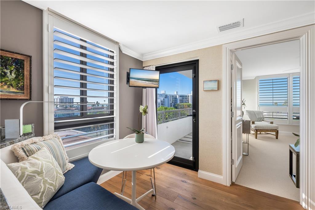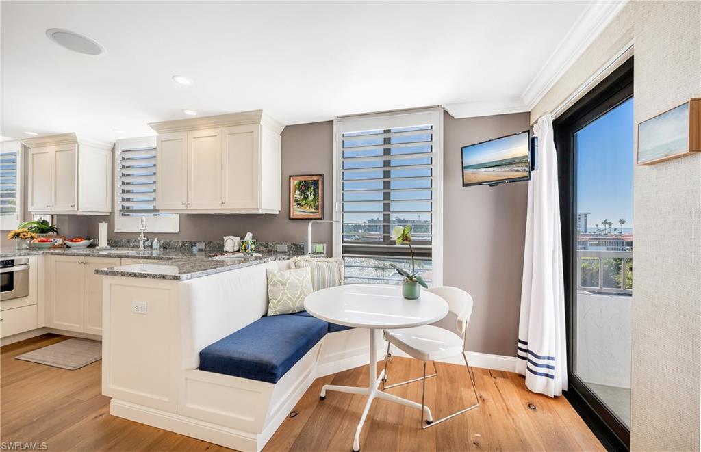 Welcome to the resort lifestyle in the bay and beachfront neighborhood of Admiralty Point. This fifth floor corner home is located on the prime southern side of the building and has panoramic water views of the bay, Doctor’s Pass and the Gulf! See the rising sun and sunsets all from your home while you watch the dolphin and boaters going to and from the Gulf of Mexico. This three bedroom home with an open floor plan, is ideal for entertaining and offers large windows with fantastic natural light. It has been thoughtfully designed with wide plank floors, gourmet kitchen, granite counters, high end appliances, custom cabinets and a cozy banquette by an open balcony. Custom shutters, remote blinds, built-ins, split bedrooms, custom closets all enhance this beautiful home. The primary suite has dual sinks, two walk in custom closets, separate shower and tub. Additional storage and one car garage are attractive features. Admiralty Point sits on 10 acres and has extensive amenities including boat docks for lease, direct beach access, pools (bayside and gulfside), two clubhouses, spa, BBQ, exercise room, Har-Tru tennis courts, shuffleboard, vehicle wash area, and winding paths for all resident’s enjoyment. Located between 5th Avenue and Venetian Village it is close to all the top rated dining and shopping pleasures offered in Naples. A wonderful place to call home!