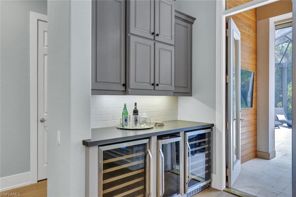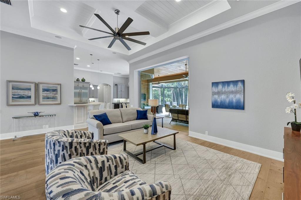 Where Indoor-Outdoor Living Takes Center Stage. Sited on an oversized 24,000-square-foot lot, this sprawling ranch-style residence is designed to erase the boundaries between indoors and out. Light-bathed interiors rise to 12–14 ft ceilings, while a 22-ft great room dissolves completely via telescoping sliders—opening the home to uninterrupted views of lush tropical foliage beyond the expansive lanai. A sophisticated reimagining has transformed the open-concept plan, blending a chef-inspired kitchen with walk-in pantry, morning-room banquette, and wine bar into seamless living and dining spaces—perfectly attuned to an indoor–outdoor lifestyle. Warm wood floors, custom ceiling details and refined wall treatments along with stylish remodeled bathrooms create a modern yet welcoming ambiance. Offering 4,132 AC sq ft on one level, the home features four ensuite bedrooms, two half baths, and an office with walk-in closet that flexes effortlessly into a fifth bedroom. XL walk-in wardrobes with custom systems and generous closets throughout elevate everyday luxury. Outdoors, a renovated saltwater pool and spa—both gas-heated—anchor a travertine lanai deck framed by a new panorama-panel screen enclosure. New landscaping blends naturally with the preserve backdrop, adding to the home’s beautiful surroundings and peaceful privacy. With no homes across the street, serene lake and golf views unfold to the south, while a long paver drive, double-wide motor court, and side-entry three-bay garage enhance the home’s impressive curb appeal—punctuated by a new tile roof. Recent upgrades include motorized Storm Smart screens, new Pentair pool equipment, new HVAC and water heating systems, an Aquakleen reverse osmosis system, new window treatments incl. motorized Hunter Douglas shades, and more. Located within Collier’s Reserve—less than 2 miles to Vanderbilt Beach at Wiggins Pass—residents enjoy a gated, highly coveted Audubon Sanctuary community with world-class golf, active tennis and pickleball programs, fitness & wellness, bocce and kayaking, multiple dining venues and a vibrant social calendar, complemented by a distinctive commitment to environmental stewardship.