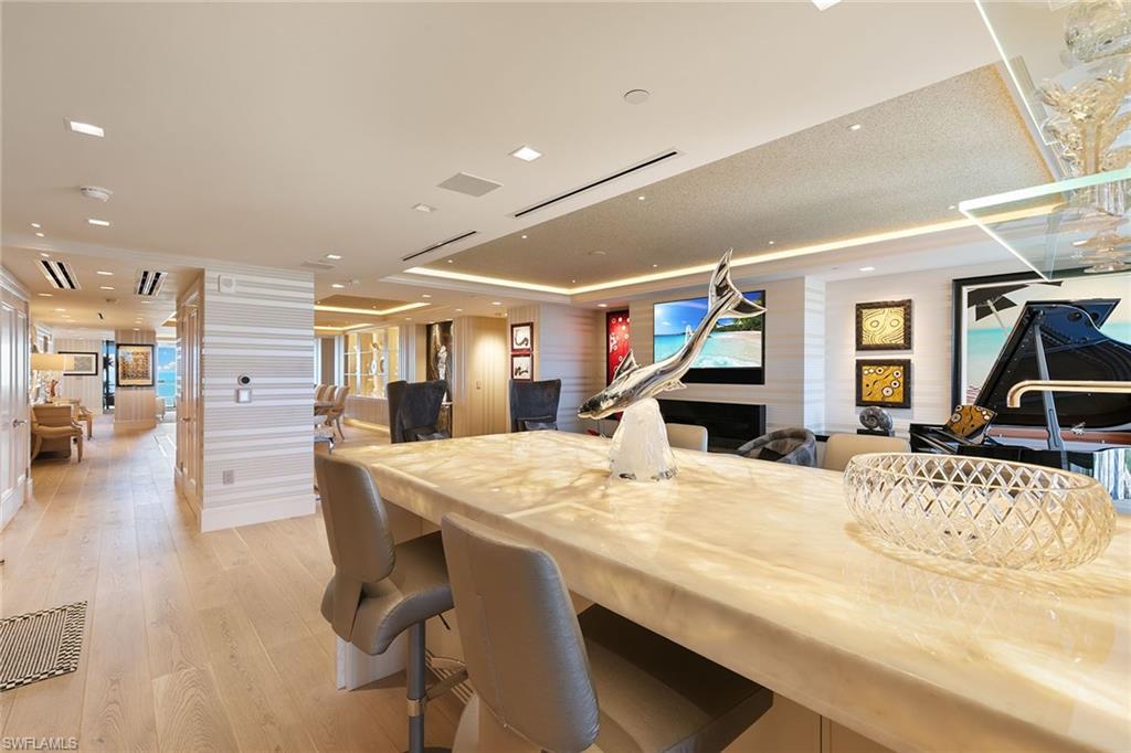 Coastal luxury at Mystique in Pelican Bay. Perched on the 12th floor of Pelican Bay’s newest and most exclusive high-rise, Mystique, this extraordinary residence offers sweeping views of the Gulf and unforgettable sunsets framed by expansive floor-to-ceiling windows. Every detail of this home exudes sophistication and timeless elegance. A renowned interior designer has curated a stunning palette highlighted by exquisite wall and ceiling coverings, custom lighting and Legno Bastone Italian wood flooring. The pristine white kitchen is a showpiece of modern refinement, featuring Carrara marble countertops and a striking black-and-white tile backsplash. The den/piano lounge features a dramatic backlit Crystallo bar with Crystal sink and custom marble fireplace. Pocketing doors open at the touch of a button in this smart home with custom Lutron system. No expense has been spared in creating this extraordinary coastal sanctuary. Residents of Mystique enjoy the ultimate in five-star living with 24-hour concierge service, and an array of world-class amenities. Within the private Pelican Bay community, indulge in exclusive beach access with two beachfront restaurants and bars, chair and umbrella service, tennis and pickleball courts, a state-of-the-art fitness and wellness center, and miles of scenic recreational and biking trails. Just moments from Artis-Naples and Waterside Shops, Mystique offers a lifestyle of unmatched convenience, culture and sophistication. This is more than a residence, it’s an elevated way of life on the Gulf.