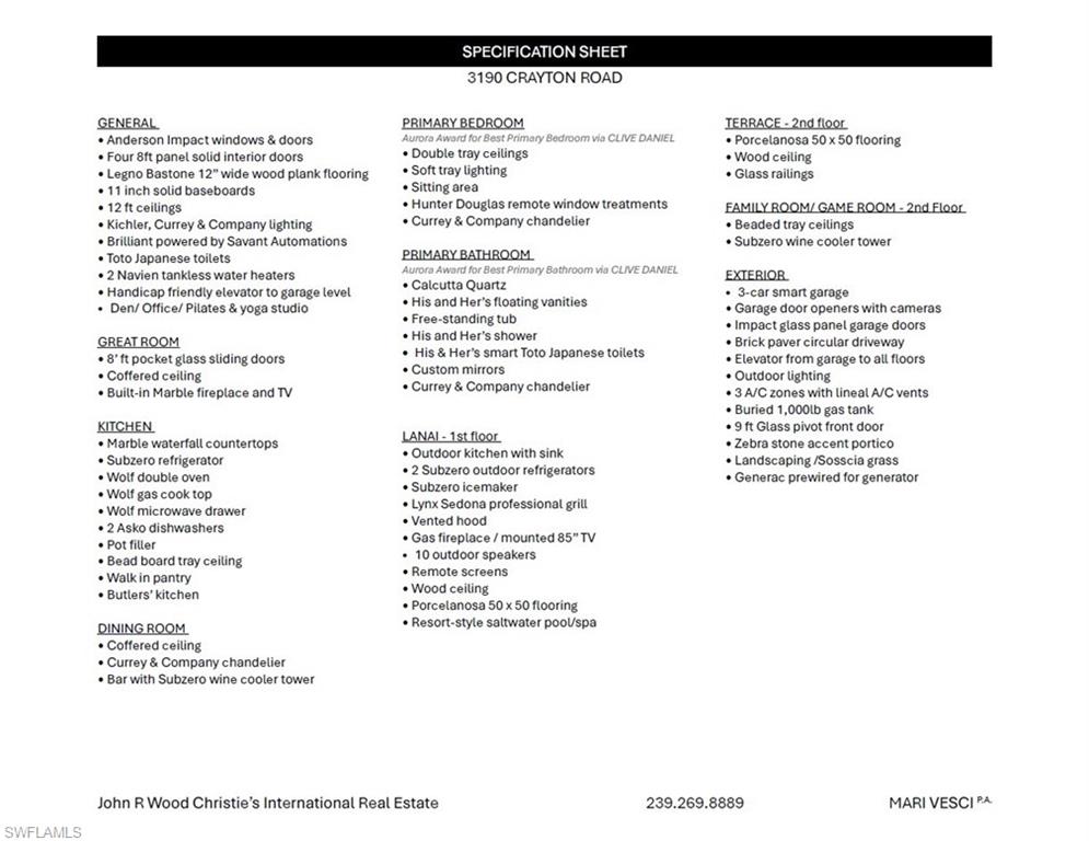 Stunning 2023 custom built home meticulously designed by Clive Daniel and Robb & Stucky interiors, furniture negotiable and features 5 bedroom/en suites, plus a Pilates/yoga studio. CHECK OUT THE VIDEO! This home is designed to be handicap friendly with an elevator that takes you from the garage level up to the main floor and second floor of the home, perfect for heavy lifting. The primary bedroom features his and her walk-in California Closets, a large walk in shower, a free standing tub, electric blackout hunter Douglas shades and 2 private Japanese smart toilet rooms. Entire home offers an array of technology throughout and is powered by Savant Automations’ new *brilliant smart home system* with video audio and sound controlled from every area of the house linked to your smart phone. As you walk through this well thought out floor plan, you will find an expansive family room with floor to ceiling Anderson pocket sliding glass doors that allows plenty of natural light with wide plank legno bastone flooring throughout. The family room will lead you into the oversized Chef's Kitchen with Sub-Zero Wolf and Asko Appliances with a full butler's pantry and 2 sub zero wine towers with 4 refrigeration drawers. The second floor offers 3 en-suites with private balconies along with a large bonus room that can be used as a home theatre set up or game room. Relax by your Resort Style salt water pool/spa surrounded by Brazilian trees while enjoying the Florida weather that also features a 900 sq foot lanai area with electric roll down screens and shutters, a fireplace, mounted 85” TV with 10 outdoor speakers perfect for entertaining. A built-in summer kitchen with outdoor subzero refrigeration and ice maker. This Moorings masterpiece has it all and touched by all. Within minutes to Historic Downtown Naples, white sugar Sand Gulf Beaches, and all that Naples has to offer! Just 1.5 miles to four seasons and waterside shops. Truly a rare find! 12 Foot Elevation.