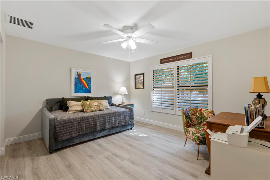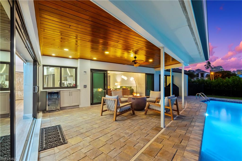 Experience coastal living in this beautifully renovated, move in ready, single-story home located in the highly sought after Park Shore community. The split plan, 4 bedroom, 3 bath home offers 2831 S.F. of living area featuring a large open kitchen with luxurious Taj White Venato Quartzite leathered countertops complete with a walk in pantry, a large center island, a wine bar and dual temperature wine refrigerator and a hidden coffee/ microwave nook. A dedicated laundry room and custom closets throughout provide plenty of storage. The oversized primary suite with direct access to the lanai and pool is enhanced with spacious his and her walk in closets and master bath offering a relaxing retreat. Both the family room and living room have pocketing sliding glass doors to create a seamless transition to the outdoor lanai overlooking the pool and lushly landscaped fenced in yard, ideal for indoor/outdoor entertaining. Perfectly positioned within walking distance to Venetian Village, Waterside Shops, the new 2 story Publix and the exclusive private beach for Park Shore residents.