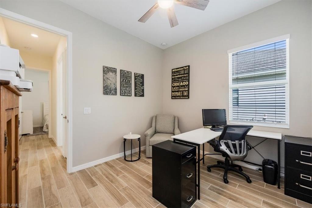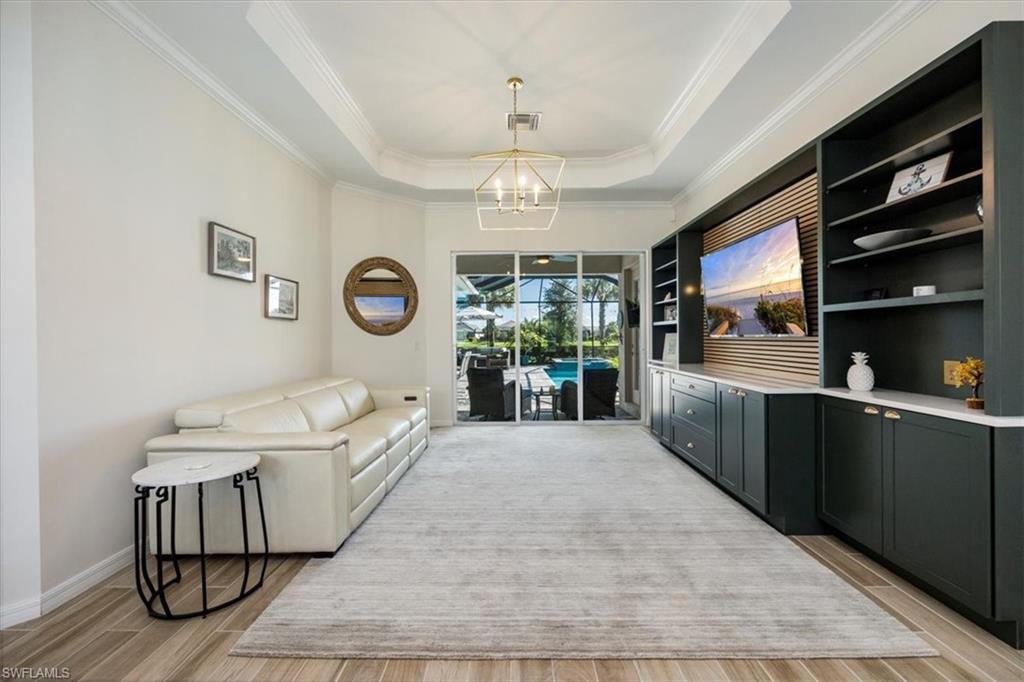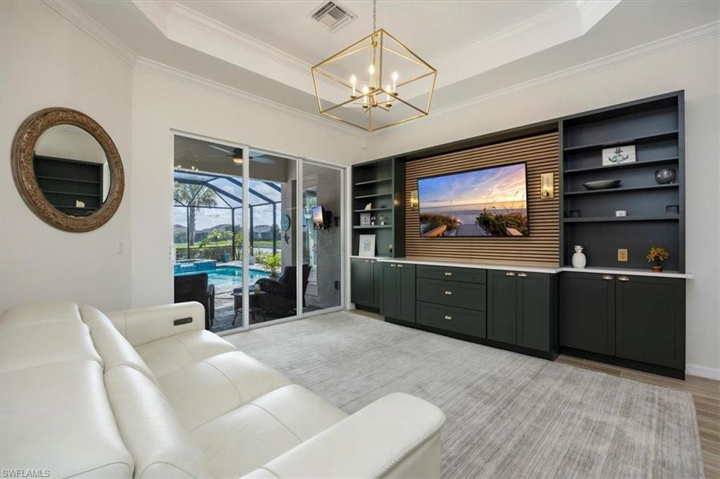 The National Golf & Country Club – Toscana Model by Lennar. Beautiful 4-bedroom, 3-bath estate home with 2,542 sq. ft. under air, 3-car garage, and a premium cul-de-sac location offering stunning lake and golf course views. Open-concept living with gourmet kitchen featuring quartz countertops, stainless-steel appliances, custom backsplash, and a large 6-person island. Elegant living room includes a custom built-in dry bar/entertainment center with marble counters, custom cabinetry, sconce lighting, and an included big-screen TV. Spacious primary suite with lanai access, custom closet shelving, soaking tub, walk-in shower, dual vanities, and private water closet. Guest wing includes a private suite with its own bath and lanai access. Enjoy resort-style outdoor living on the screened lanai featuring a heated pool with jacuzzi, outdoor kitchen with grill, fridge, and hood vent, and multiple seating areas overlooking the 11th fairway. Additional highlights include crown molding, custom bamboo accent wall, and luxury vinyl plank flooring in the garage with built-in storage. Located in The National Golf & Country Club, a gated community with 24/7 security, this home includes full golf and social memberships with access to a private championship golf course (fully private in 2026), resort pool, fitness center, spa, fine dining, tennis, pickleball, and more — all within the award-winning town of Ave Maria.