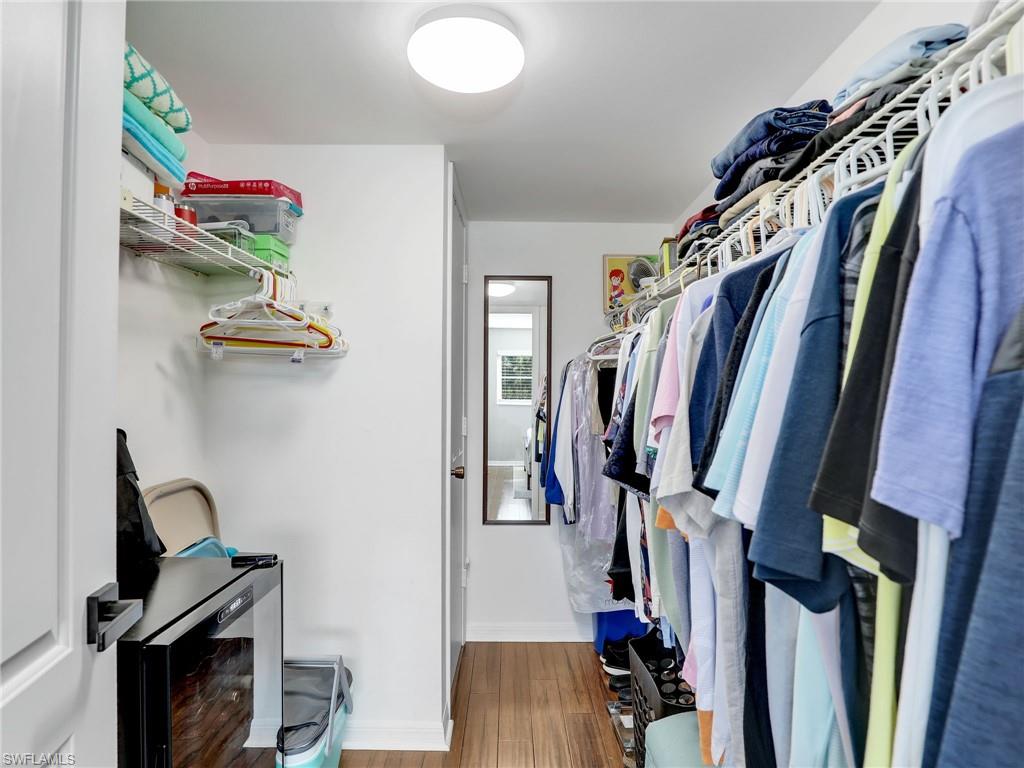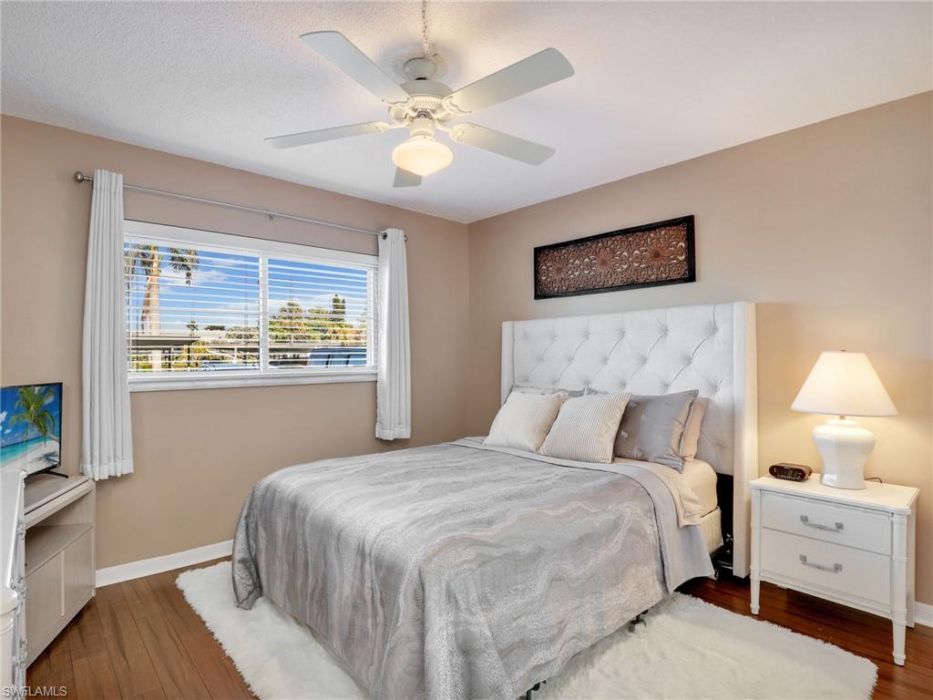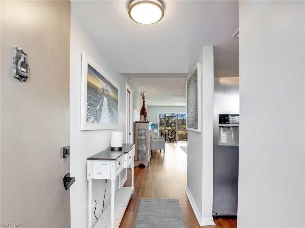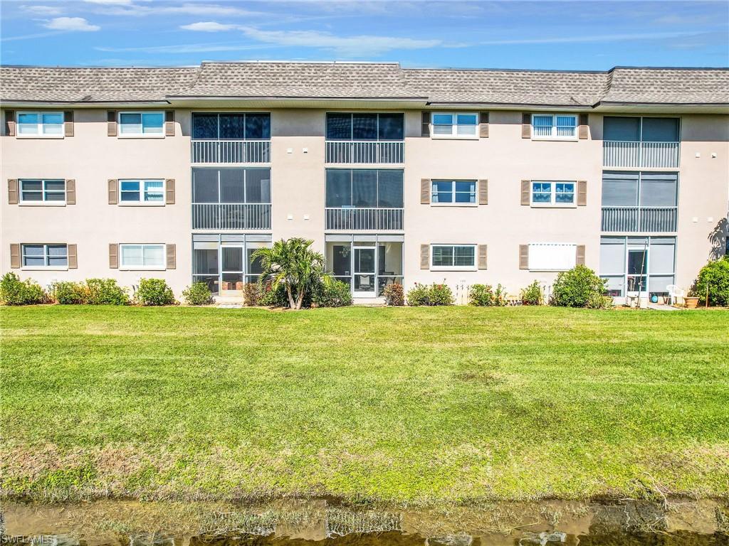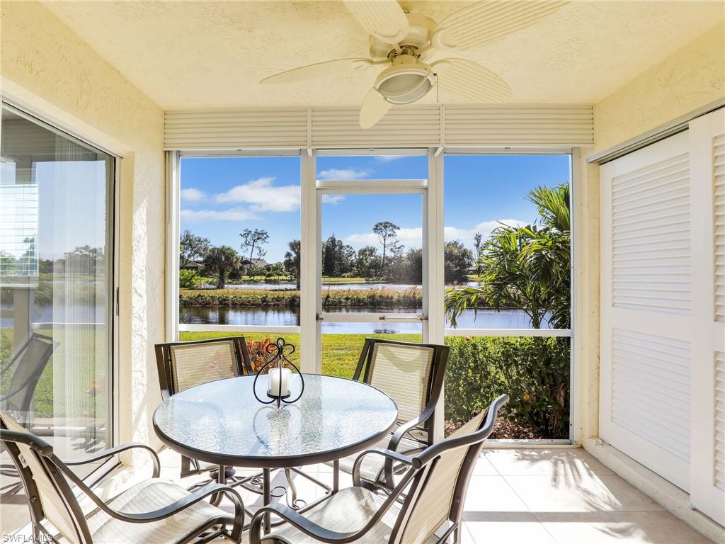 55+ Community. Tucked within the peaceful and highly sought-after Country Club Manor in Naples, Florida, this turnkey, fully upgraded 2-bedroom, 2-bathroom first-floor condo offers both comfort and style, complemented by a serene water view. Every aspect of this residence has been carefully updated to create a warm, welcoming environment perfect for both relaxation and entertaining. Step inside to find beautiful hardwood flooring (2021) that flows throughout the open living spaces. The entire home was freshly painted in 2022, showcasing a custom mural by a local artist in the living room and a modern color palette that highlights the natural light streaming through hurricane-impact windows (2019). A new storm/screen door (2023) adds convenience and curb appeal. The kitchen, remodeled in 2018, features maple cabinetry, granite countertops, and a ceramic tile backsplash, offering a stylish and functional space for the home chef. The tray ceiling with crown molding and mood lighting (2022) elevates the room’s charm, while new recessed lighting brightens every corner. Both bathrooms were tastefully remodeled in 2022, showcasing premium tile, quartz countertops, and modern finishes. The primary bath offers a spa-like retreat with frameless glass doors, a Hansgrohe handheld showerhead, and a sleek vanity, while the guest bath features a rain shower head, Hansgrohe fixtures, and Kohler comfort-height toilets in both bathrooms for added comfort. The lanai, redesigned in 2022, is another highlight—featuring new vinyl doors, cabinetry, and a bar area with a quartz countertop, perfect for enjoying morning coffee or hosting guests while taking in the tranquil water views. Hurricane shutters (2019) add an extra layer of security and peace of mind. Additional improvements include a new A/C unit (2021) with a pre-paid maintenance plan, a new water heater (2021), updated lighting fixtures and outlets (2022), and modern two-panel doors with upgraded hardware throughout. This condo also includes covered parking and an unbeatable location less than 5 miles from Fifth Avenue and Downtown Naples, putting world-class dining, boutique shopping, cultural attractions, and pristine Gulf beaches all within easy reach