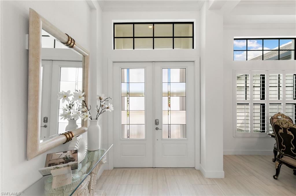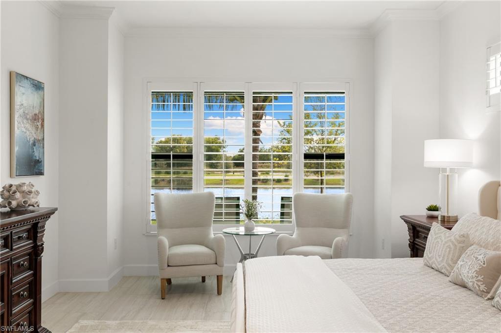 Nestled on a peaceful cul-de-sac within the exclusive Marsh Cove community, this beautifully appointed 4-bedroom, 3.5-bath home combines refined design, soaring ceilings, and a sprawling open concept floor plan. Located just down the street from the stunning Fiddler’s Creek Golf Course Clubhouse, this residence offers outstanding convenience and prime southeastern exposure. Step through glass-paned French doors, which open into an expansive great room with airy tray ceilings, crown molding, and wide-plank tile flooring throughout. Enjoy cooking and entertaining in a stunning gourmet kitchen featuring sleek stainless steel appliances, a French-door refrigerator, gas cooktop, and double wall oven. The quartzite countertops and spacious island offer ample workspace and a perfect gathering spot for family and friends. The walk-in pantry provides excellent storage, while the eat-in kitchen and separate formal dining area create the ideal blend of casual and elegant dining options. The luxurious primary suite, featuring accent windows that flood the space with natural light, is further complemented by plantation shutters and a captivating water view. An in-suite sitting area allows for space to read or reflect, and a private exterior door provides access to your lanai. The suite is enhanced by two walk-in closets and a spa-like bath featuring dual sinks, a dedicated make up vanity, a dual-shower head walk-in shower, and an sophisticated stand-alone tub. Step out towards the serene lake views and onto your screened-in lanai, which is grounded by chic, grey travertine that perfectly frames the dazzling aqua of the salt water pool, zero-edge spa, and sun shelf. An outdoor kitchen, lounge area, and outdoor dining space offer optimal seating and an array of ways to entertain, while the stately colonnades draw your eyes upward toward the beautiful Florida sky. Lower the automatic storm screens for privacy or protection, ensuring that nothing disrupts your peace. Additional highlights include an impressive 3 car garage, plantation shutters and impact doors and windows throughout, a 26KW whole-home generator, tankless water heater, pool bath, mudroom with storage bench, and a three-car garage with epoxy flooring. The award-winning, resort style community of Fiddler's Creek is enhanced by a club and spa, fitness center, swimming pools, two golf courses, tennis courts, pickleball courts, a bocce court, fine and casual dining, social activities, and miles of biking and walking paths. Optional beach club and marina memberships are available. Experience the epitome of luxury living, where every detail is thoughtfully curated to complement your lifestyle.