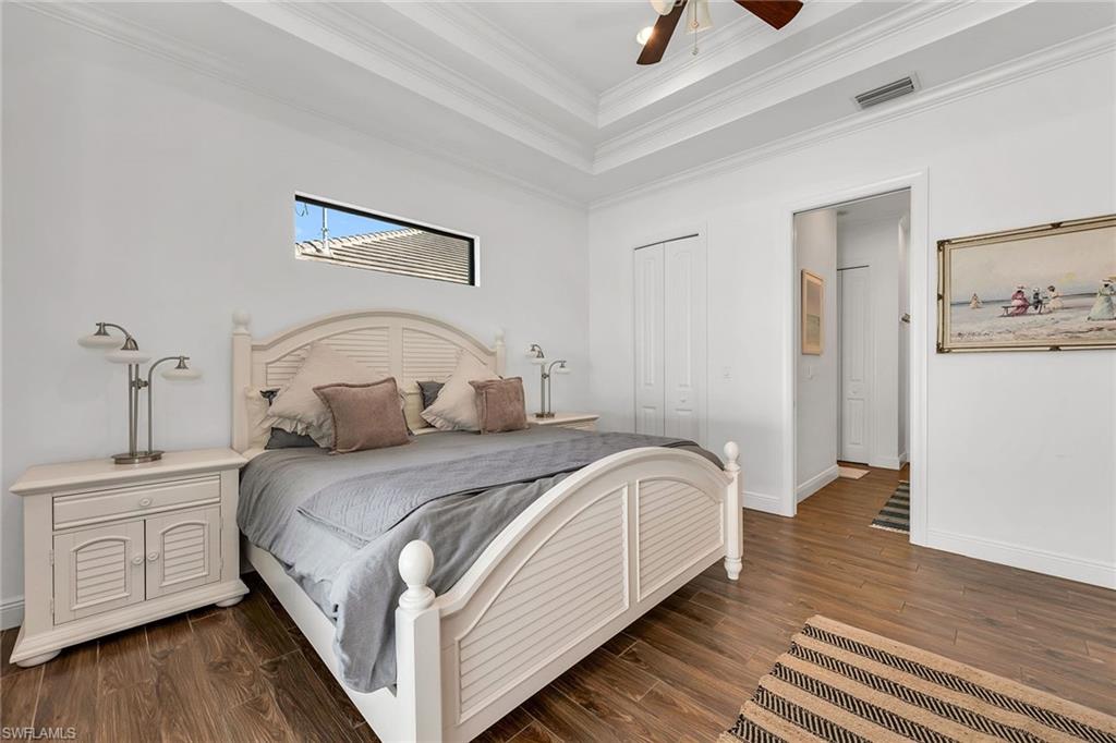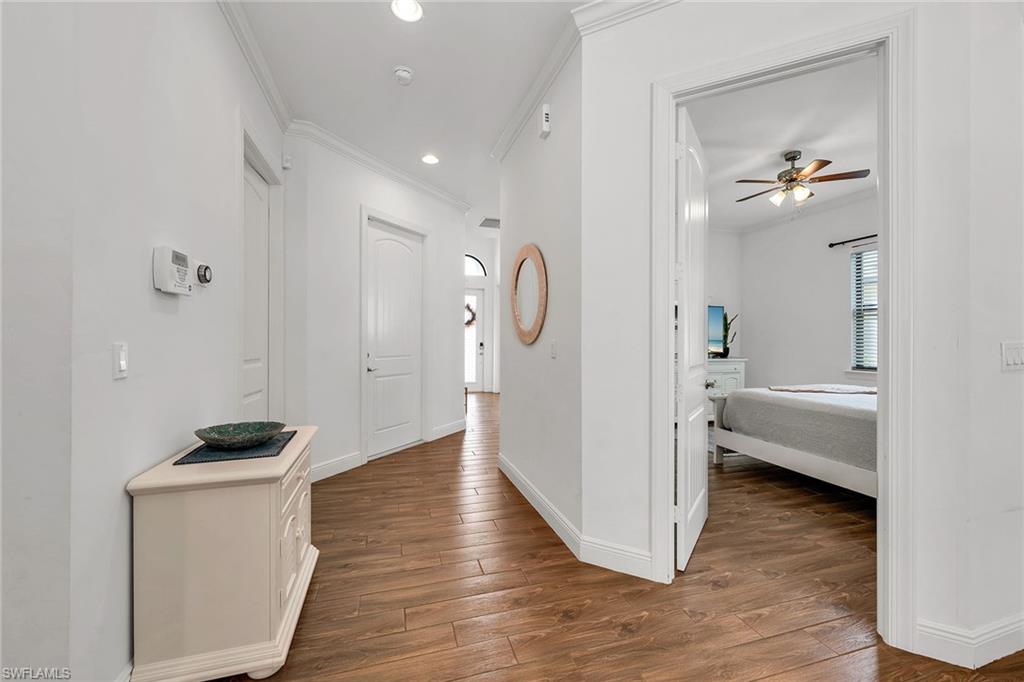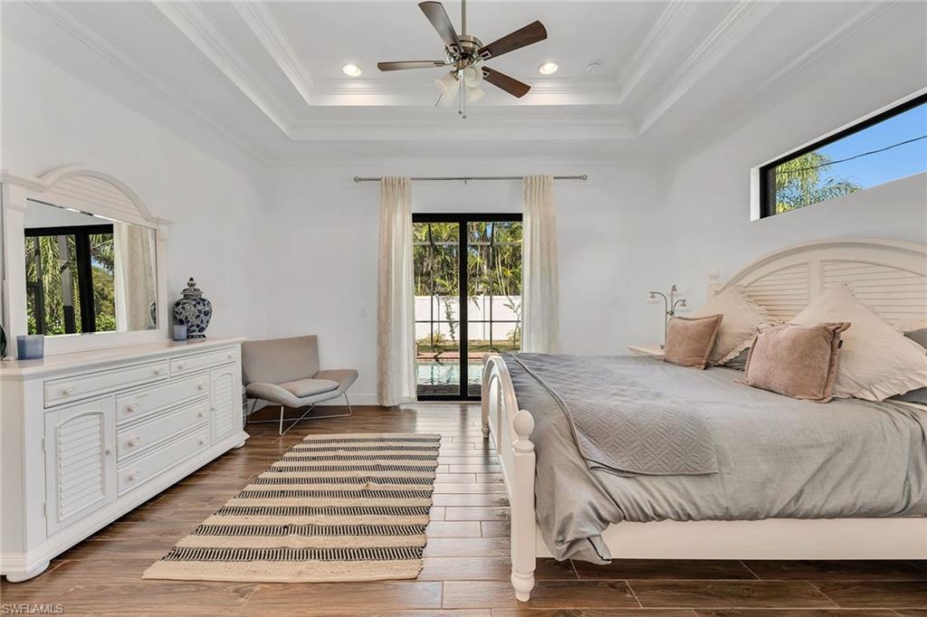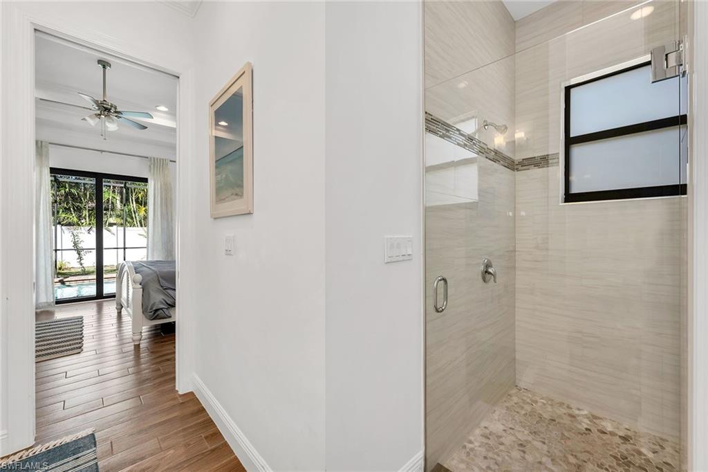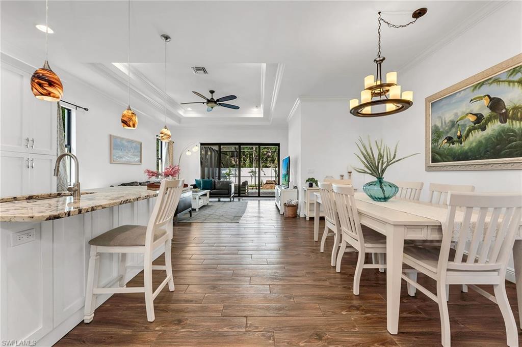 Experience modern coastal living in this beautifully updated home in sought-after Naples Park, ideally just minutes from Vanderbilt Beach and Delnor-Wiggins Pass State Park. This stylish three-bedroom plus den, three-bath residence with a two-car garage offers a blend of contemporary design, luxurious comfort and exceptional outdoor living, ideal as a primary residence, vacation retreat or high-income investment property. The private backyard oasis is highlighted by a heated saltwater pool with a waterfall feature, surrounded by brick paver flooring, a white privacy fence and lush tropical landscaping. The screened lanai provides covered outdoor living with a modern ceiling fan and recessed lighting, complemented by an outdoor shower, ideal for relaxing after a day at the beach. A newer pool heater and pump (2021) ensure year-round enjoyment. Full storm protection includes impact-resistant doors, windows, and garage door for peace of mind. Inside, refined finishes and an open-concept layout showcase wood-look porcelain tile flooring throughout, volume ceilings, crown molding and recessed lighting. The modern kitchen is a centerpiece, featuring sleek white cabinetry with abundant storage, a large island with a breakfast bar and pendant lighting, granite countertops and striking mosaic tile backsplash. Premium stainless steel appliances include a new range, new microwave, dishwasher and refrigerator with an icemaker. The adjacent formal dining area flows seamlessly into the living room, where glass sliders open to the lanai and pool area. The owner’s suite is a serene retreat with a tray ceiling accented by crown molding, private lanai access, two walk-in closets, and a spa-like bath with dual vanities topped in granite, a full-width mirror, and a walk-in shower with a frameless glass enclosure, tile to the ceiling and a privacy transom window. The first guest bedroom features its own en-suite bath with a walk-in shower, granite vanity and tile finishes, also accessible from the hallway. The second guest bedroom is adjacent to a full bath with a shower-tub combo enclosed in glass, floor-to-ceiling tile, a privacy window and a granite vanity. The den, accessed through double doors, is ideal for a home office, study, or additional bedroom. Additional highlights include a laundry room with a washer, dryer, utility sink with a granite countertop and overhead cabinetry for storage. With its modern finishes, thoughtful layout and unbeatable proximity to Naples finest beaches, dining and shopping, this home offers the best of Florida living and outstanding investment potential, all without HOA restrictions.