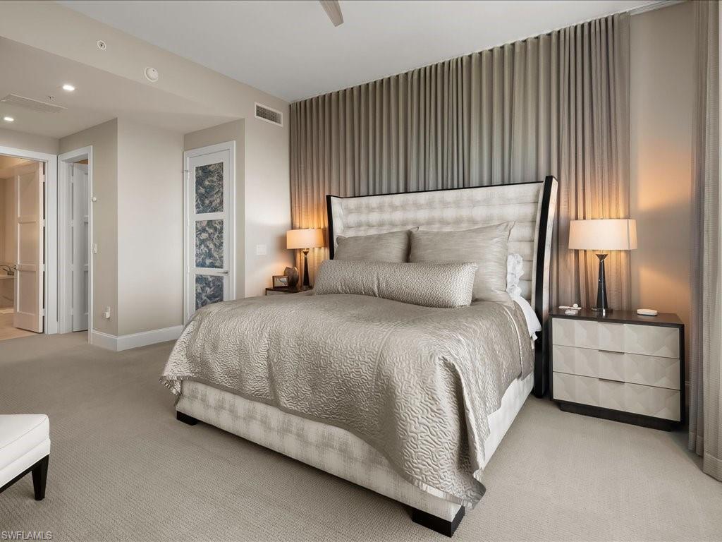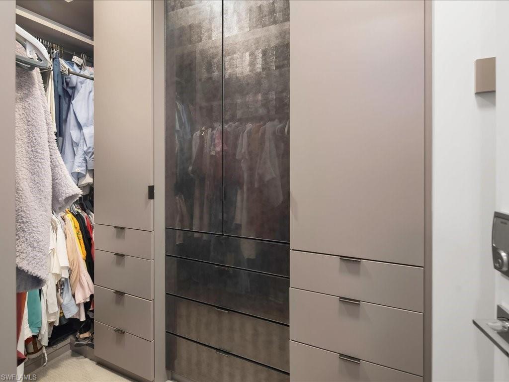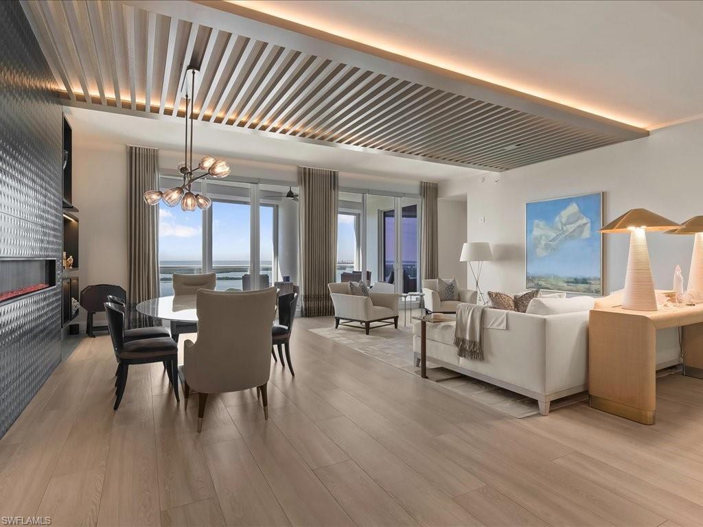 Welcome to Seaglass sky residence 2103! Situated on the 21st floor of the luxurious Seaglass tower, this impressive home conveys with stunning high-end custom finishes including custom floating ceiling by Woodworkers Of Naples, custom rift oak art boxes, custom designed electric fireplace, tasteful lighting fixtures, motorized shades and window treatments, custom closets, and newly installed glass railing on the main, west-facing balcony - complete with world-class views of Estero Bay and the Gulf of America! This generously-sized 3 Bedroom + Den/3.5 Bath floor plan has almost 3100 feet under air, featuring a gorgeous master bedroom retreat with an oversized shower and large soaking tub and extra custom cabinetry. Each of the secondary bedrooms enjoy en-suite baths for the ultimate guest experience, complete with their very own east-facing lanai. Bonita Bay enjoys its status as one of a small handful of truly world-class, amenity-rich gated communities in the Bonita Springs/Naples' market, and includes access to the Bonita Bay Club with its 5 golf courses, private beach club, 12 miles of walking trails and bike paths, full-service marina and restaurant, tennis, pickleball, full service fitness center complete with spa, and so many other activities to choose from. Bonita Bay is located just a short drive to RSW Internation Airport, world-class dining and shopping, and downtown Naples. Discover your destination today!