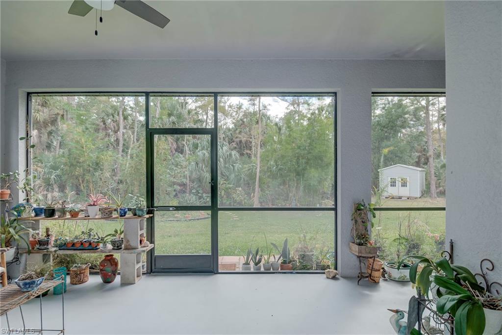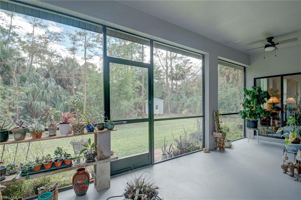 An absolute gem—priced below its recent appraisal (10/2025)! Built in 2021, this 3-bedroom plus den home sits on 2.5 acres of lush, park-like land surrounded by mature trees, fruit trees, and tropical plantings that create a peaceful, natural retreat. Tucked just off Wilson Blvd, it offers a quiet and private setting while still being close to town. Step inside to an open, light-filled layout featuring glossy marble-like flooring in the main living areas and warm wood-laminate floors in the bedrooms. The beautifully designed kitchen stands out with stainless steel appliances, gorgeous quartz countertops, custom cabinetry, and plenty of workspace—perfect for cooking, gathering, or entertaining. The primary suite includes an oversized master bathroom with dual sinks, a relaxing soaking tub, a separate walk-in shower, and eye-catching custom tilework. Across the back of the home, a freshly painted screened-in lanai invites you to unwind while taking in tranquil natural views. Additional features include a storm shutters, whole-house reverse osmosis system for pristine water throughout the home. A custom-built shed is also available for purchase outside of the contract.