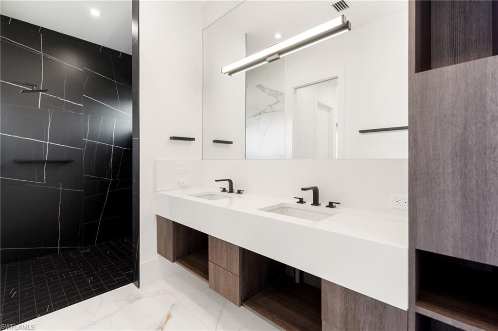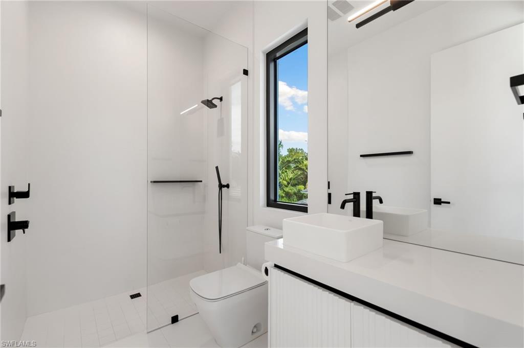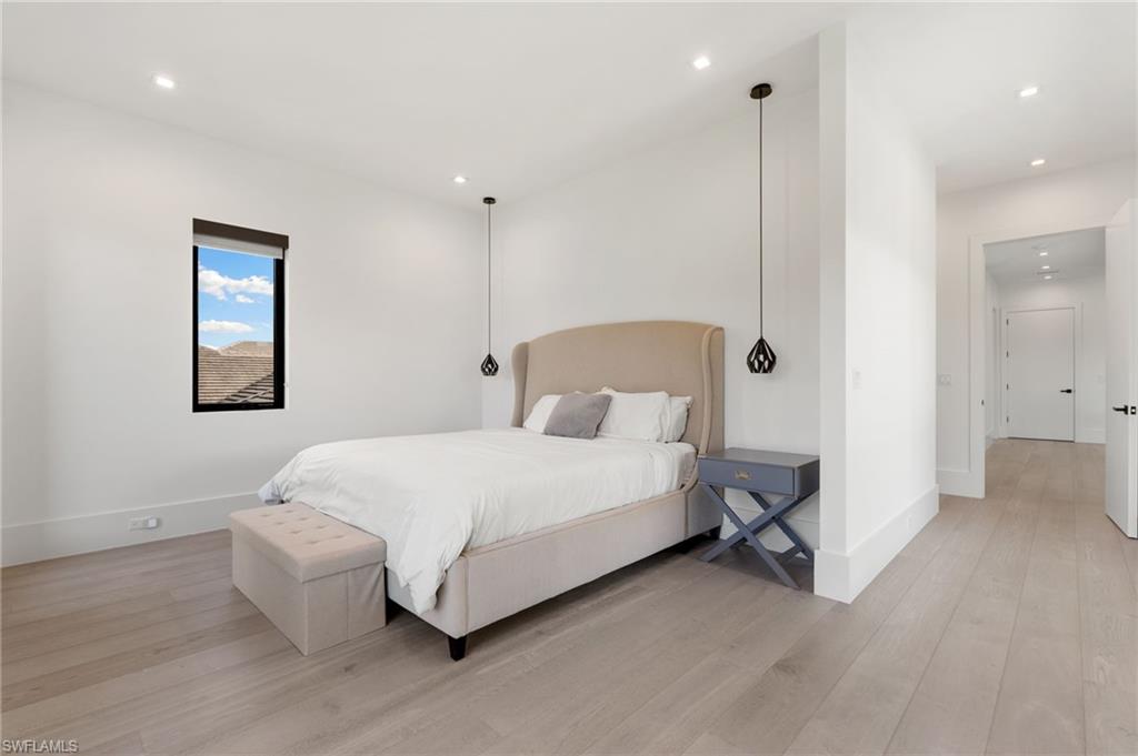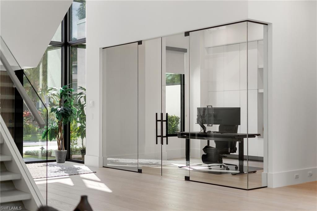 Perfectly positioned in the coveted Moorings neighborhood, this contemporary retreat masterfully balances form and function. Defined by clean architectural lines and sun-drenched interiors, the home embodies a minimalist’s ideal. Natural light pours across wide-plank oak floors, illuminating a gourmet kitchen outfitted with custom cabinetry and premium Wolf and Sub-Zero appliances—an elegant expression of understated luxury. Soaring ceilings amplify the home’s airy ambiance, while the easy flowing layout offers both privacy and flexibility. Dual primary suites—one on the main level and another upstairs—serve as serene sanctuaries, each featuring spa-inspired baths, dual walk-in closets, and convenient laundry access. Outdoors, a lush tropical backdrop framed by bamboo and a fruit-bearing mango tree sets the stage for the sleek modern pool and expansive yard—a private oasis ideal for quiet afternoons or stylish entertaining. With close proximity to downtown Naples and exclusive access to the Moorings Beach Park, this residence is the ideal full or part time residence.
